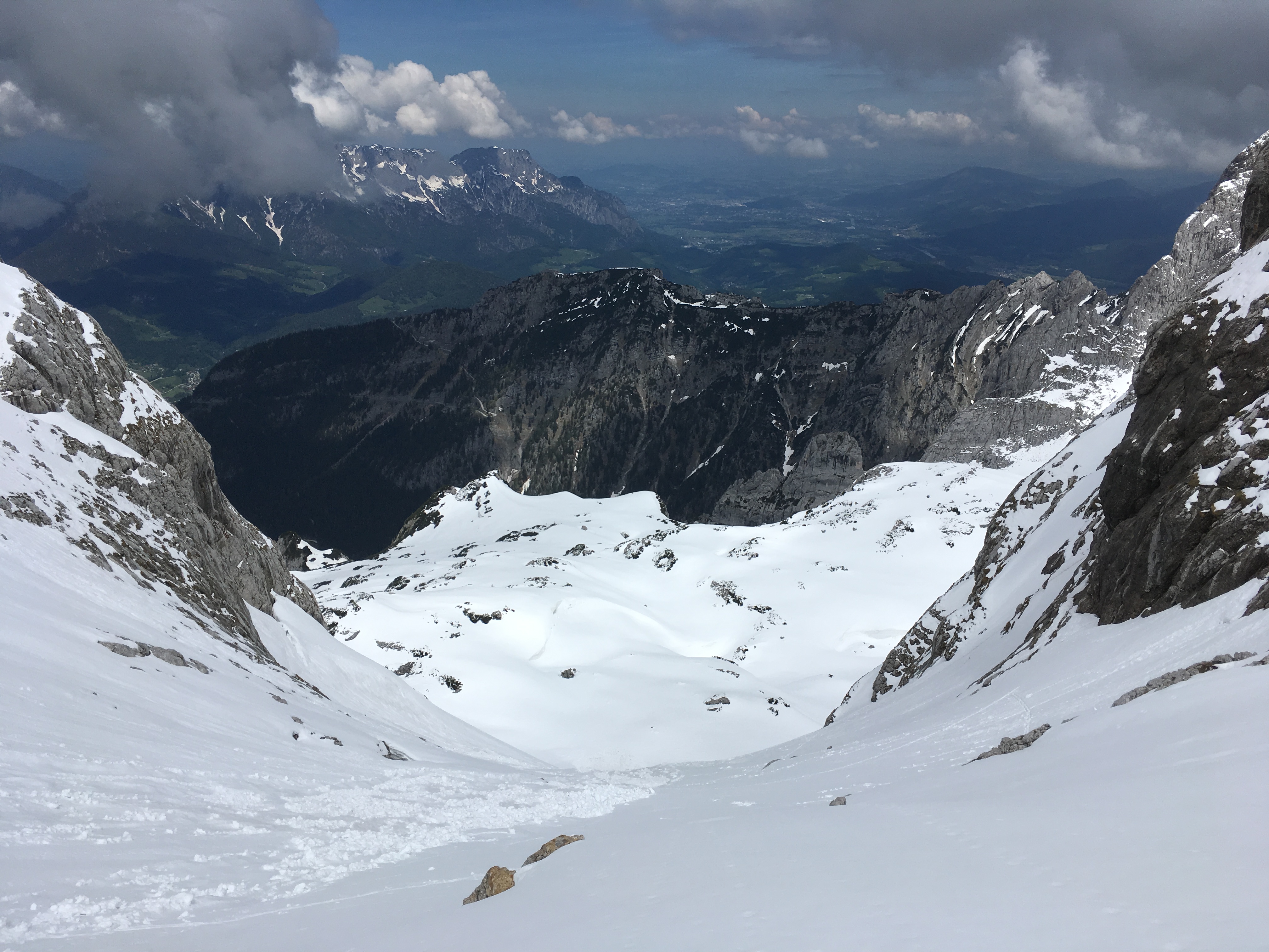 Sonstiges: Bei heute im Tal sehr warmer Witterung ging es von Hinterbrand aus auf das Hohe Brett. Sinnvoll dürfte sein, im Aufstieg die Skier bis oberhalb der ersten Steilstufe nach der Drahtseilpassage zu tragen. Hinab geht es mit einer Unterbrechung an der Abkletterstelle noch weiter. Danach ging es heute unproblematisch hoch, die Rinne zum Hohen Brett musste ich neu anspuren. Alle anderen Tourengeher waren heute zum Göll unterwegs. Am Gipfel gab es dann leider einige Wolken, die die Sicht einschränkten.