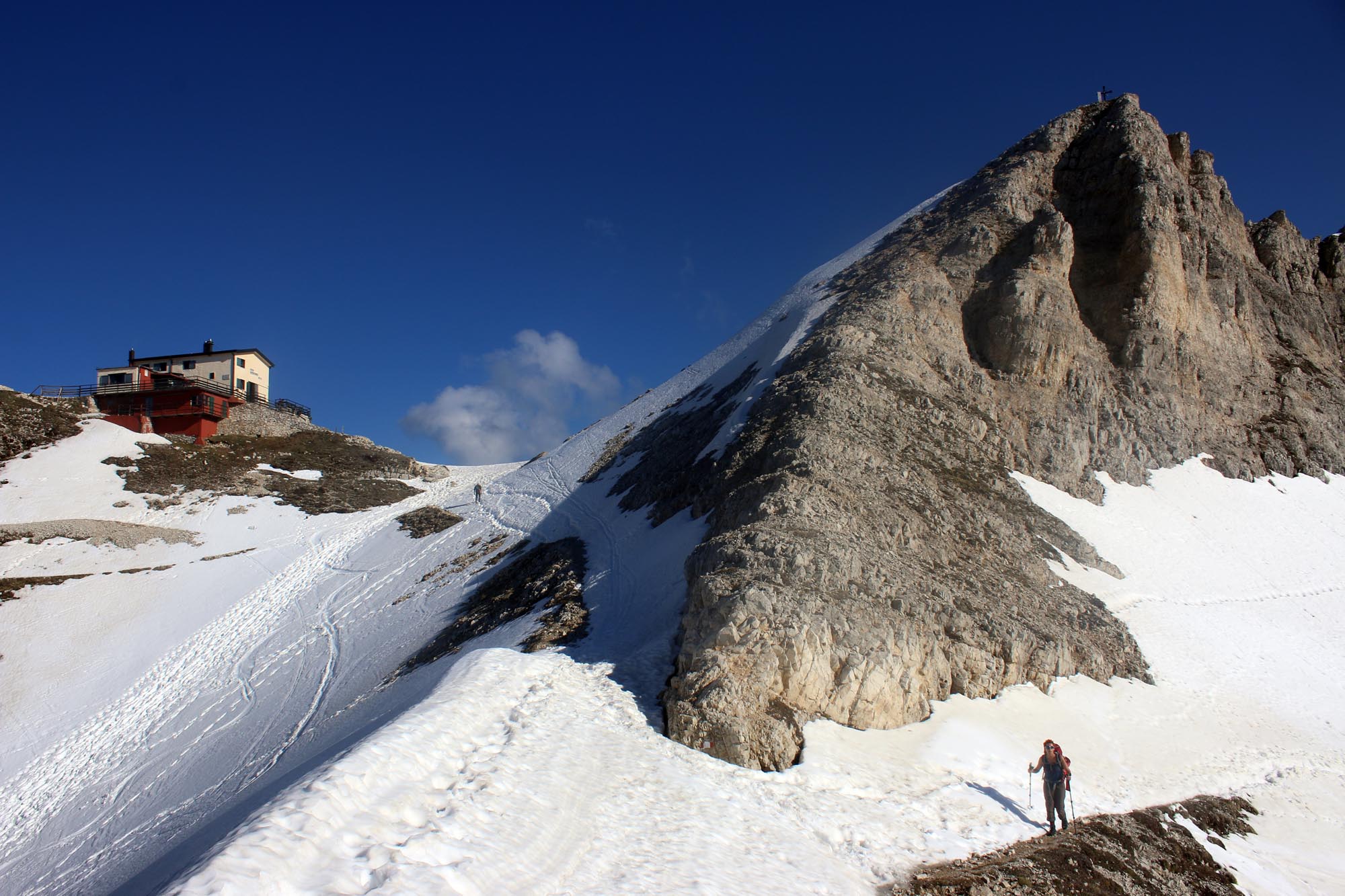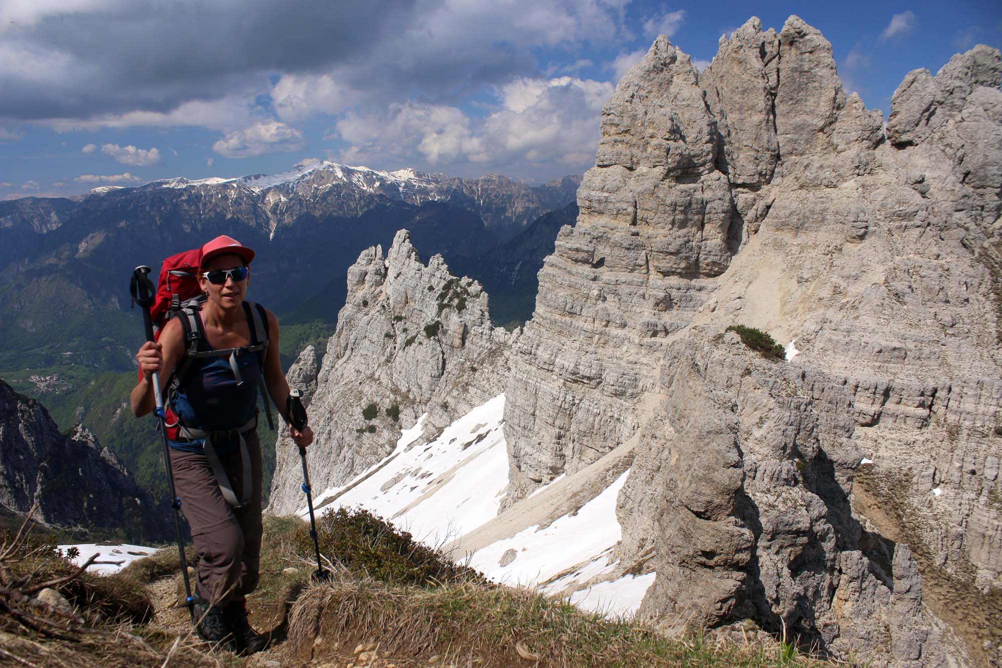 Tourenverhältnisse: Ab ca. 2000 m liegen auch südseitig noch große Altschneefelder. Der Anstieg zum Gipferücken der Cima Palon und der Rücken selbst war aber teilsschon ausgeapert. Wir übernachteten die erste Nacht in der Biwakhütte des Rifugio Achille Pap, welches wiederum am 8.6. öffnet. Der Übergang vom Rif. Papa nach Pian delle Fugazze und weiter zu Campogrosso ist so gut wie schneefrei. Beim weiteren Übergang zum Rifugio Scalorbi liegt nordseitig teils noch Schnee. Heiklere Stellen, sowie Stahlseile sind jedoch schon schneefrei.