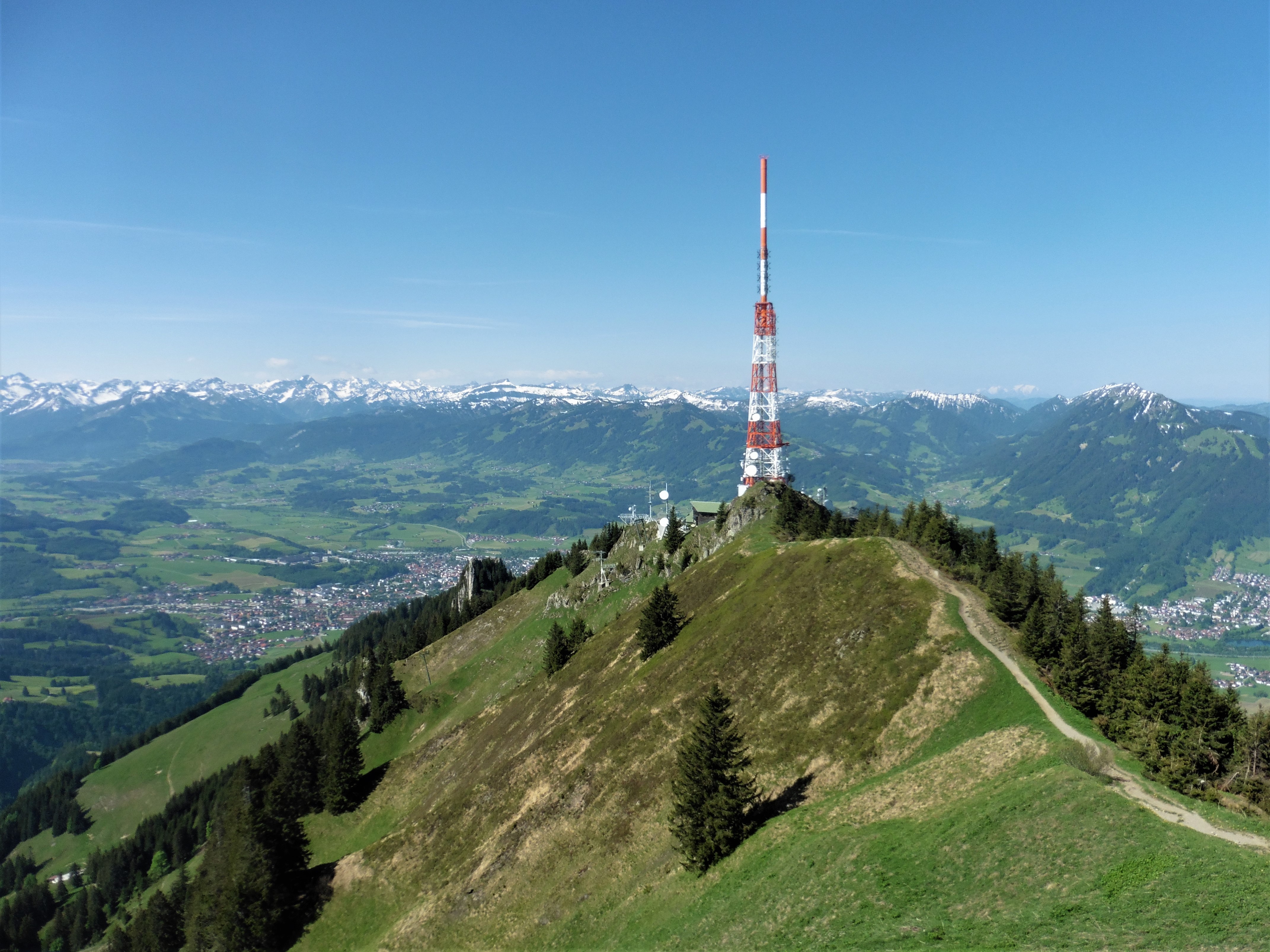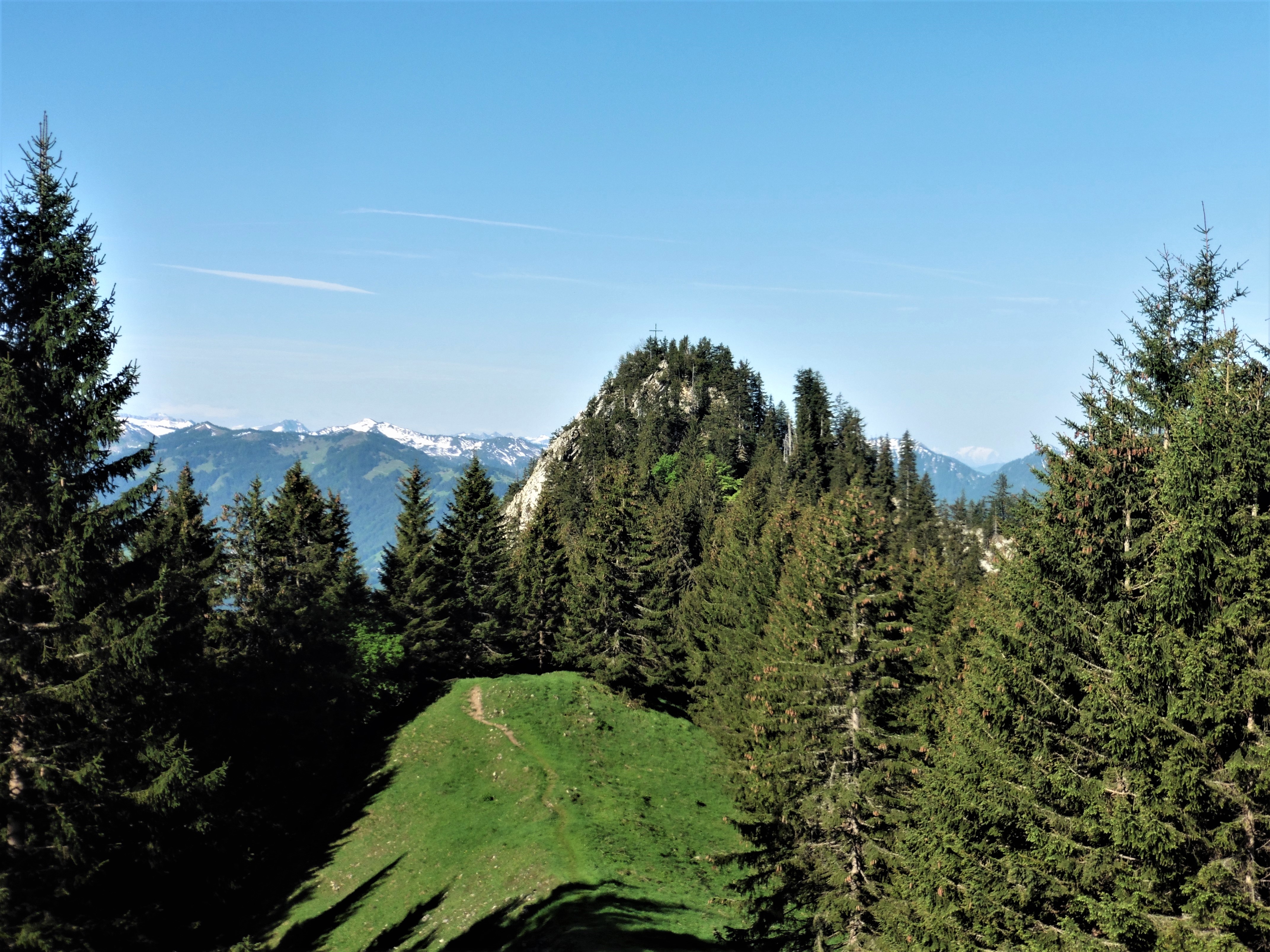 Sonstiges: vom Parkplatz an einer Kapelle vorbei, im Graben eines Baches (offiziell gesperrt wegen Zerstörung einer Brücke, -lässt sich aber gut umgehen) hinauf zur Grüntenstraße und weiter über den Funkenweg - steil und ausgesetzt - aufs Hörnle; jenseits auf den felsigen Grat bergab / versichert - und über den Siechenkopf und die Senderanlage des Bayer. Rundfunks auf Übelhorn; von dort über den Rücken steil hinunter; an einer Flachstelle nach rechts - deutlicher Pfad - und über die Südflanke des Berges hinunter ins Tal;