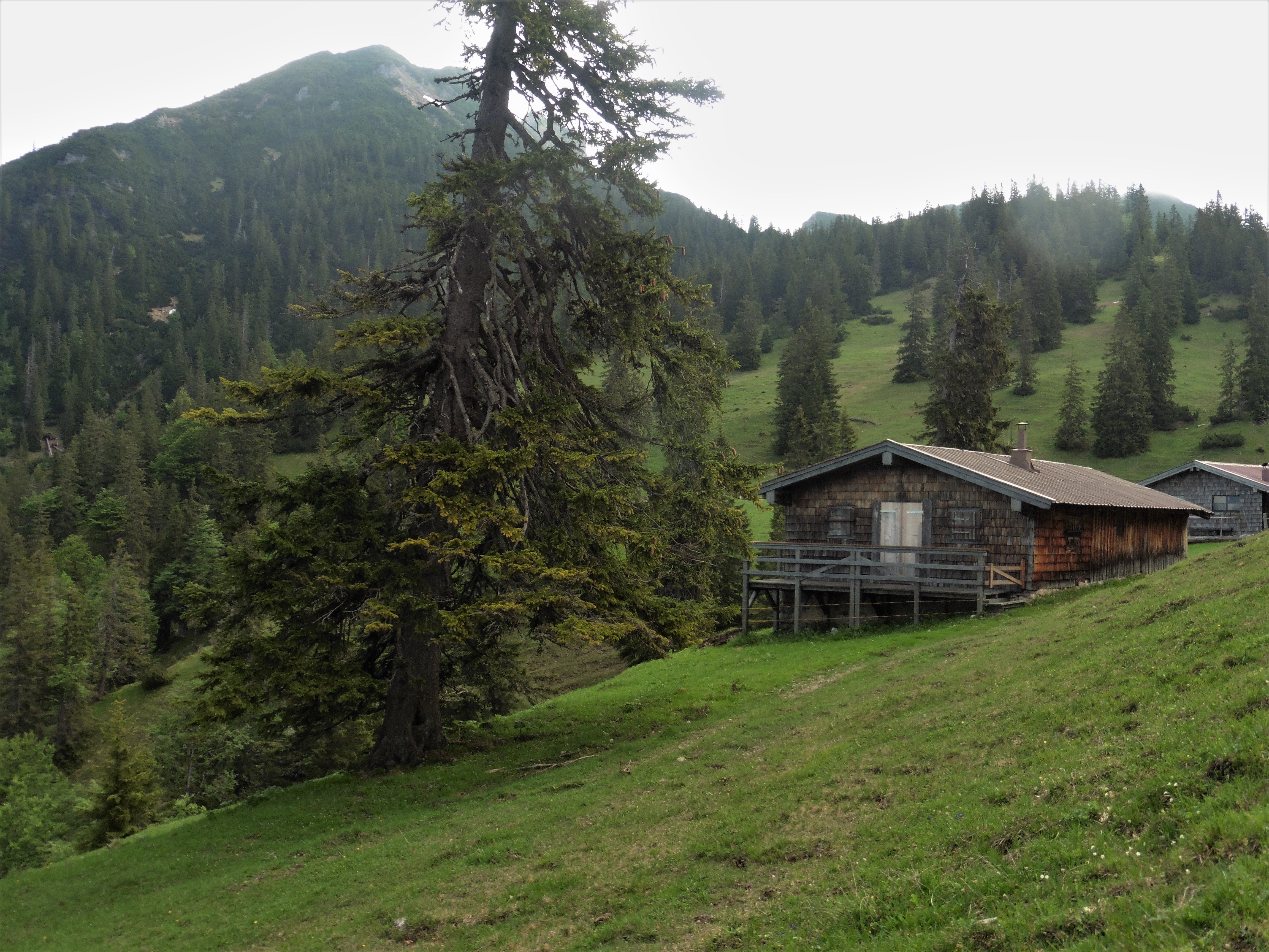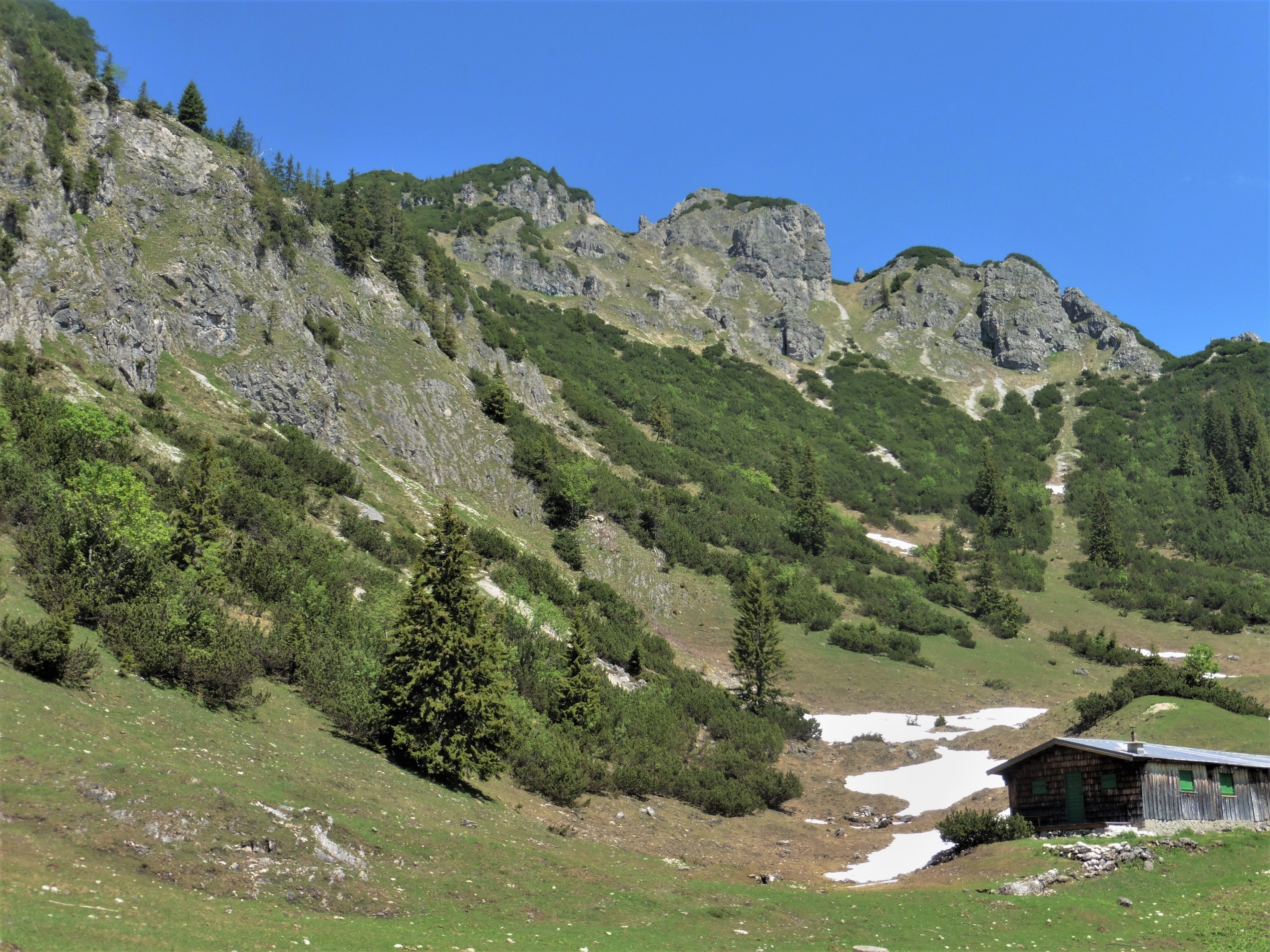 Bild 1: auf der Rieselsbergalm mit Blick zum Bayer. Schinder (unter dem Gipfel ist das im Text erwähnte Schneefeld zu sehen);