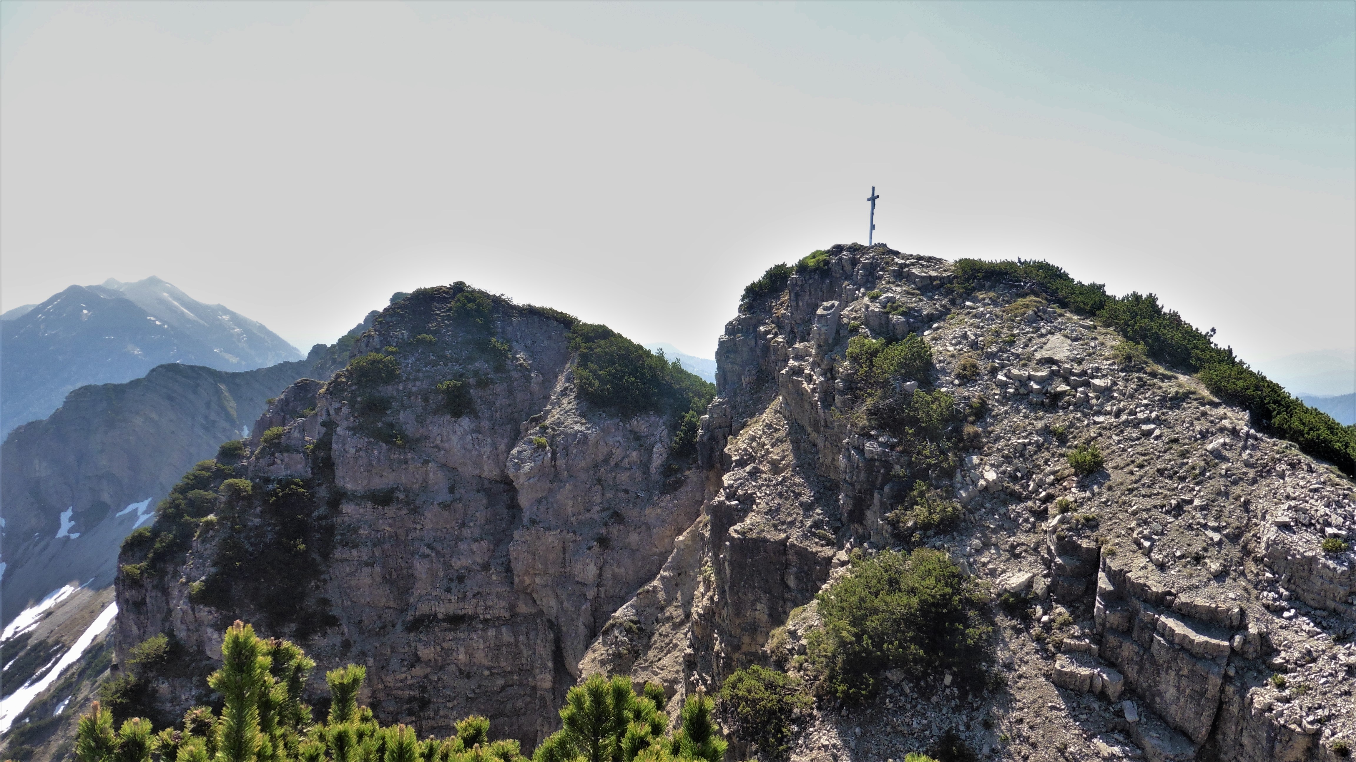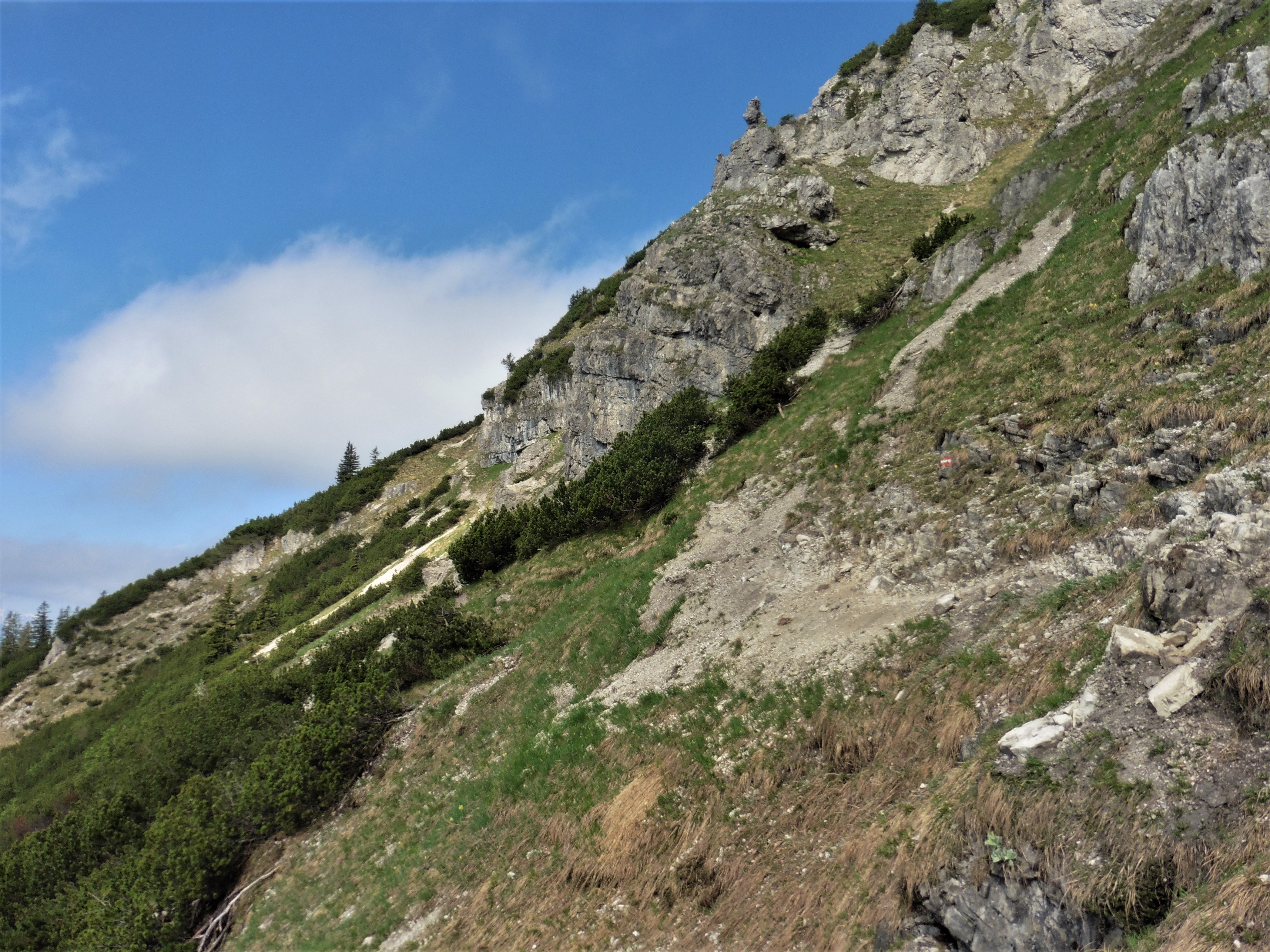 Gefahreneinschätzung: im oberen Bereich des Aufstiegs - die lange Linkquerung - sind Schwindelfreiheit und Trittsicherheit absolut notwendig; der Steig ist teilweise durch Erosion beschädigt; kurz unter dem Gipfel gibt's noch ein steiles Schneefeld (kann rechts oder links über steile Grasschrofen umgangen werden);