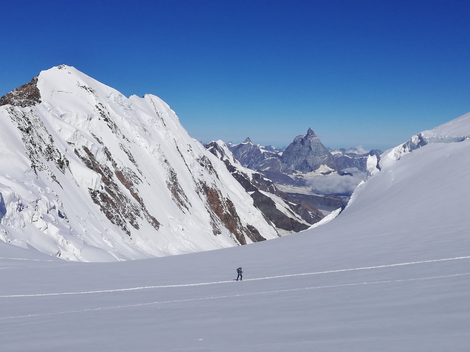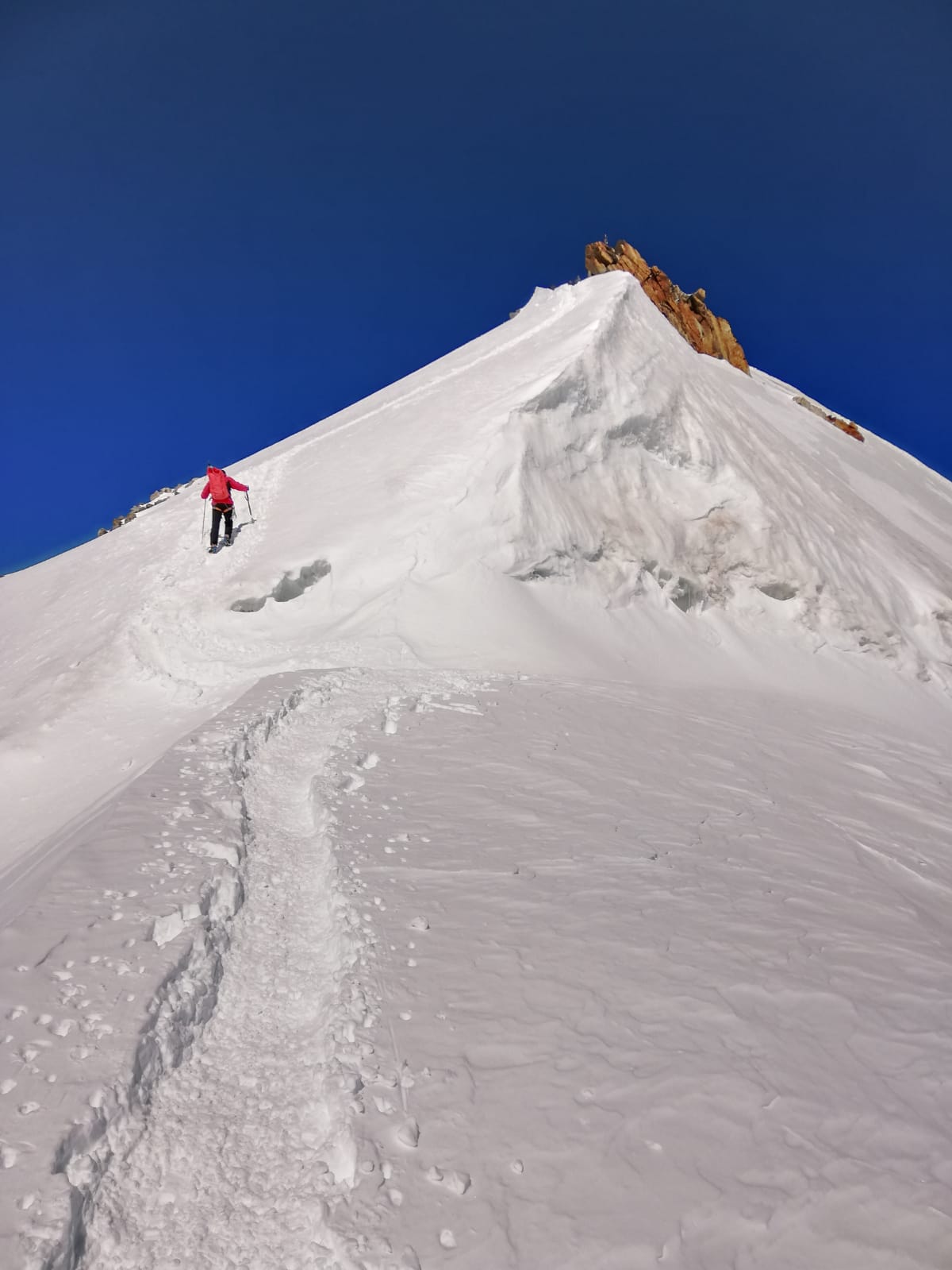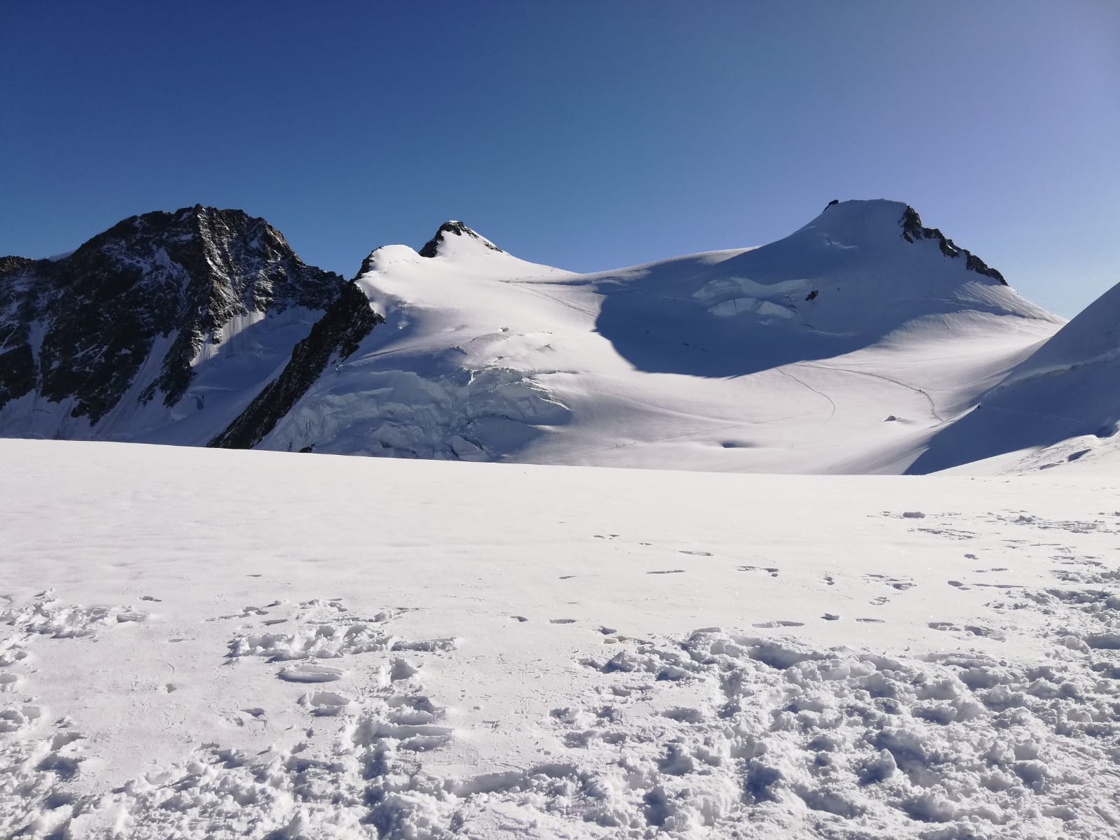 Über einen Schneegrat, zum Schluss ein paar einfache Felsen auf die Zumsteinspitze. Weiterweg zur Signalkuppe einfach auf gut eingetretener Spur, zuletzt durch einen gut 35 Grad steilen, harten Hang.
