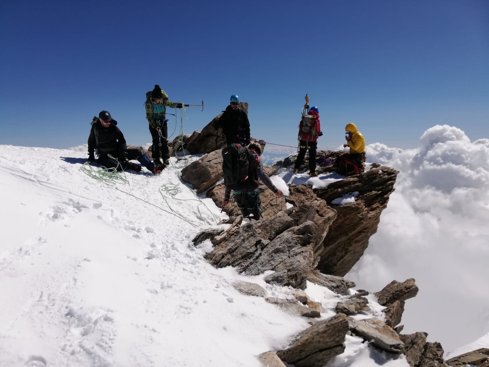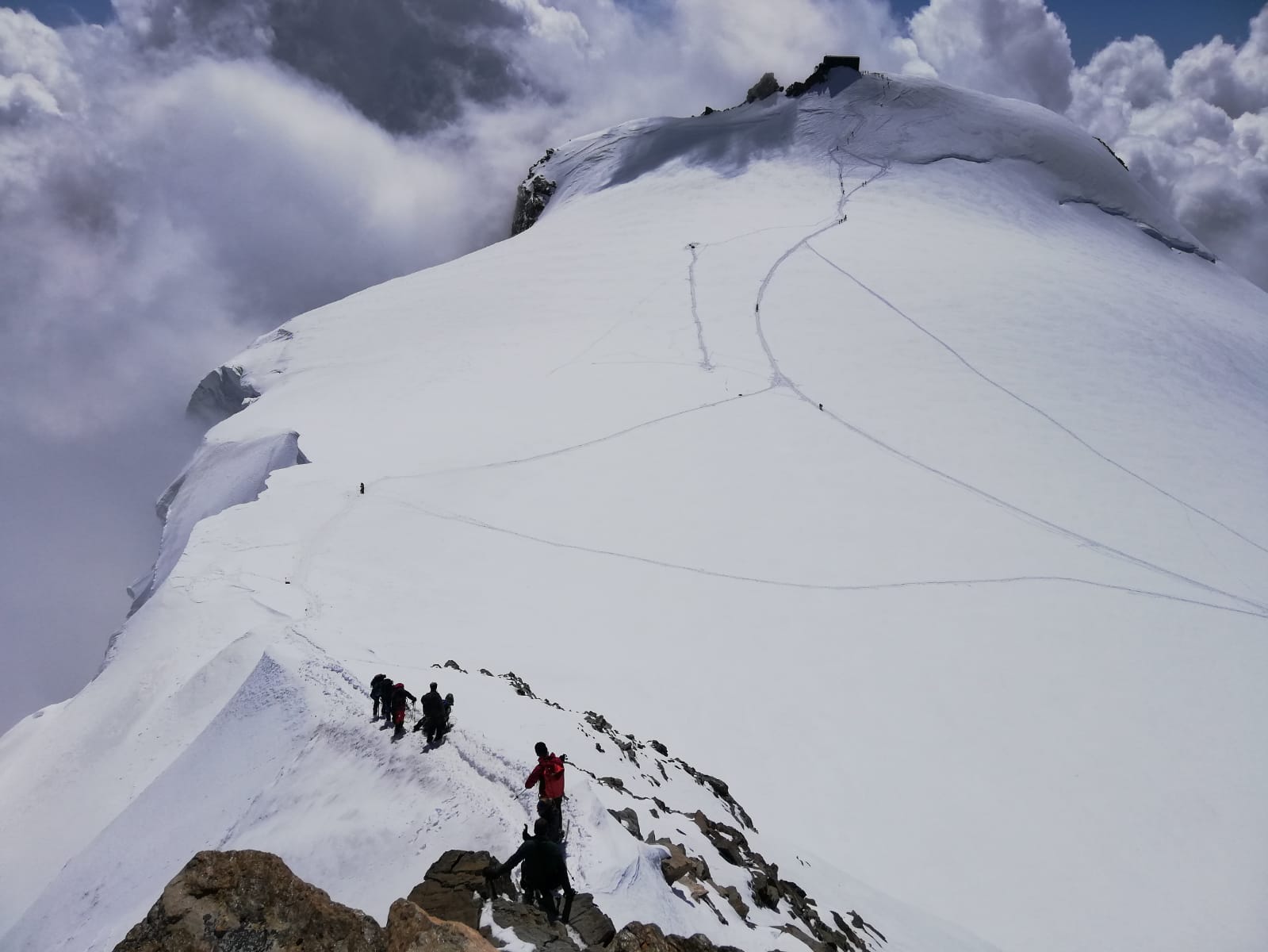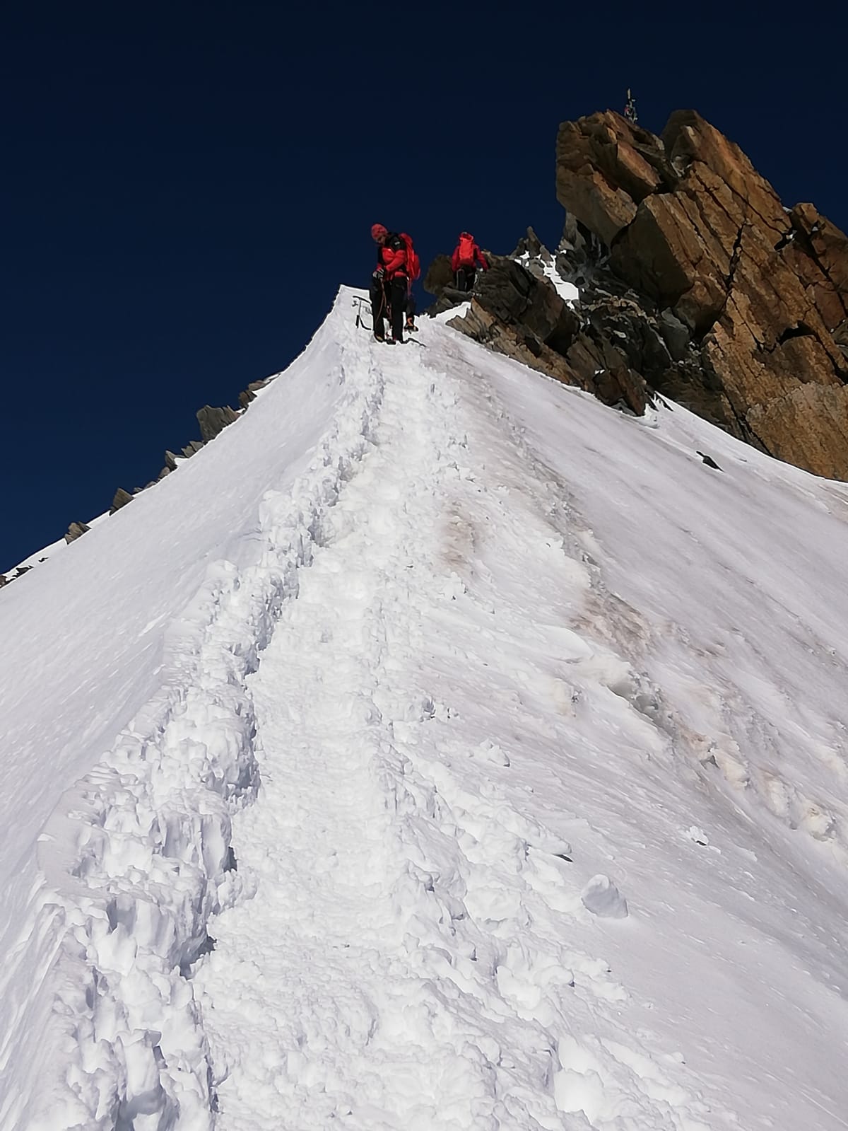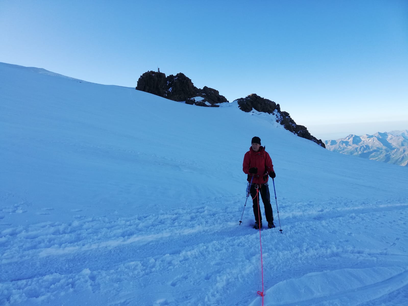 Über einen Schneegrat, zum Schluss ein paar einfache Felsen auf die Zumsteinspitze. Weiterweg zur Signalkuppe einfach auf gut eingetretener Spur, zuletzt durch einen gut 35 Grad steilen, harten Hang.