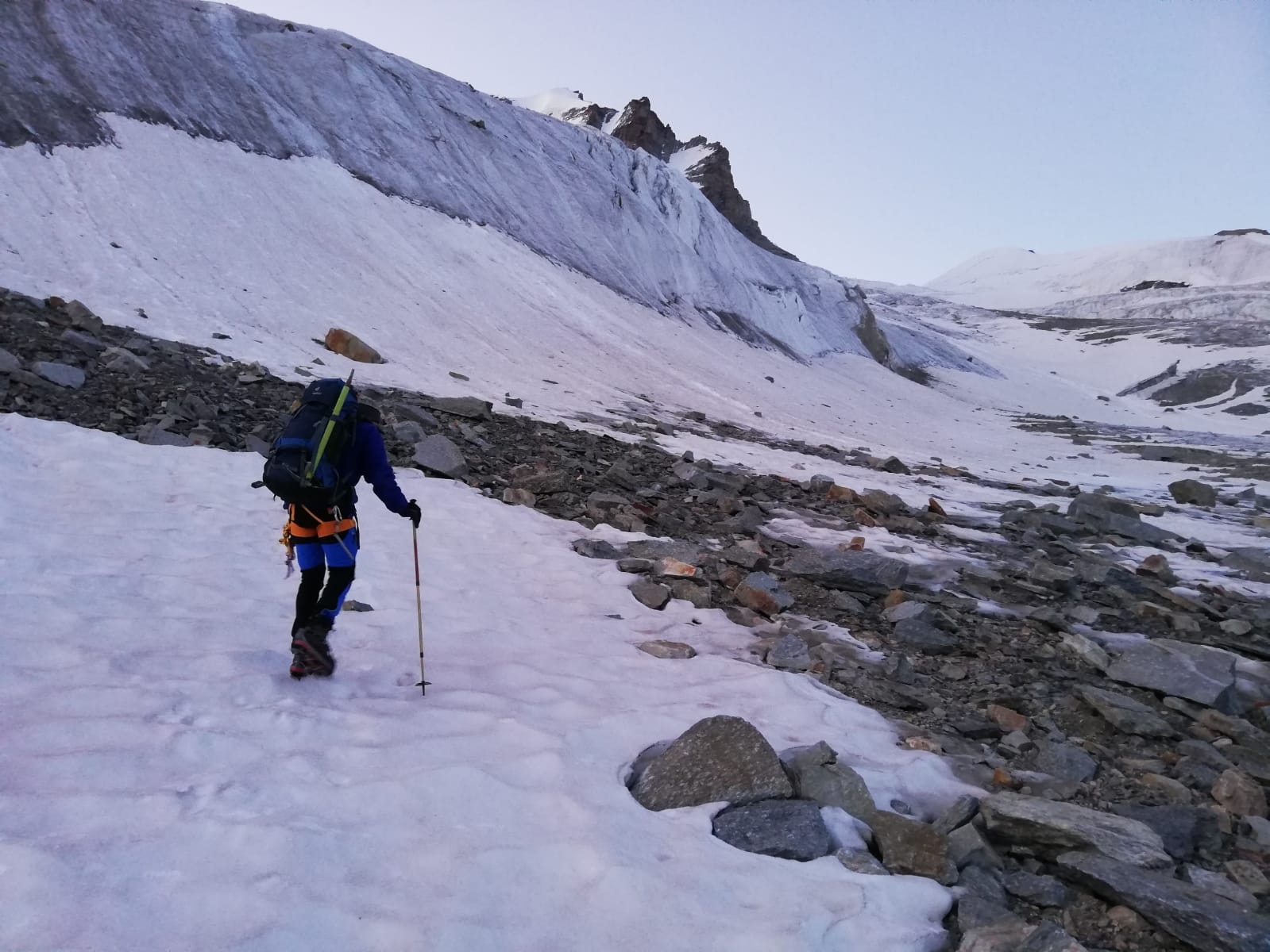 Bergab Richtung Rifugio Vittorio Emanuele kann man derzeit noch überraschend lang nach dem Gletscher auf steilen Firnfeldern absteigen/-fahren. Unmittelbar vor der Hütte noch letztes sehr blockiges Gelände (muss in der Dunkelheit recht übel sein).