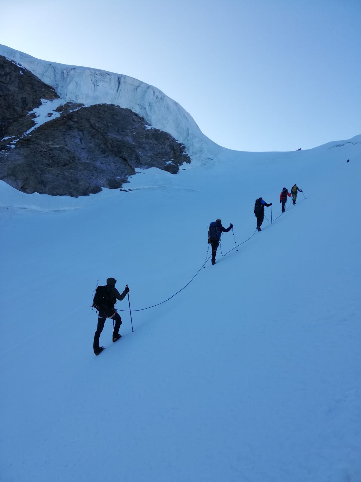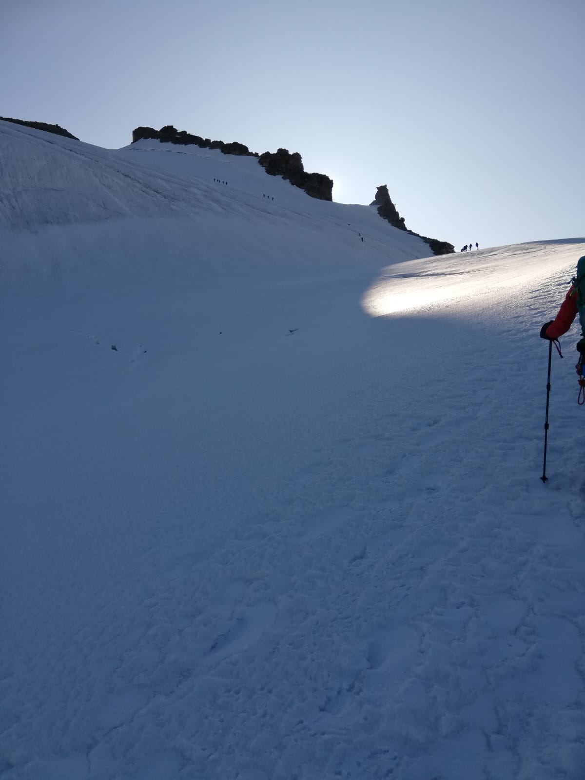 geringe Spaltensturzgefahr im Aufstieg, auf dem Abstiegsweg praktisch keine, eher noch Sturzgefahr bzw. Mitreißgefahr im oberen Teil (ca. 3900 - 4000m) des Gipfelanstiegs