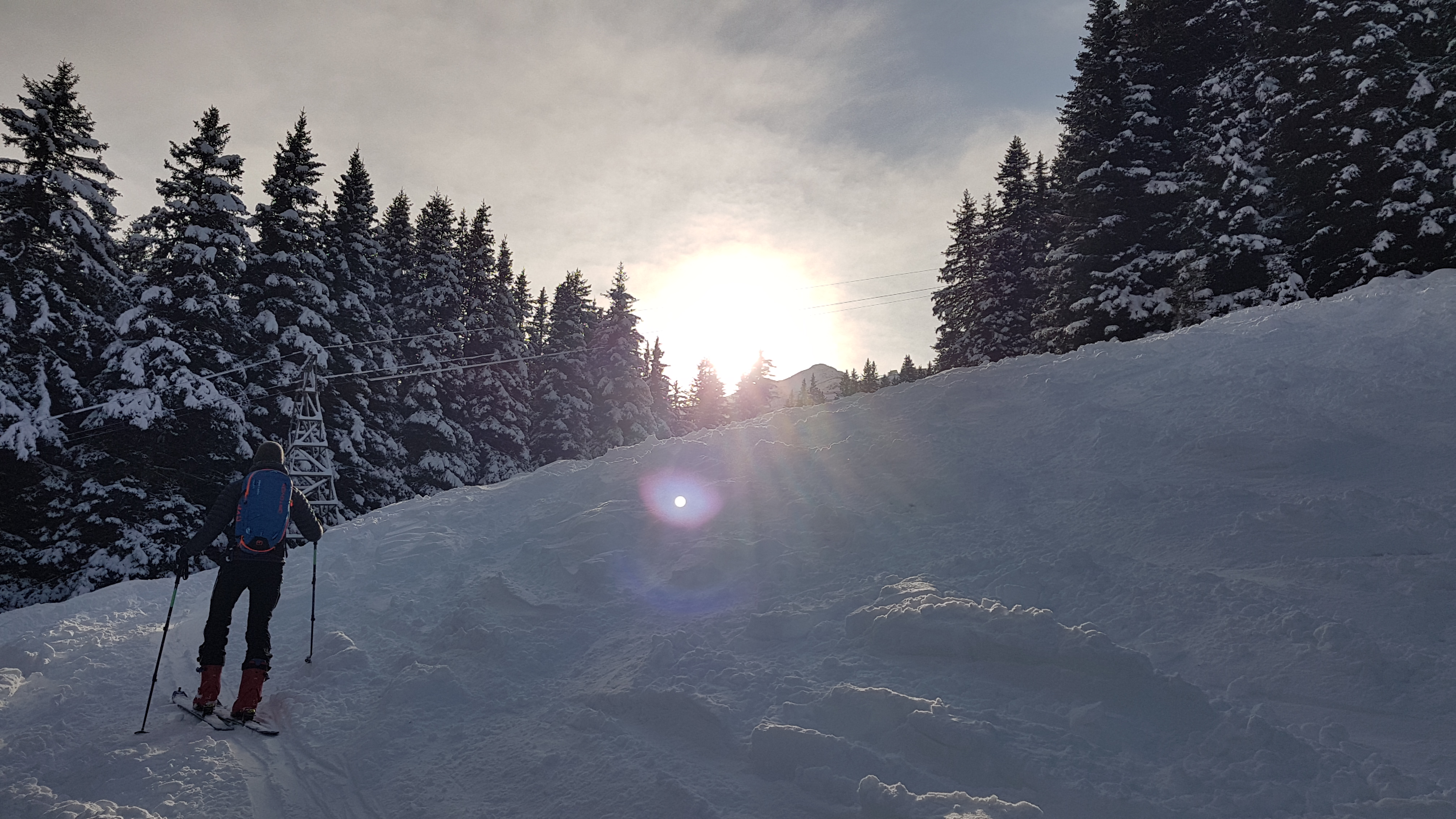 Von der Schneemenge wären in dieser Gegend und in dieser Höhenlage wohl schon Skitouren im freien Gelände möglich. Allerdings sorgt der anhaltende Föhnsturm (siehe Video) für kritische Verhältnisse, da muss man kein Experte sein, um das zu erkennen!