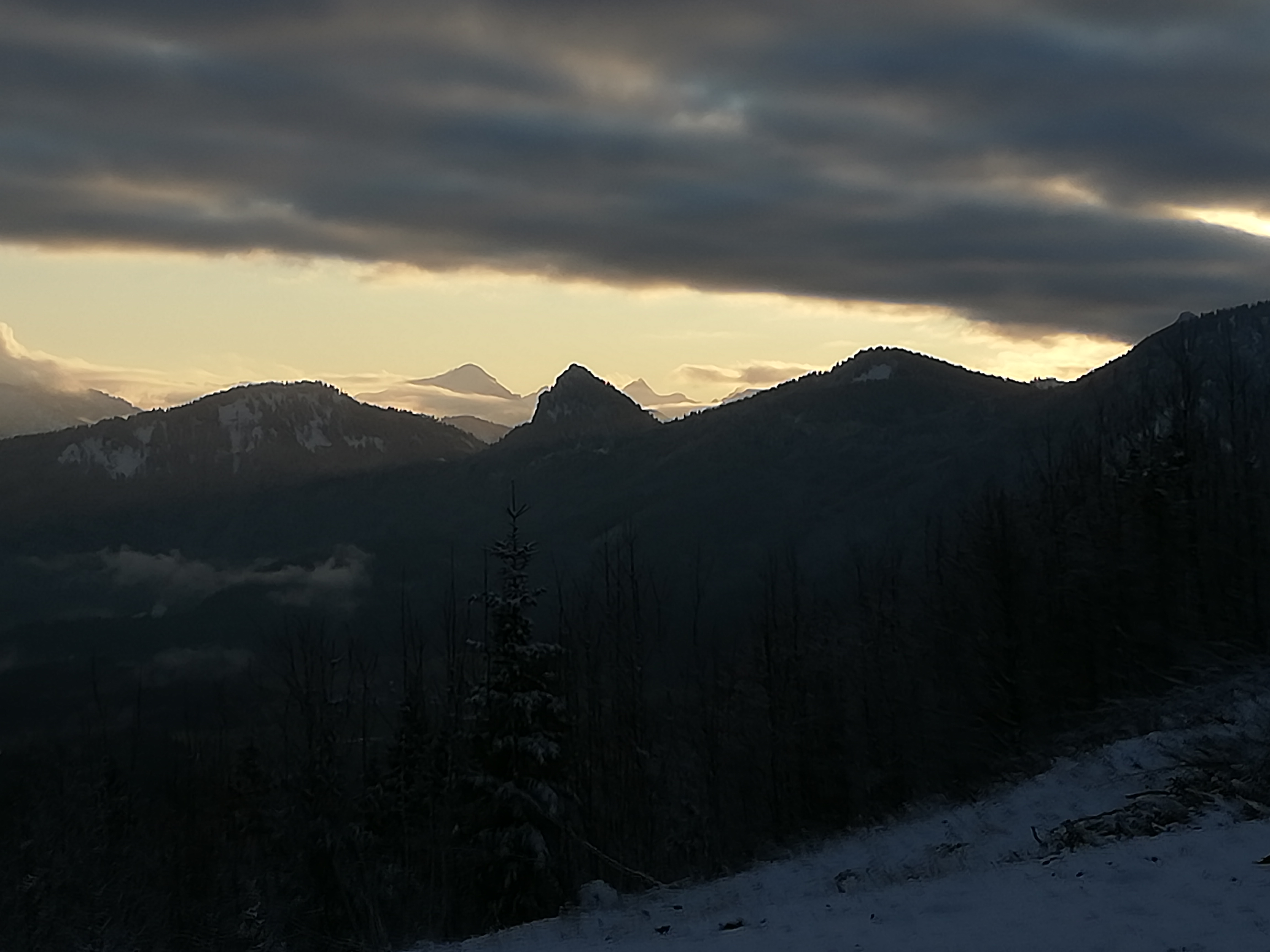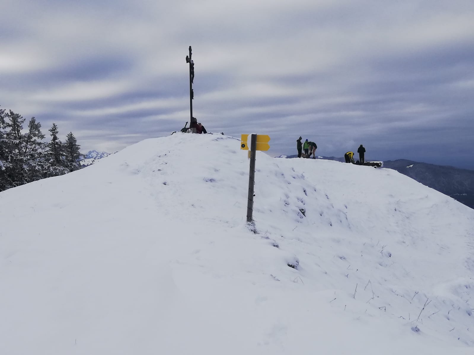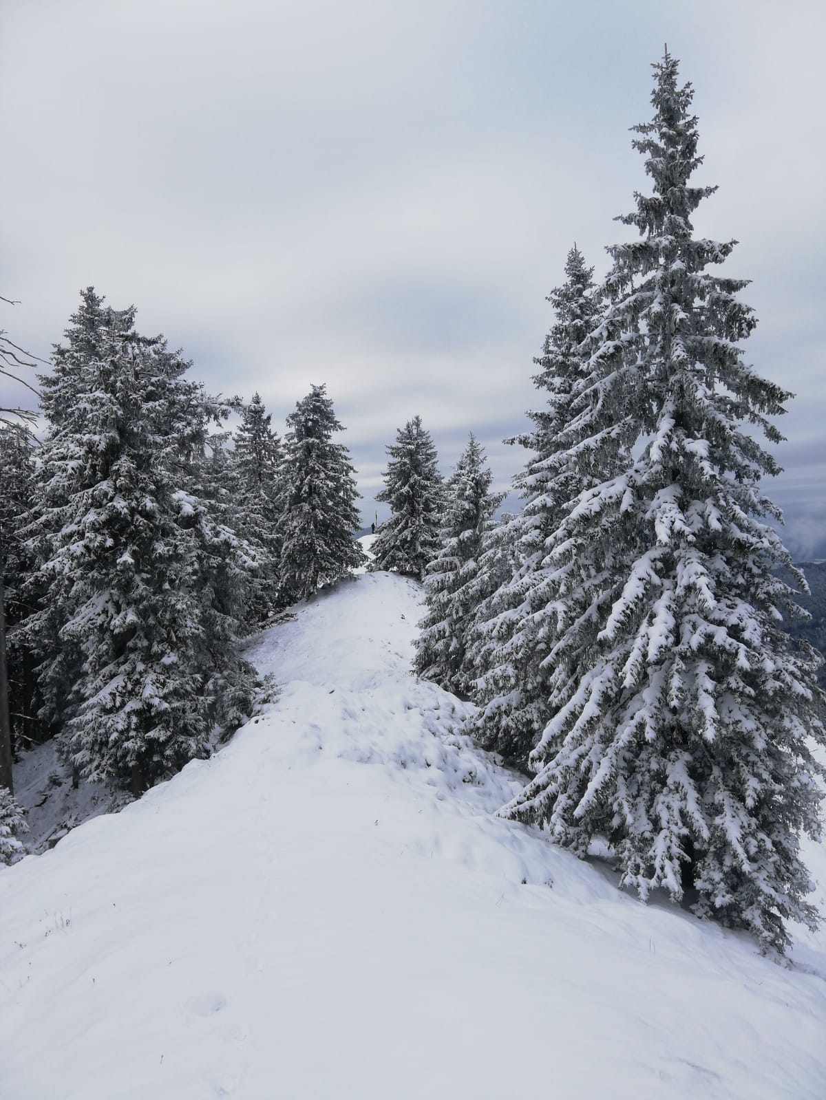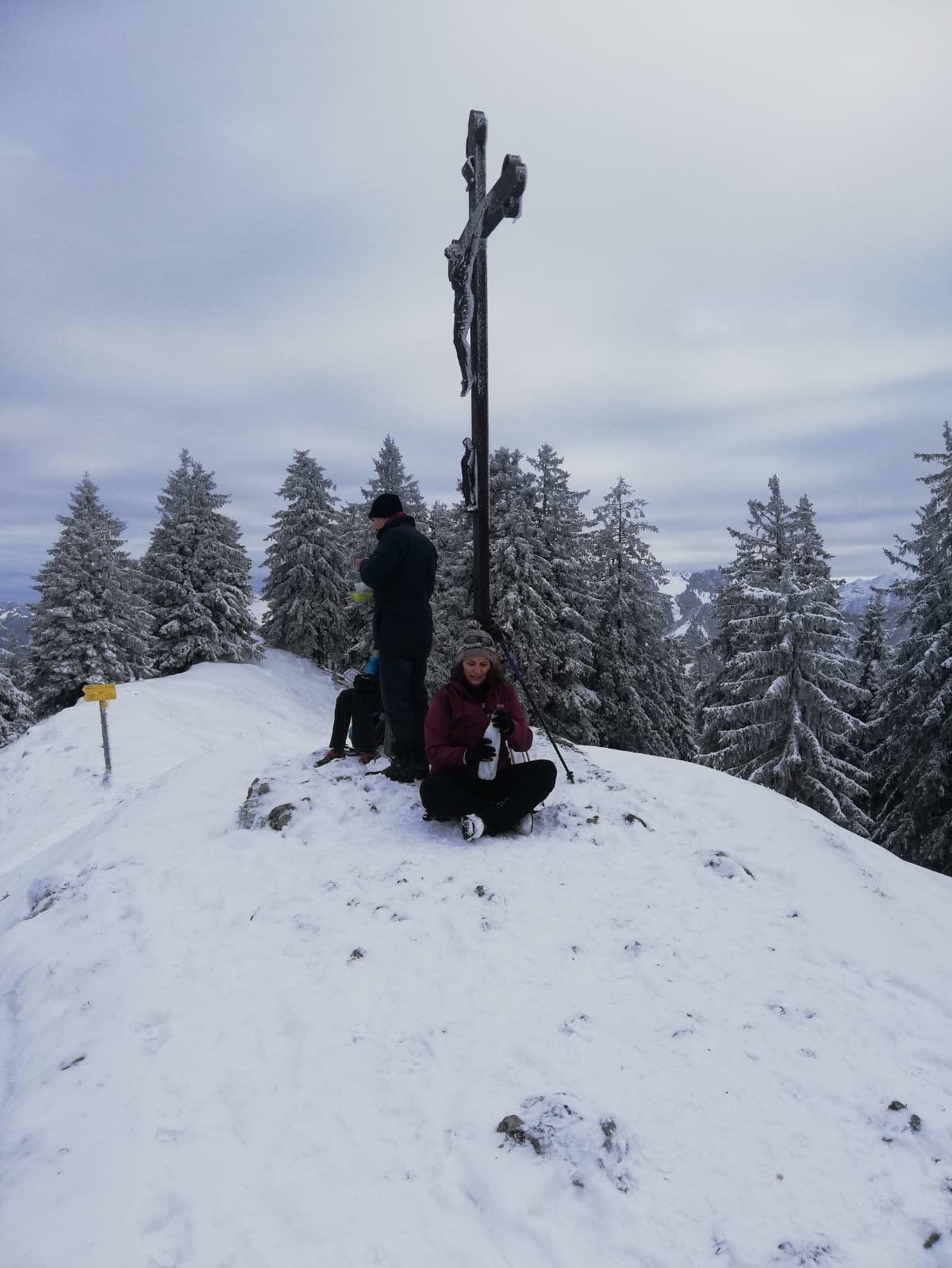Tourenverhältnisse: Über Galaun und Riederstein zum Gipfel. Forststraße/Rodelbahn nach Galaun schneefrei, zum Riederstein ganz überwiegend schneefrei, von dort zur Baumgartenschneid überwiegend leicht verschneit, am Gipfel etwa 5cm. Insgesamt problemlos, wenig los.