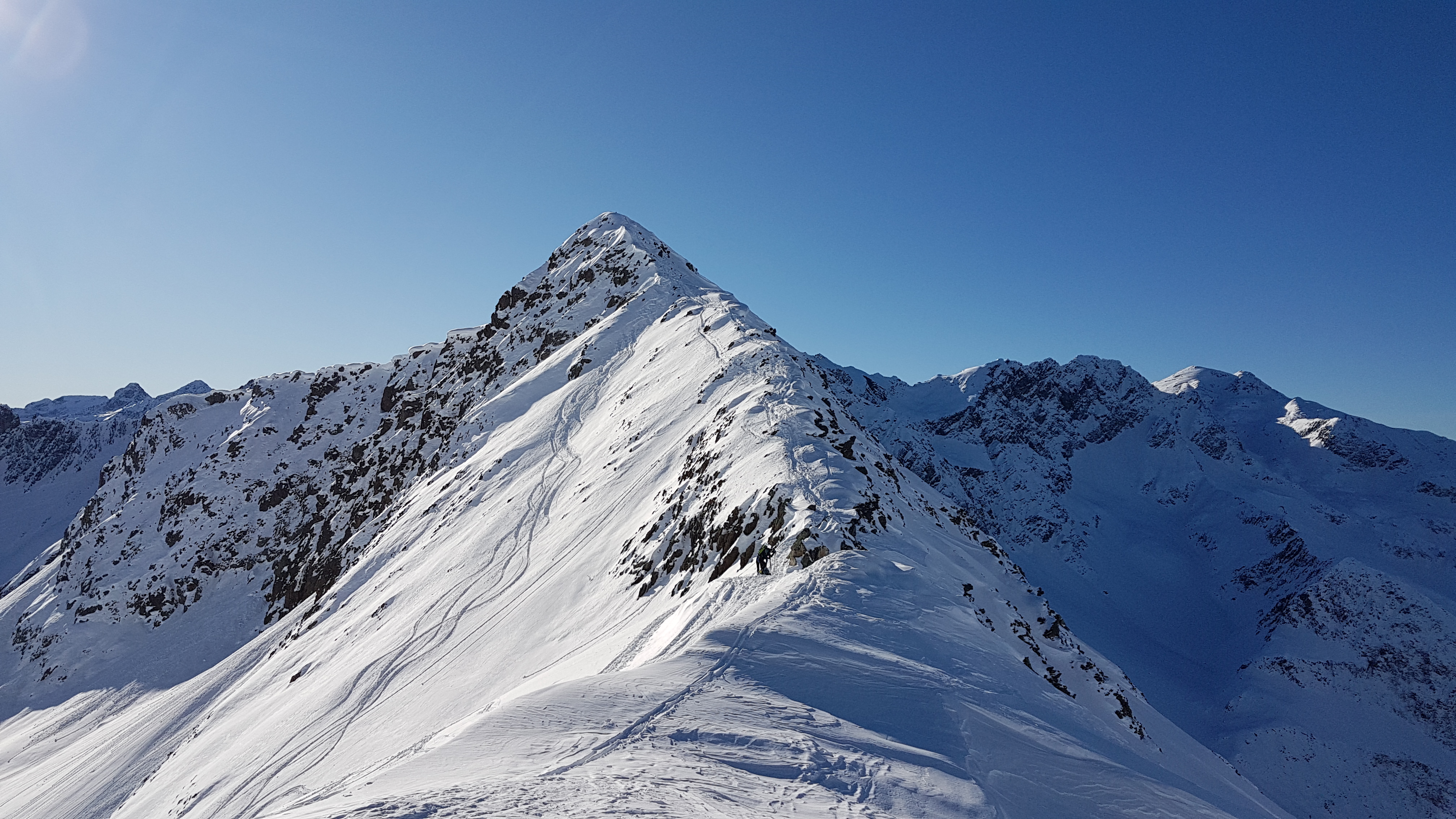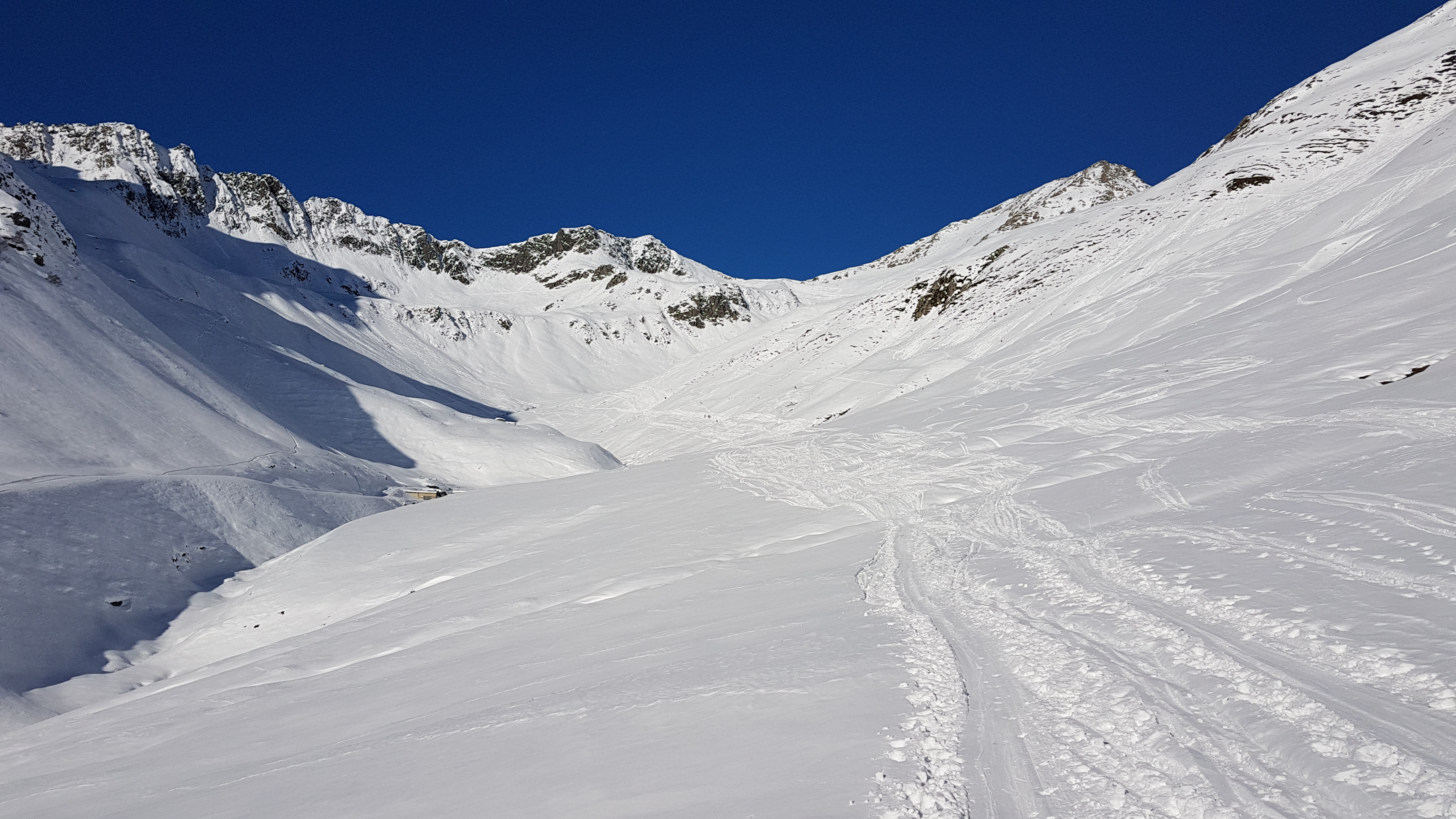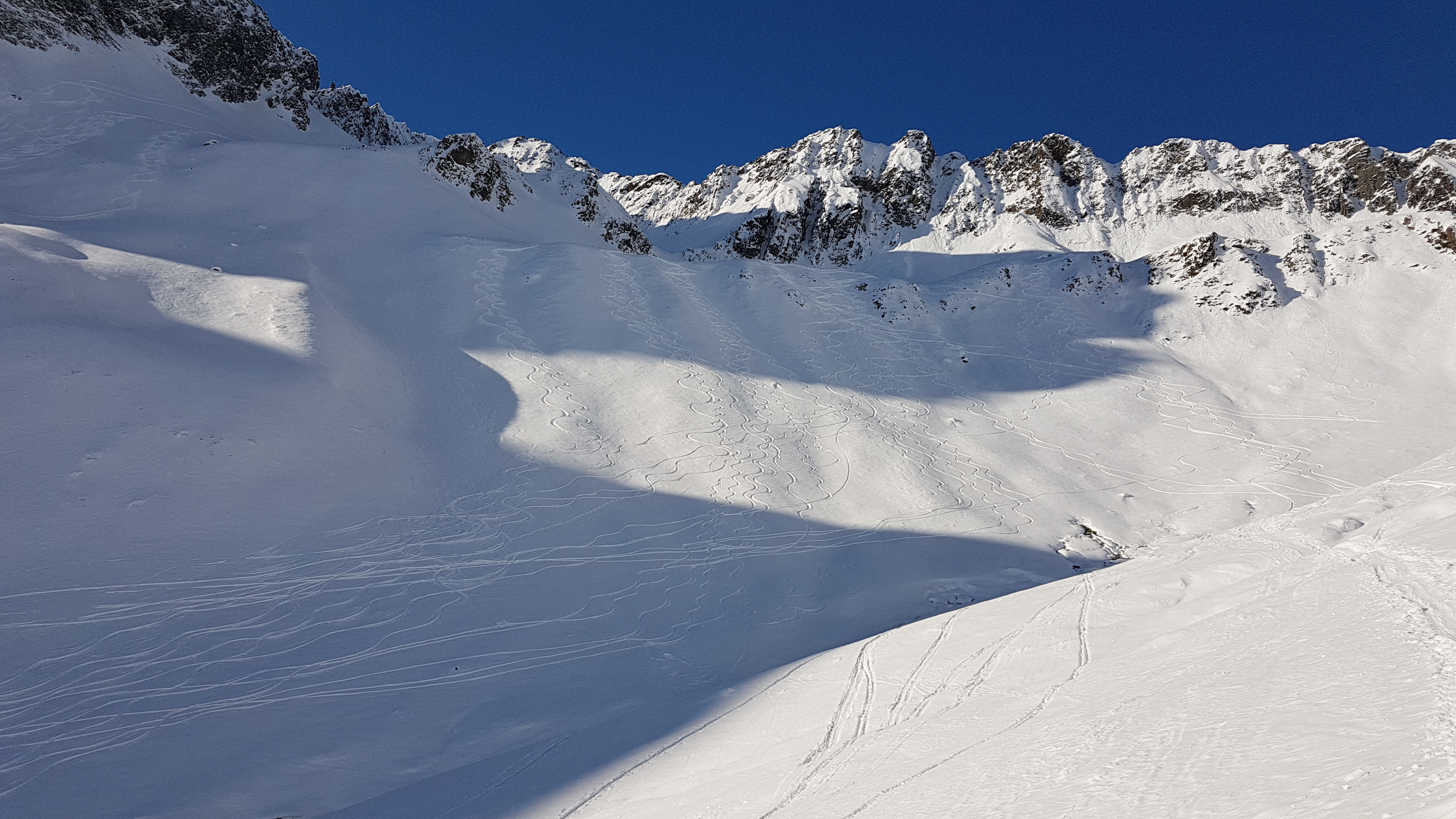 Tourenverhältnisse: Sehr gute Schneeverhältnisse von unten weg. Wobei der Steilhang über der Straße jetzt schon sehr zerfahren ist. Oben noch überwiegend pulvrig. Hauptabfahrt gut eingespurt, aber daneben und auf der Variante rechts runter noch genug Platz für eigen Spuren.