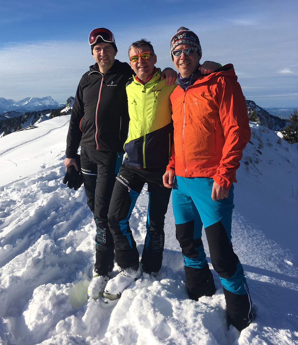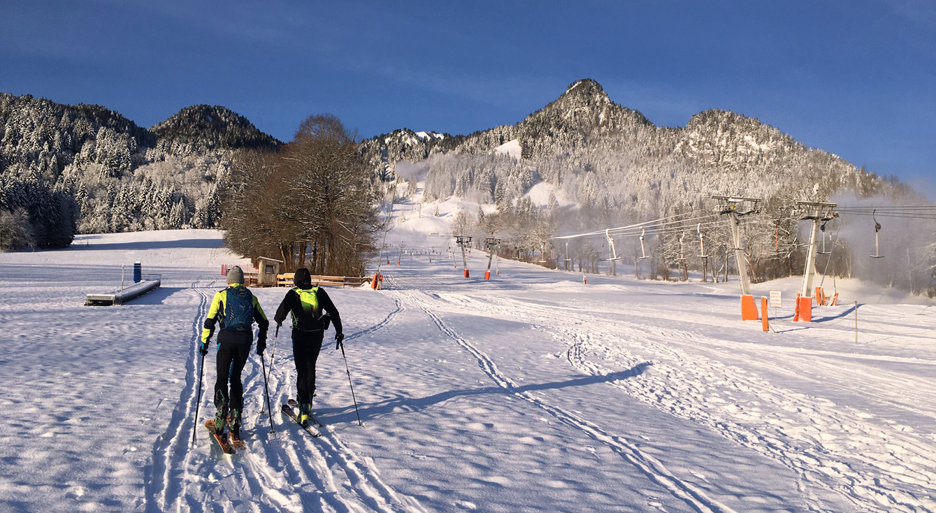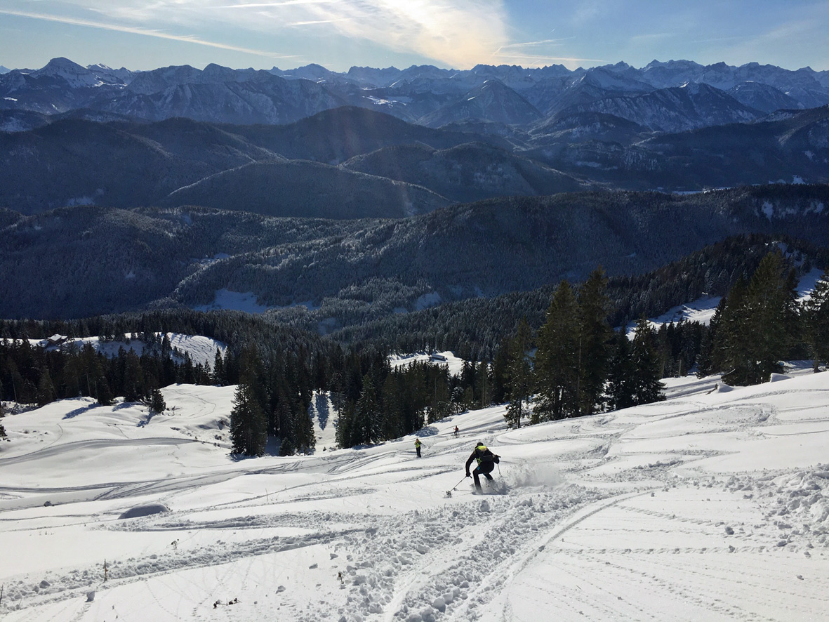 Tourenverhältnisse: Zugegebenermaßen, wir waren etwas skeptisch nach einem Facebook-Log, der von überraschend guten Verhältnissen berichtete. Die Rücksprache mit einem ortsansässigen Bergwachtler ermunterte uns aber, es ohne Steinski zu wagen. Und ja, es geht prima! Der Parkplatz am Draxlhang (2 Euro) ist dick zugeschneit, am gesamten Brauneck wurde auch schon maschinell beschneit. Die Kunst war es, die richtige Balance zwischen Kunst- un Naturschnee zu finden. Austieg natürlich kein Problem. Aber auch die Abfahrt ging erstaunlich gut und ohne Steinkontakt. Im Gipfelbereich 40 cm Neuschnee - super Pulver, traumhaft zu fahren. Im Pistengebiet wurde nur bruchstückhaft gewalzt. Dort, wo der Kunstschnee dominiert, kann es unangenehm werden - also entweder den Naturpulver erspüren oder sich ins verspurte Gelände stürzen (da geht es auch gut). Unsere Sorge, der Bachhang oberhalb vom Milchhäusl könnte steinig sein: unbegründet. Hier wurde schon massiv beschneit, kein Steinkontakt. Die letzten Schwünge über den Draxlhang führen einen nonstop zum Parkplatz. Fazit: Es geht echt schon gut am Brauneck.