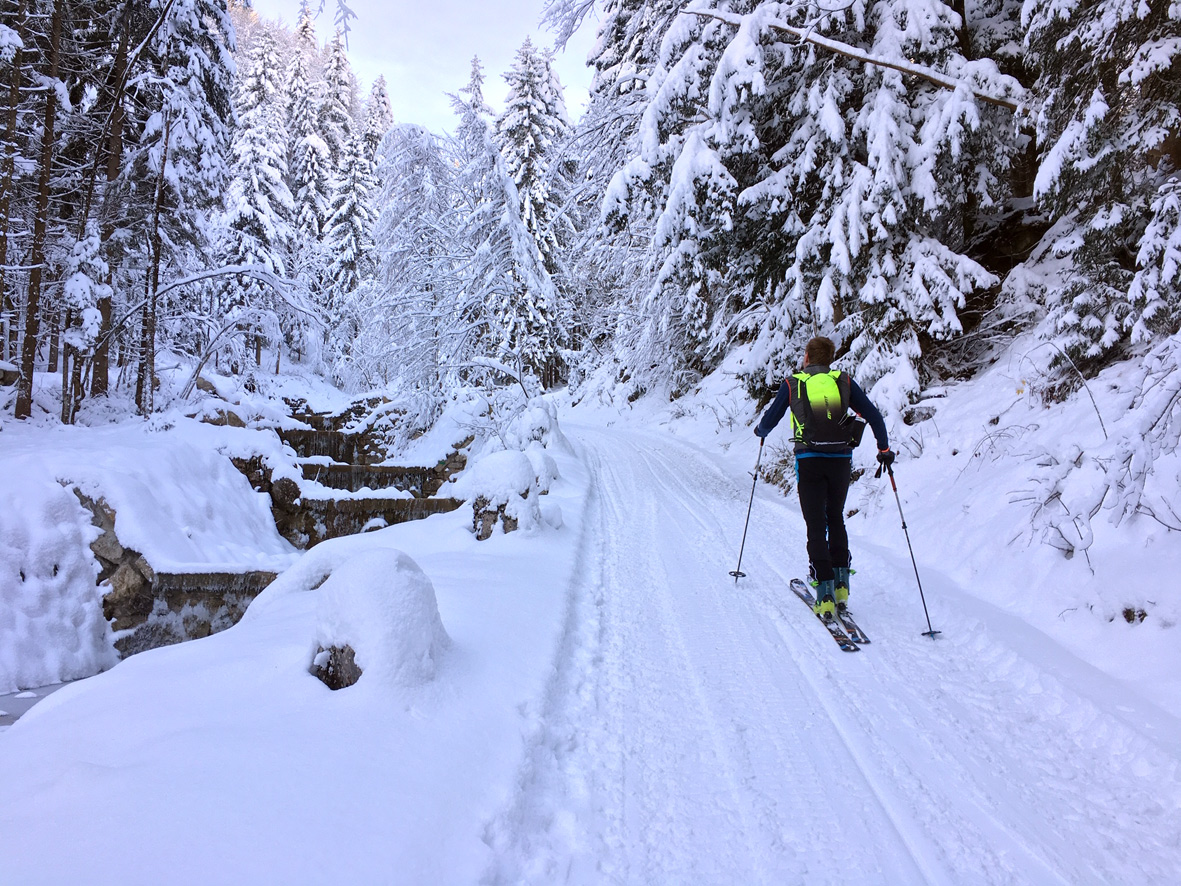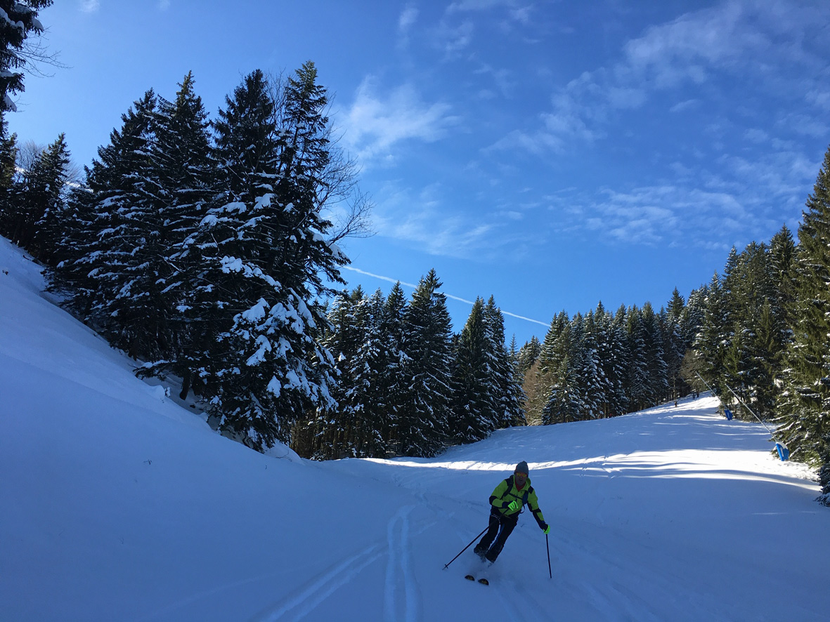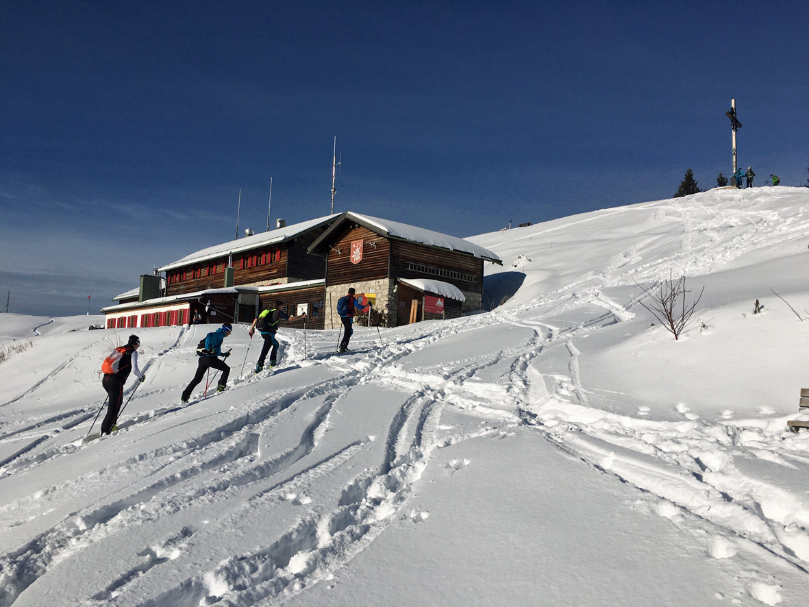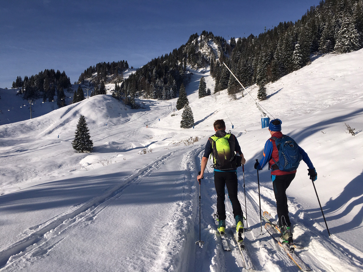 Tourenverhältnisse: Zugegebenermaßen, wir waren etwas skeptisch nach einem Facebook-Log, der von überraschend guten Verhältnissen berichtete. Die Rücksprache mit einem ortsansässigen Bergwachtler ermunterte uns aber, es ohne Steinski zu wagen. Und ja, es geht prima! Der Parkplatz am Draxlhang (2 Euro) ist dick zugeschneit, am gesamten Brauneck wurde auch schon maschinell beschneit. Die Kunst war es, die richtige Balance zwischen Kunst- un Naturschnee zu finden. Austieg natürlich kein Problem. Aber auch die Abfahrt ging erstaunlich gut und ohne Steinkontakt. Im Gipfelbereich 40 cm Neuschnee - super Pulver, traumhaft zu fahren. Im Pistengebiet wurde nur bruchstückhaft gewalzt. Dort, wo der Kunstschnee dominiert, kann es unangenehm werden - also entweder den Naturpulver erspüren oder sich ins verspurte Gelände stürzen (da geht es auch gut). Unsere Sorge, der Bachhang oberhalb vom Milchhäusl könnte steinig sein: unbegründet. Hier wurde schon massiv beschneit, kein Steinkontakt. Die letzten Schwünge über den Draxlhang führen einen nonstop zum Parkplatz. Fazit: Es geht echt schon gut am Brauneck.