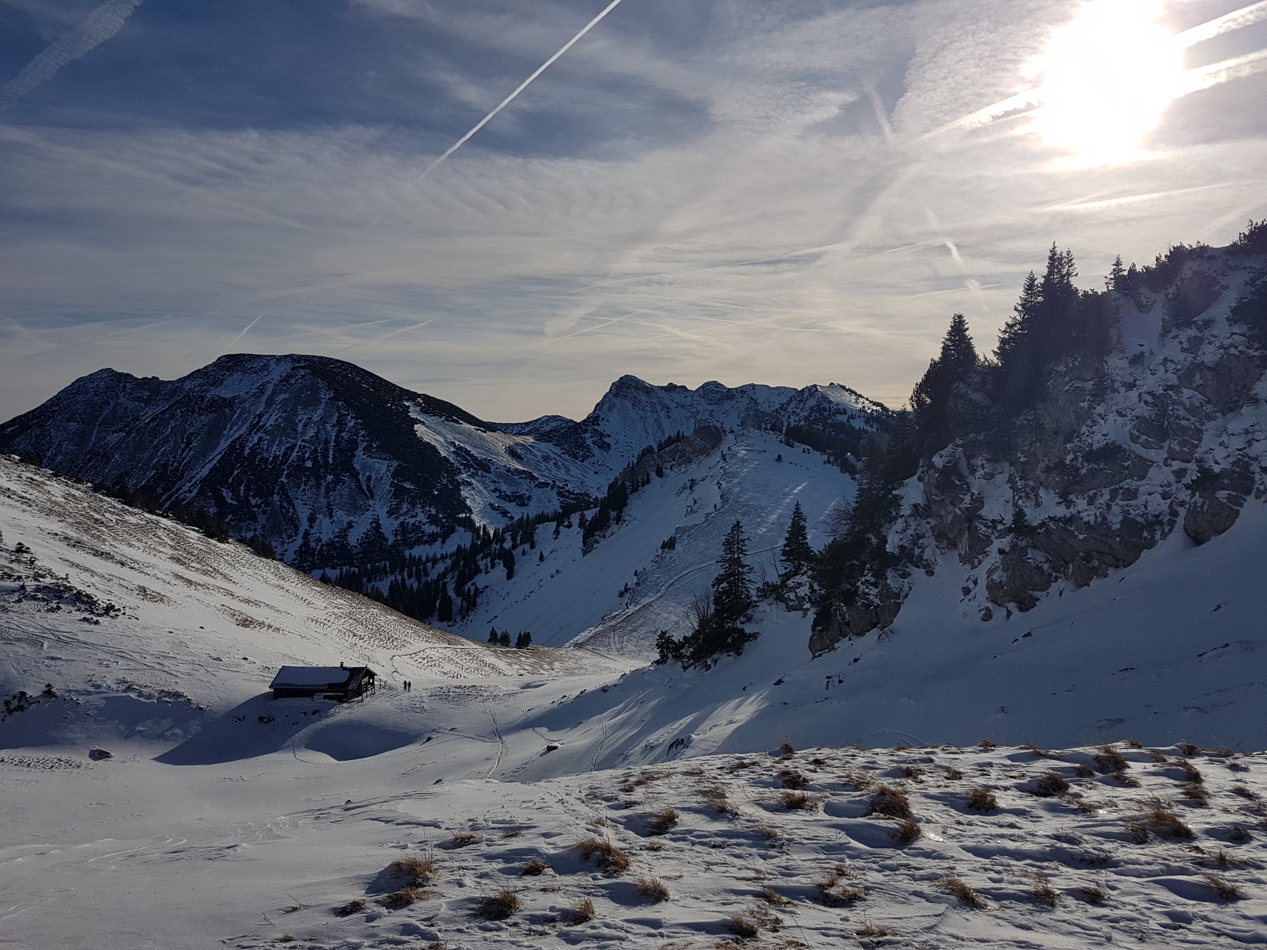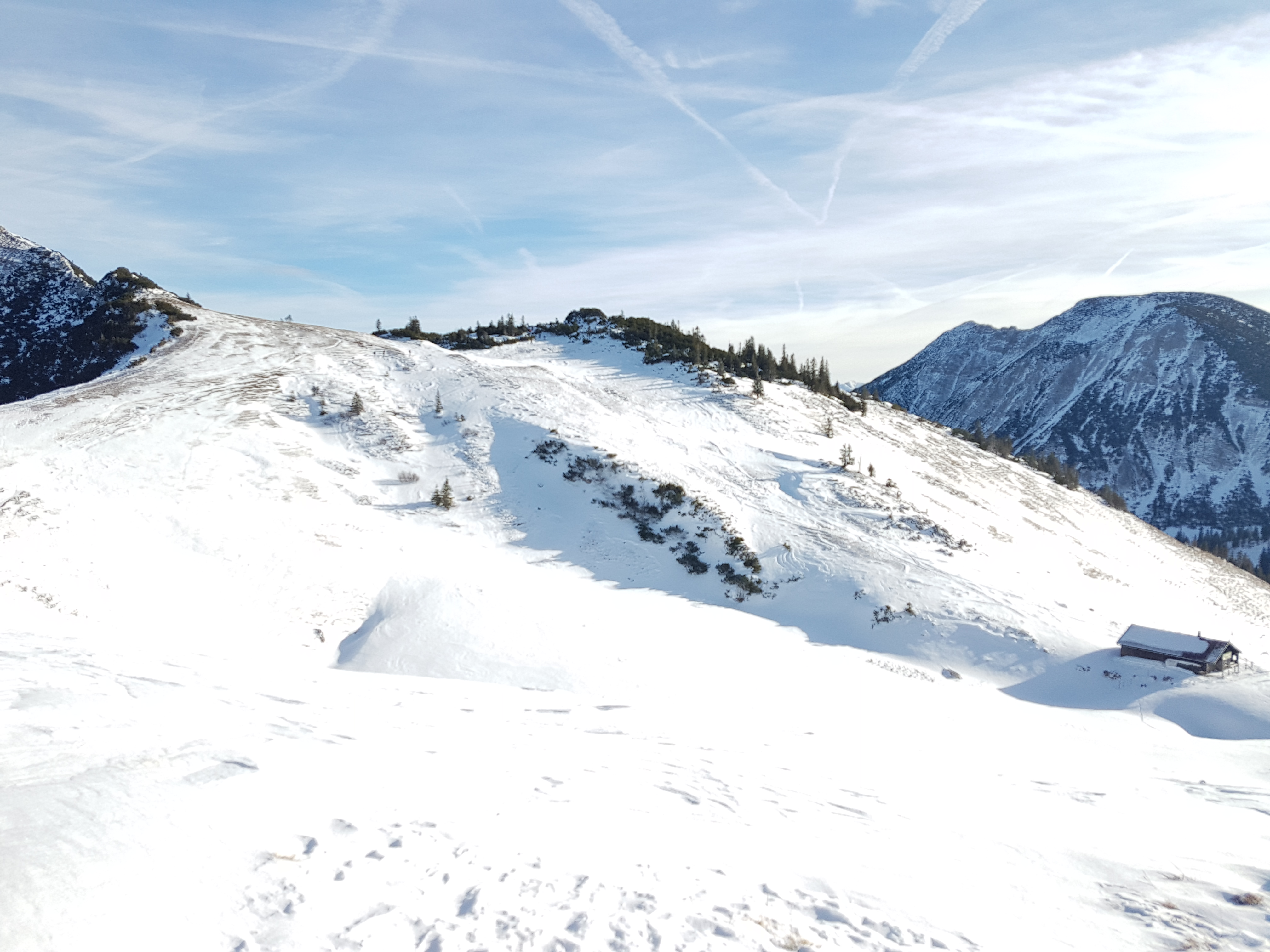 Tourenverhältnisse: Der Wind hat wirklich ganze Arbeit geleistet. bis auf einige wenige windgeschützte Hangbereiche ist alles total abgeblasen. Dennoch findet man gerade ausreichend Schnee um rauf und wieder runterzukommen. Steinberührung ist aber fast nicht zu vermeiden. Einzig ein flacher Hangabschnitt oberhalb der Rauhkopfhütte ging sehr gut zu fahren. Heute im Gipfelbereich lebhafter Wind, ansonsten fast kein Wind und recht milde Temperaturen. Der steile erste Hang der ehemaligen Lochgraben-Piste war im Aufstieg noch nicht vereist, hat aber sehr wenig Schnee und wurde zudem von einer Pistenraupe zerwühlt. Kein Genuss bei der Abfahrt, und jetzt auch zusätzlich schon ziemlich abgefahren.