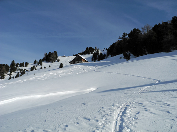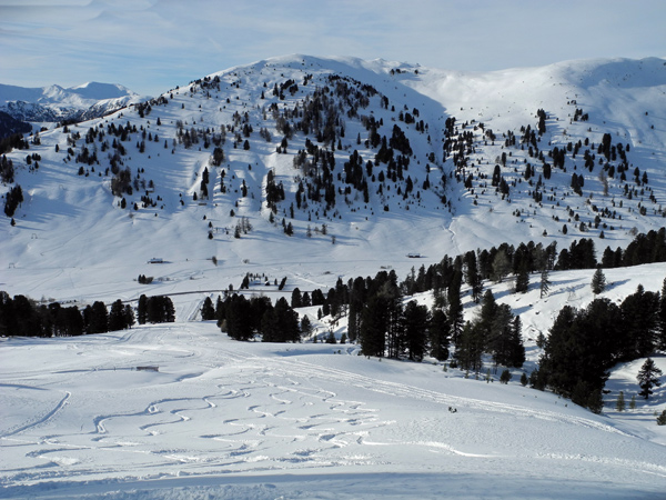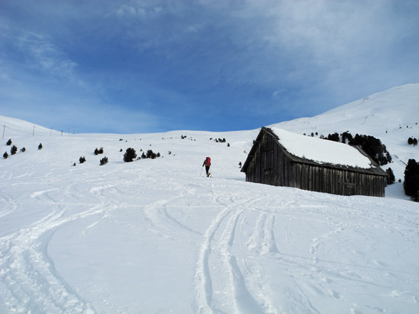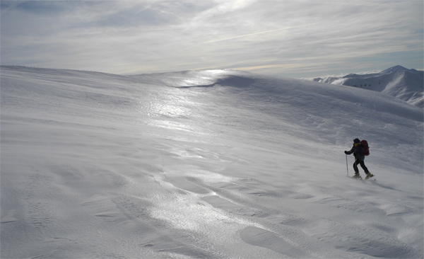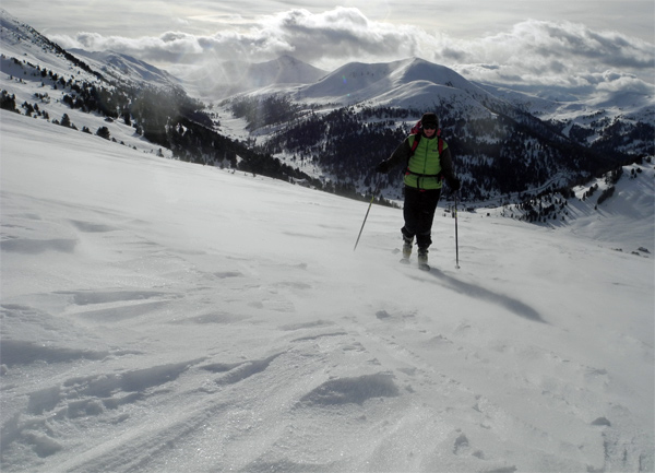 Tourenverhältnisse: gute bis sehr gute Schneebedingungen. Es liegt ein guter halber Meter kompakter Altschnee, darauf eine 20 cm Pulverauflage in den windberuhigten Hang- und Höhenlagen. Ansonsten überwiegt eine vom Wind hartgepresste Schneeoberfläche, die sich aber wie auf einer Skipiste fahren lässt. Leider war an allen Tagen der teilweise sehr starke Wind im Gipfelbereich mehr als unangenehm. Am Montag mussten wir leider bei Sturm die Tour abbrechen, da man öfters umgerissen wurde. Dafür war es recht mild mit plus 5°C am Ausgangspunkt auf über 1700 m.