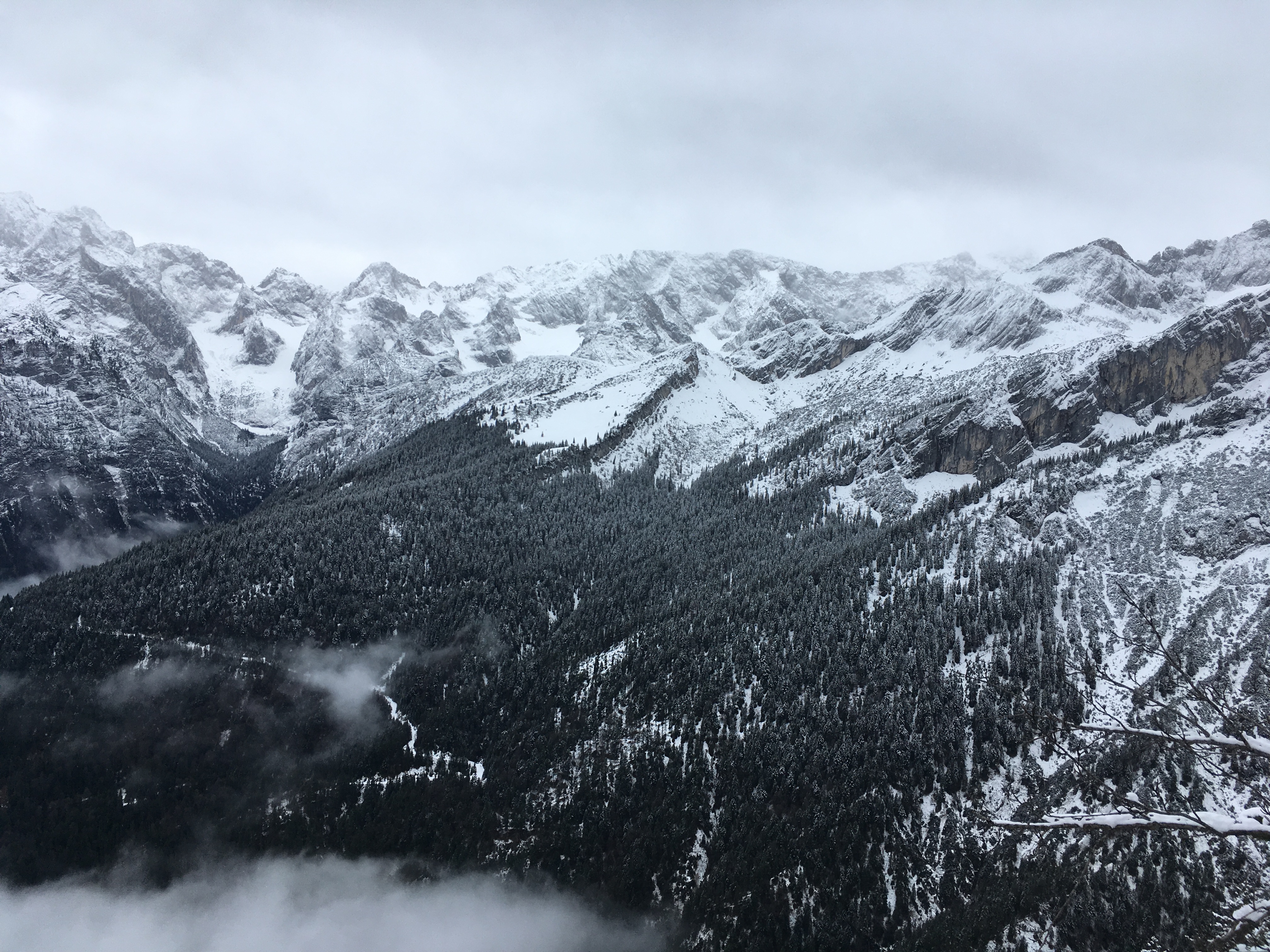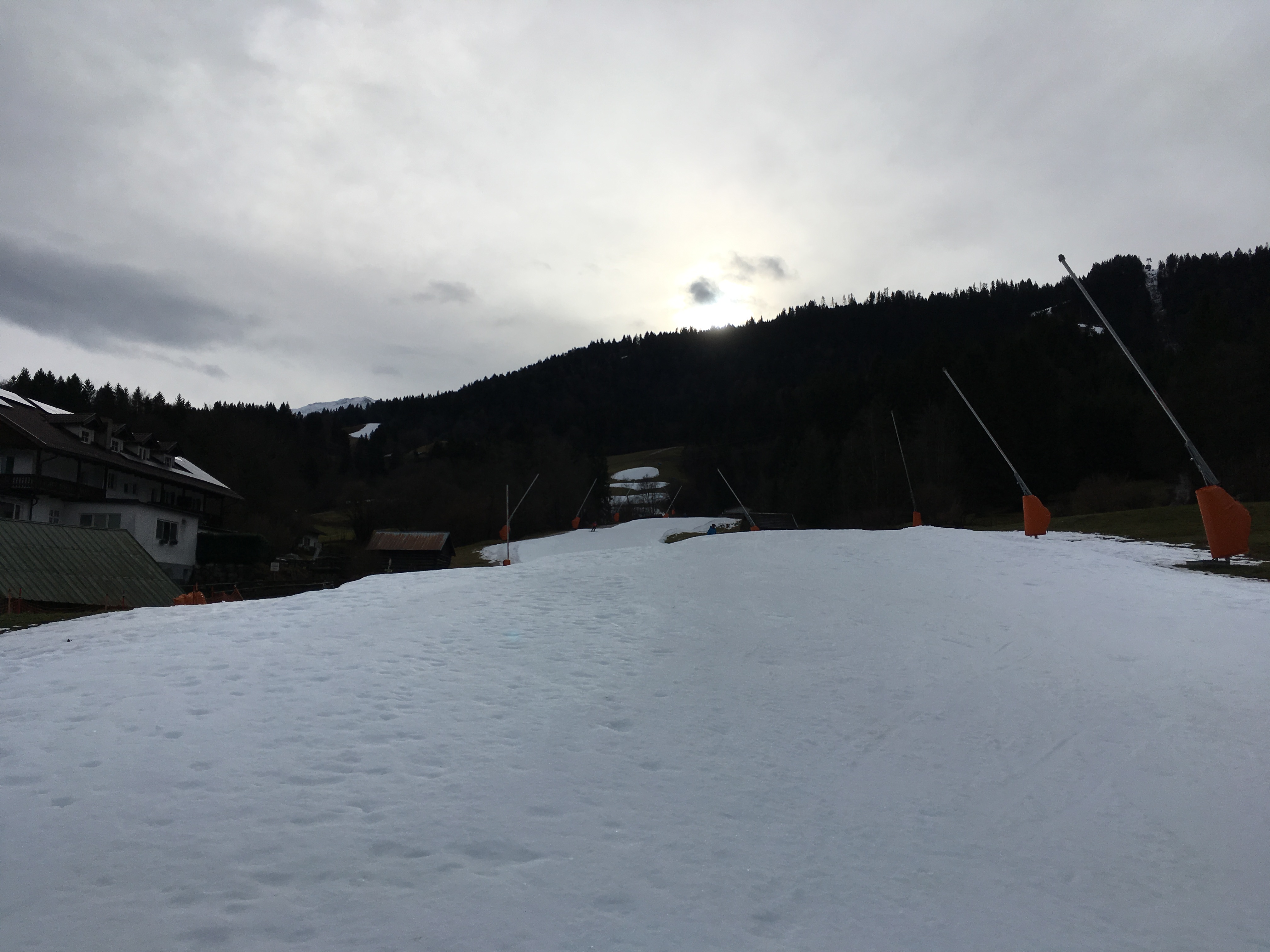 Tourenverhältnisse: Schnee von unten weg, unterhalb ca. 1.100 m teilweise aber nur ein schmales Band; ab ca. Höhe Bayernhaus ist der Neuschnee liegen geblieben, aber keine großen Mengen; die Pisten sind recht gut in Schuss und nicht extrem eisig, wenngleich auch nicht weich