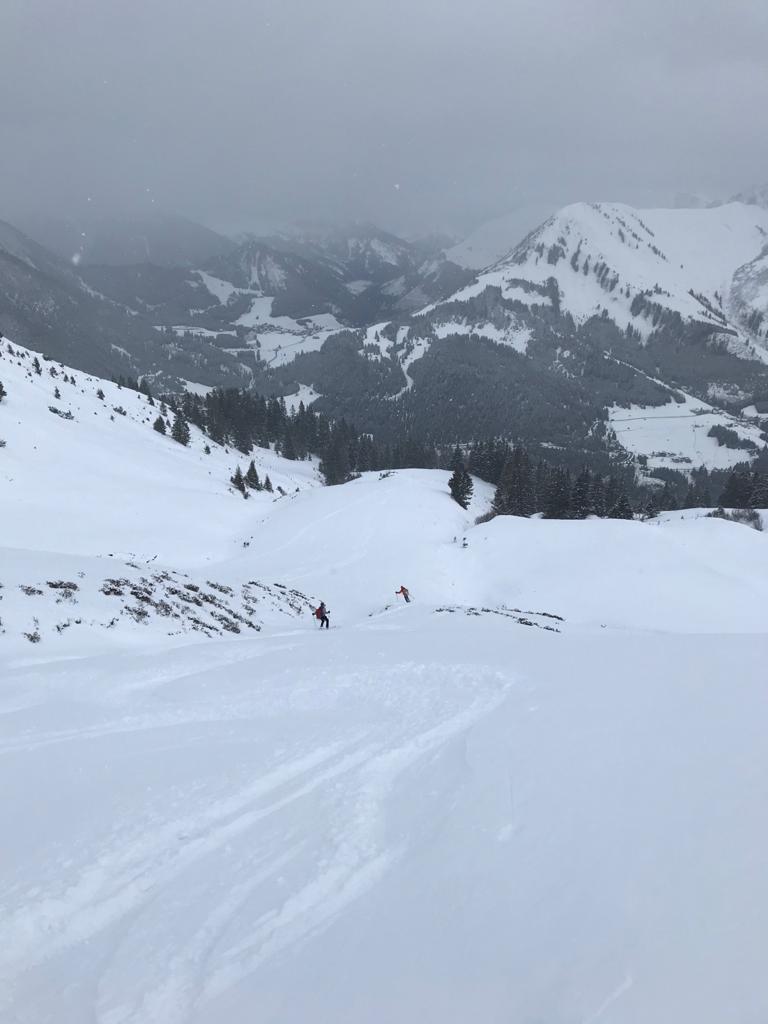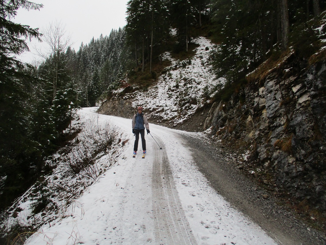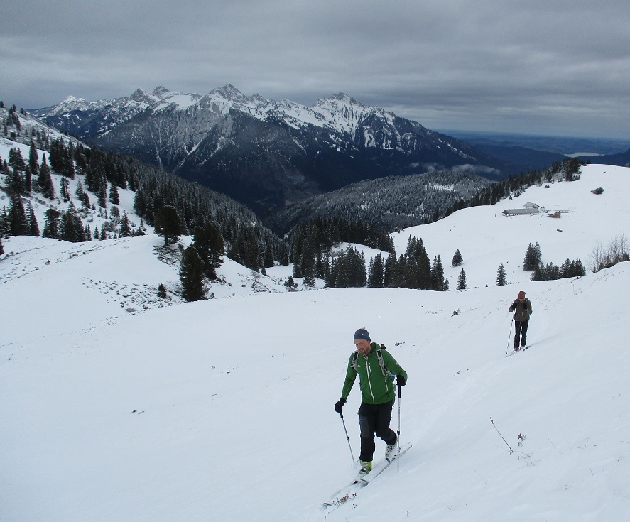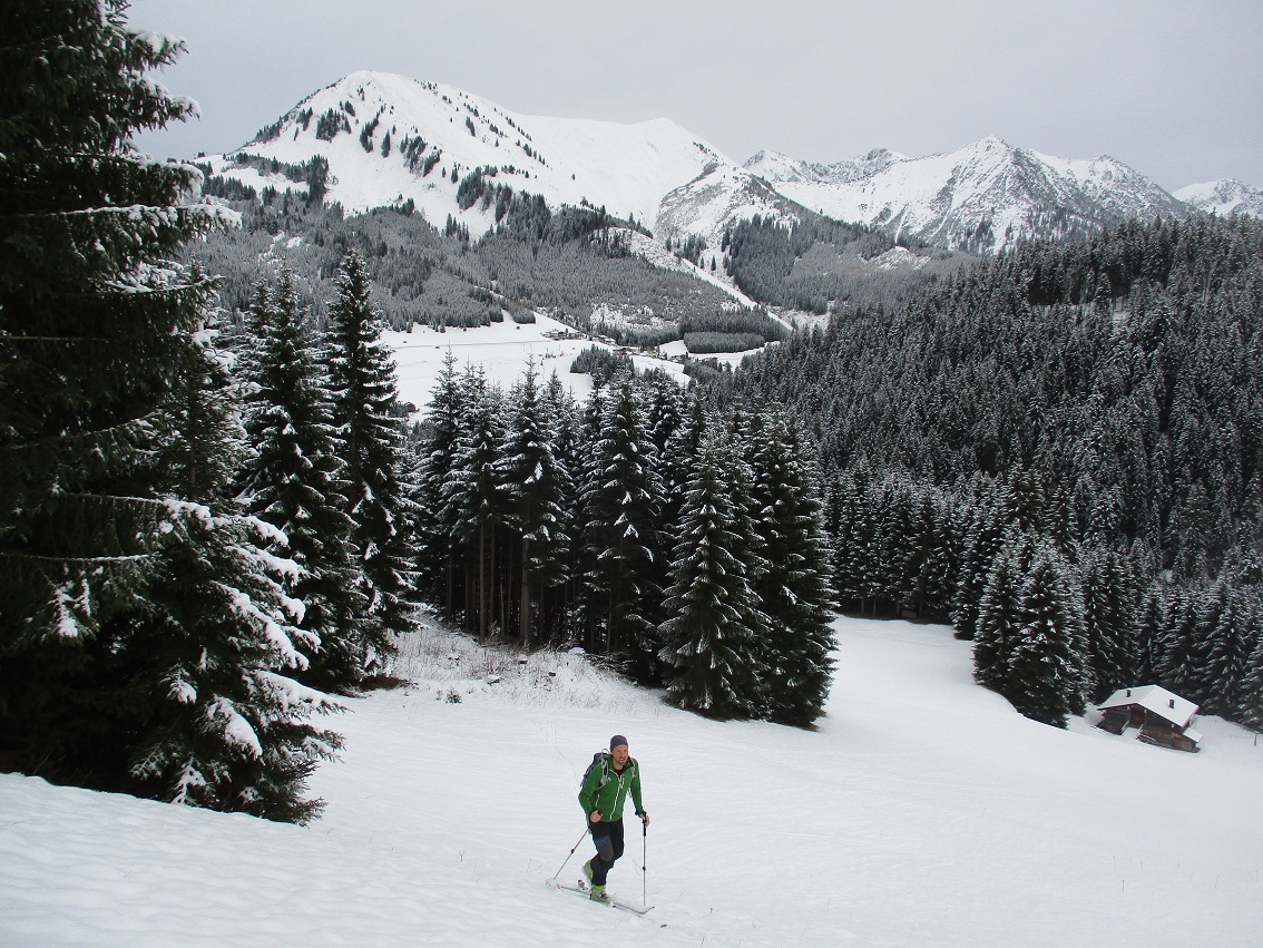 Tourenverhältnisse: Na ja .. bis .. gut / Etwas Neuschnee von 5 cm im Tal bis 20cm am Berg / Aufstieg teils auf Fortsweg bis Raazalpe / Gipfelgrat teils abgeblasen teils verwechtet / Abfahrt bis Ehenbichler Alpe ganz fein : Pulver auf tragendem Altschnee / danach über Forstweg / drunten ging der leichte Schneefall in Regen über und vernichtet wieder die Neuschneeauflage !
