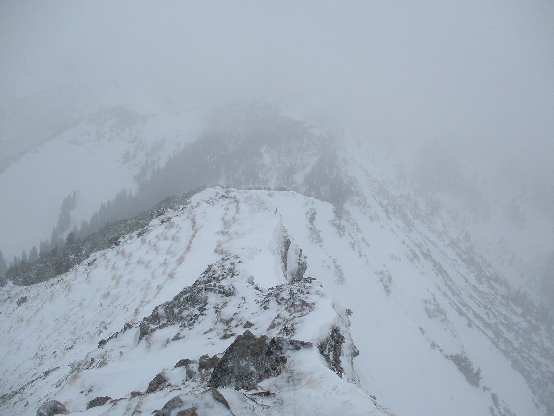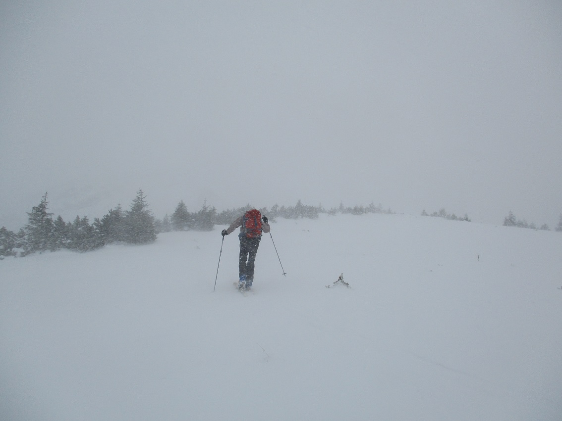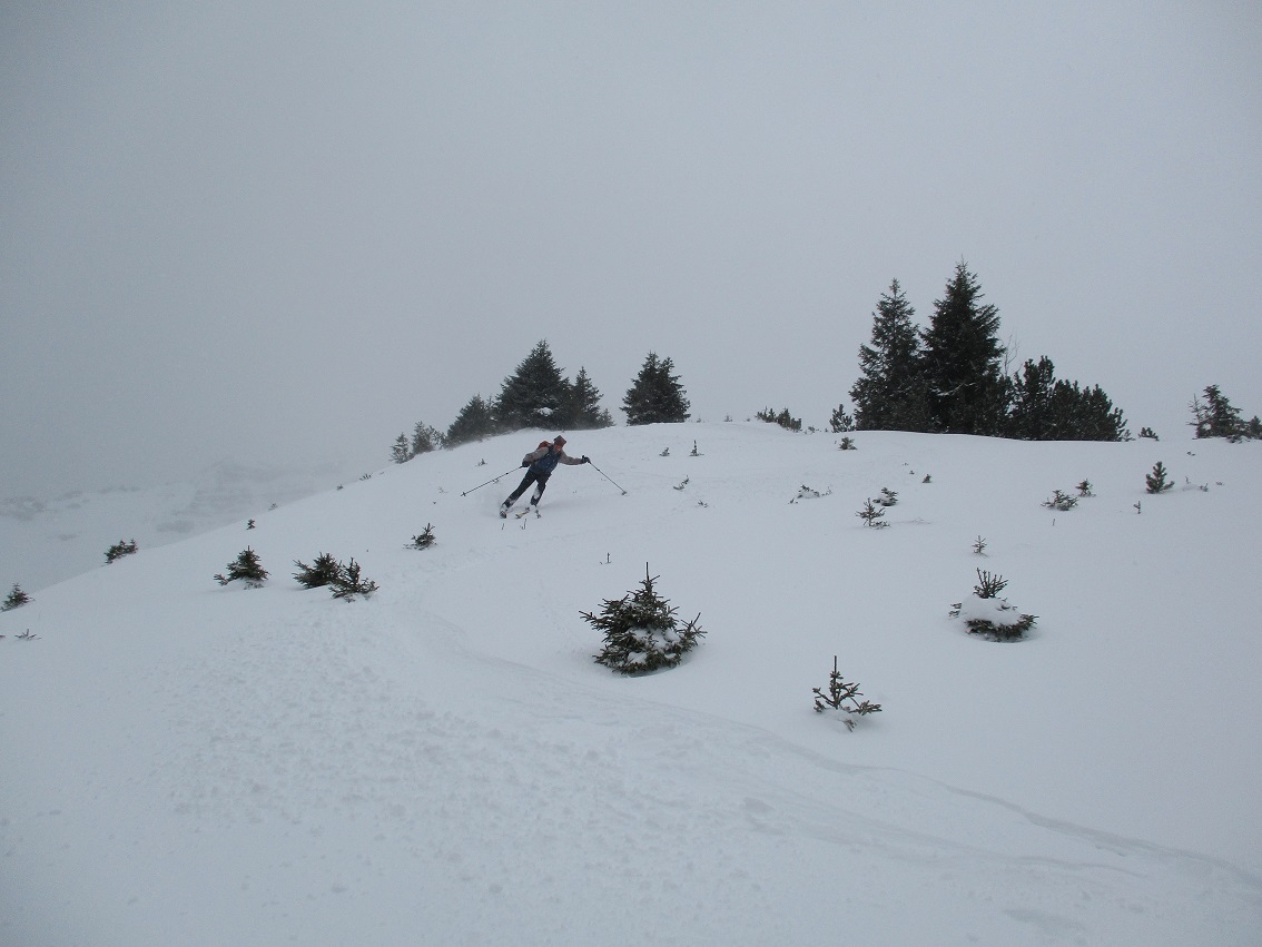 Tourenverhältnisse: Na ja : besser als Nichts / bis knapp 1200 m schneefrei und der Regen ging in Schnee über / im freien Gelände starker Schneesturm mit kurzen Pausen / Gipfelanstieg teils vereist / alle Sorten von Schnee bei der Abfahrt / waren natürlich Alleine am Weg
