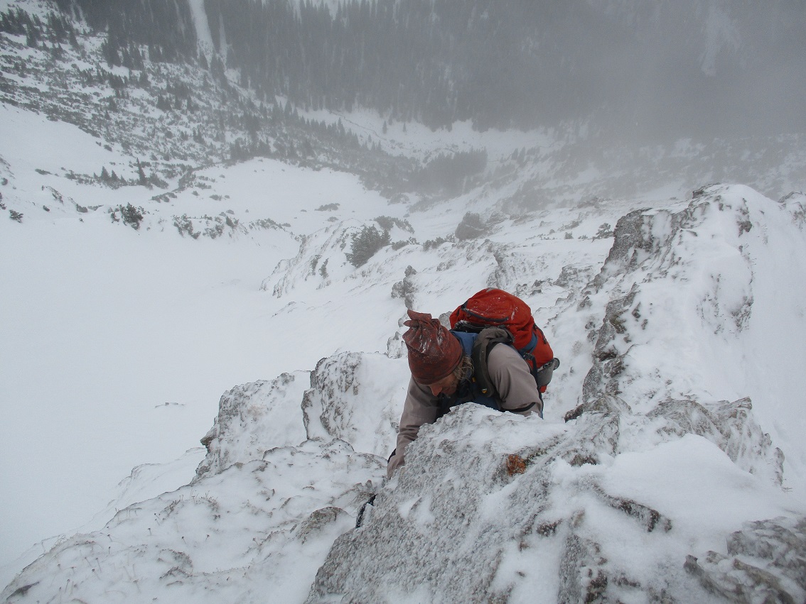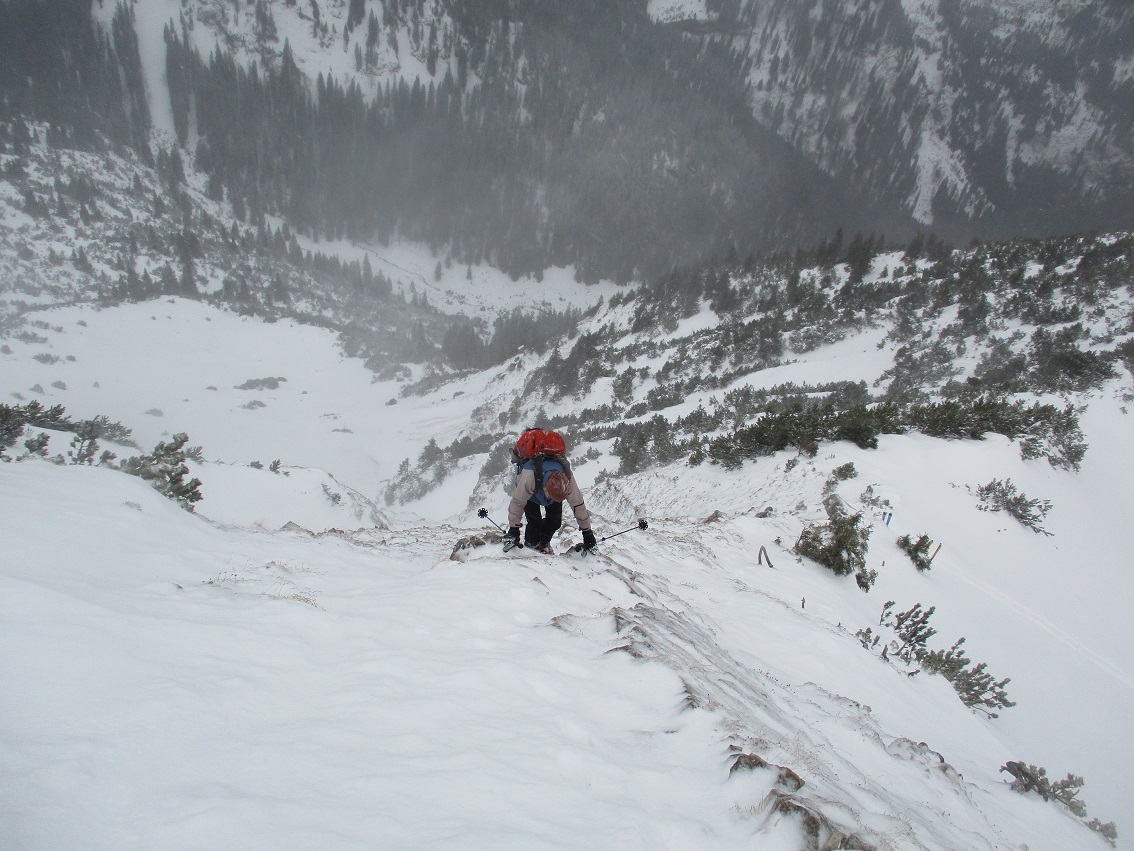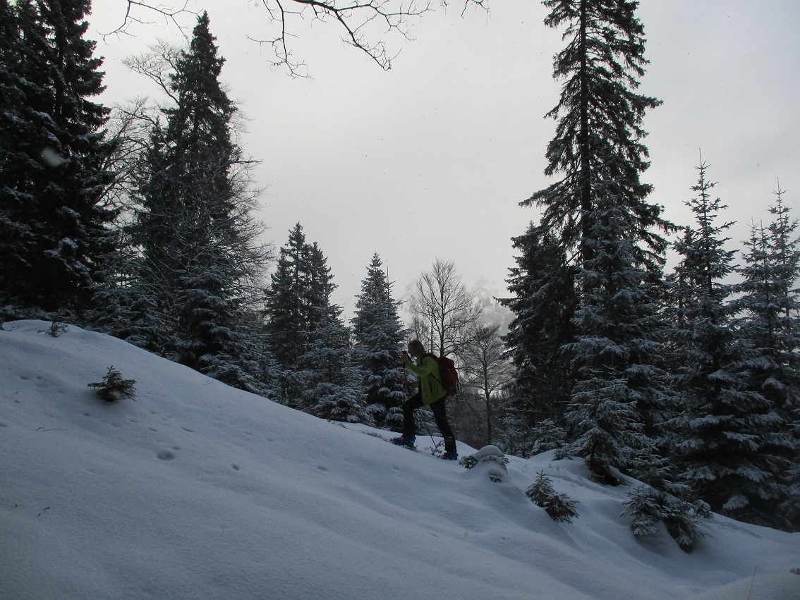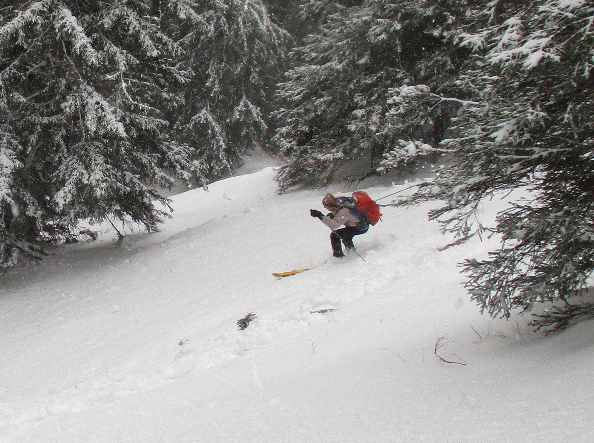 Tourenverhältnisse: Na ja : besser als Nichts / bis knapp 1200 m schneefrei und der Regen ging in Schnee über / im freien Gelände starker Schneesturm mit kurzen Pausen / Gipfelanstieg teils vereist / alle Sorten von Schnee bei der Abfahrt / waren natürlich Alleine am Weg