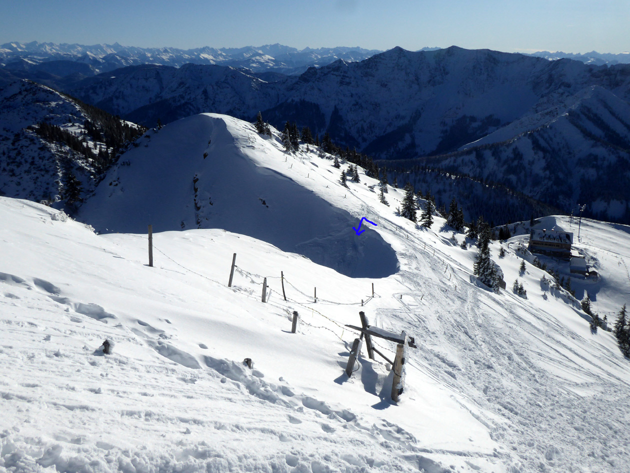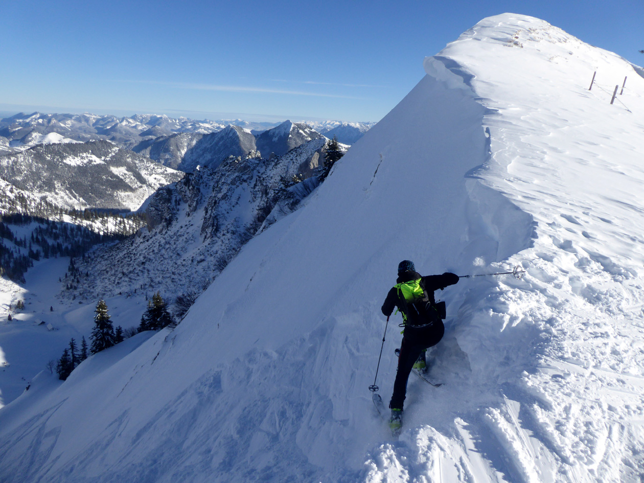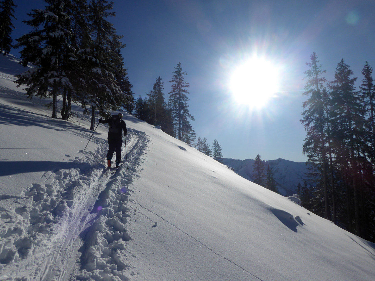 Tourenverhältnisse: Eigentlich hatten wir heute was anderes vor, wir wollten "nur ganz gemütlich" die Tanzeck-Reibn machen. Aber um 8.20 Uhr hat uns am Parkplatz er Taubensteinbahn fast der Schlag getroffen: Die Autos parkten schon kreuz und quer bis an den Rand, und am Beginn des Lochgrabens wuselten gefühlt 500 Leute umher, als ob hier ein Skitourenrennen stattfände. Nee, auf den Massenauflauf hatten wir keine Lust - und so parkten wir bei der Kirche (da ging es noch gang gut), wo 99 Prozent der Tourengeher zur klassischen Rotwandreibn starteten. Mit Marcus und Markus, meinen Lenggrieser Spezln, ging's im Sinne der Bergeinsamkeit woanders hin. Nämlich zunächst zu Fuß Richtung Valepp bis zur Waitzinger Alm (Winterstube), wo wir anfellten und einer Spur (vermutlich vom Vortag, drei Leute) in den eisigen Pfanngraben folgten. Hinter der Petzing-Alm (1120 m) verließen wir den Pfanngraben und spurten gute 90 MInuten teils recht mühsam durch mehr oder minder lichten Wald (hier konnte sich unser Bergwachtler schön verausgaben), ehe wir unterhalb der Wildfeld-Alm wieder auf freies Gelände und kurze Zeit später sogar auf eine Aufstiegsspur stießen. Nun war es bald vorbei mit der Einsamkeit: Die Rotwand rückte näher... Dort herrschte Hochbetrieb - allerdings nichts auf unserer Abfahrtsvariante: Wir sind kurz unterhalb des Gipfels über die Wechte gesprungen und die steile Nordostrinne direkt abgefahren Richtung Großtiefentalalm. Suuuuper Pulverschnee und nicht allzuviele Spuren! Dann wurde wieder angefellt, rauf zum Miesingsattel. Abfahrt über die Kleintefentalalm (geht links bei den Latschen recht gut), nochmal anfellen für den dritten Aufstieg des Tages, zunächst zur Bierpause im Tabensteinhaus und dann, frisch gestärkt, weiter zum Rauhkopf. Dor genossen wir die letzten Sonnenstrahlen sowie Pulver in der Abfahrt über den Westhang, dann folgte das Finale im überraschend gut zu fahrenden Lochgraben (schon ziemlich planiert, aber nur mäßig bucklig und relativ griffig). Fazit: Eine recht ausgedehnte Runde, in der wir trotz der Skitourengehermassen im Spitzinggebiet in den ersten zweieinhalb Stunden keinem einzigen Menschen begegnet sind.