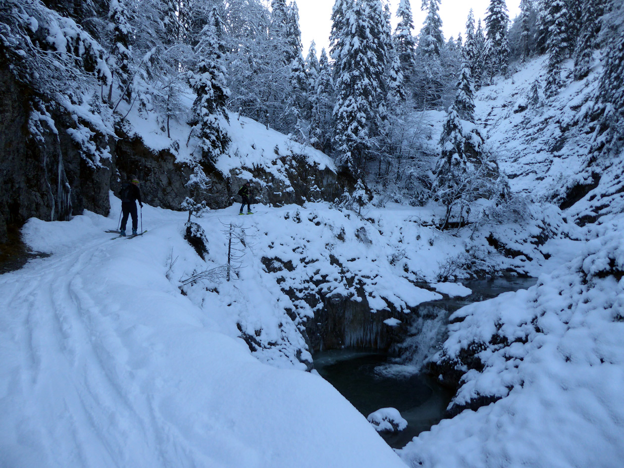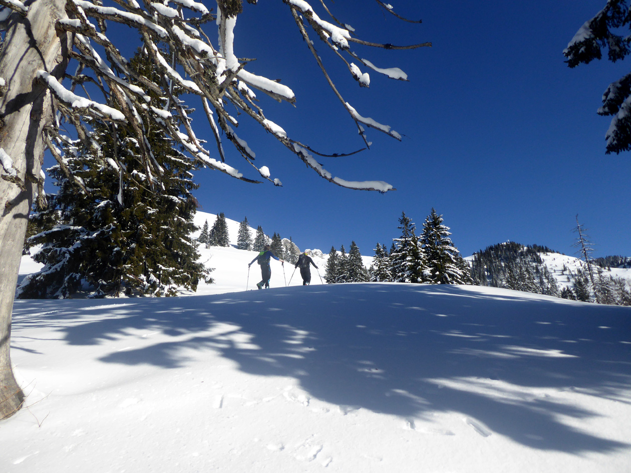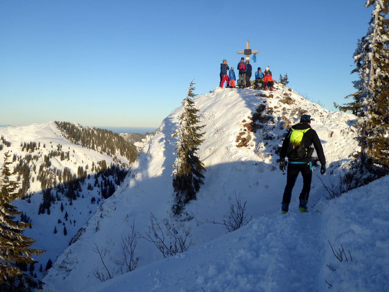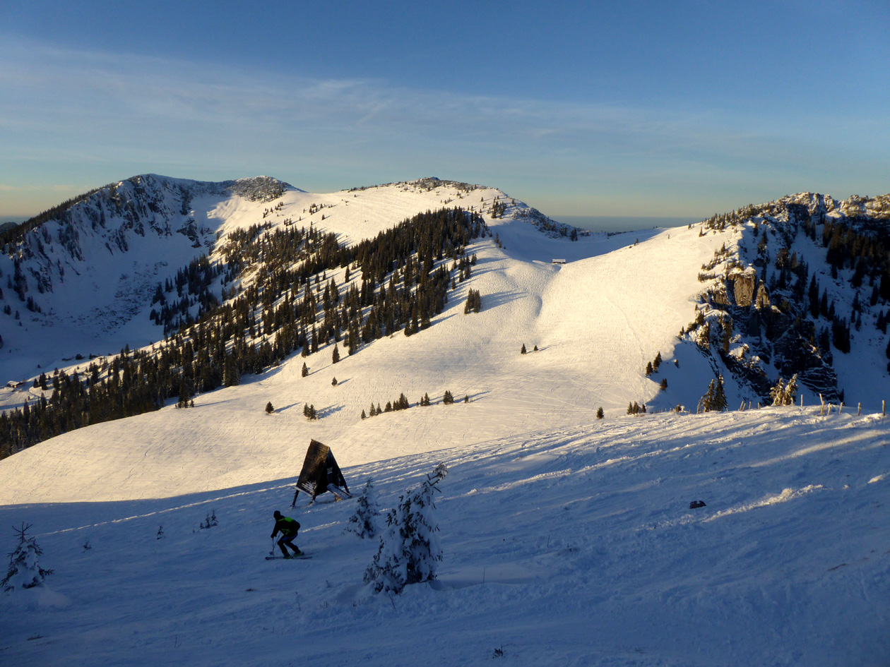 Tourenverhältnisse: Eigentlich hatten wir heute was anderes vor, wir wollten "nur ganz gemütlich" die Tanzeck-Reibn machen. Aber um 8.20 Uhr hat uns am Parkplatz er Taubensteinbahn fast der Schlag getroffen: Die Autos parkten schon kreuz und quer bis an den Rand, und am Beginn des Lochgrabens wuselten gefühlt 500 Leute umher, als ob hier ein Skitourenrennen stattfände. Nee, auf den Massenauflauf hatten wir keine Lust - und so parkten wir bei der Kirche (da ging es noch gang gut), wo 99 Prozent der Tourengeher zur klassischen Rotwandreibn starteten. Mit Marcus und Markus, meinen Lenggrieser Spezln, ging's im Sinne der Bergeinsamkeit woanders hin. Nämlich zunächst zu Fuß Richtung Valepp bis zur Waitzinger Alm (Winterstube), wo wir anfellten und einer Spur (vermutlich vom Vortag, drei Leute) in den eisigen Pfanngraben folgten. Hinter der Petzing-Alm (1120 m) verließen wir den Pfanngraben und spurten gute 90 MInuten teils recht mühsam durch mehr oder minder lichten Wald (hier konnte sich unser Bergwachtler schön verausgaben), ehe wir unterhalb der Wildfeld-Alm wieder auf freies Gelände und kurze Zeit später sogar auf eine Aufstiegsspur stießen. Nun war es bald vorbei mit der Einsamkeit: Die Rotwand rückte näher... Dort herrschte Hochbetrieb - allerdings nichts auf unserer Abfahrtsvariante: Wir sind kurz unterhalb des Gipfels über die Wechte gesprungen und die steile Nordostrinne direkt abgefahren Richtung Großtiefentalalm. Suuuuper Pulverschnee und nicht allzuviele Spuren! Dann wurde wieder angefellt, rauf zum Miesingsattel. Abfahrt über die Kleintefentalalm (geht links bei den Latschen recht gut), nochmal anfellen für den dritten Aufstieg des Tages, zunächst zur Bierpause im Tabensteinhaus und dann, frisch gestärkt, weiter zum Rauhkopf. Dor genossen wir die letzten Sonnenstrahlen sowie Pulver in der Abfahrt über den Westhang, dann folgte das Finale im überraschend gut zu fahrenden Lochgraben (schon ziemlich planiert, aber nur mäßig bucklig und relativ griffig). Fazit: Eine recht ausgedehnte Runde, in der wir trotz der Skitourengehermassen im Spitzinggebiet in den ersten zweieinhalb Stunden keinem einzigen Menschen begegnet sind.