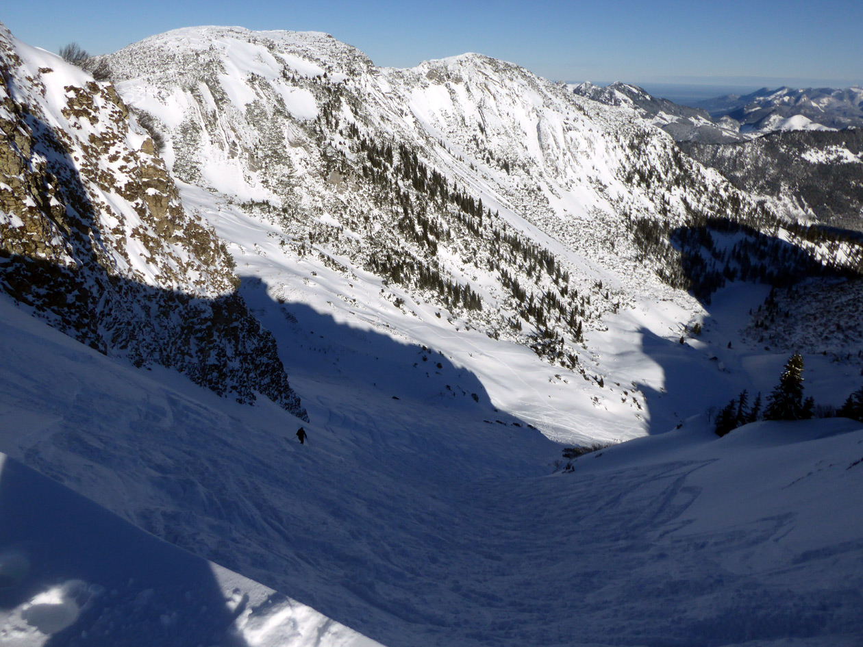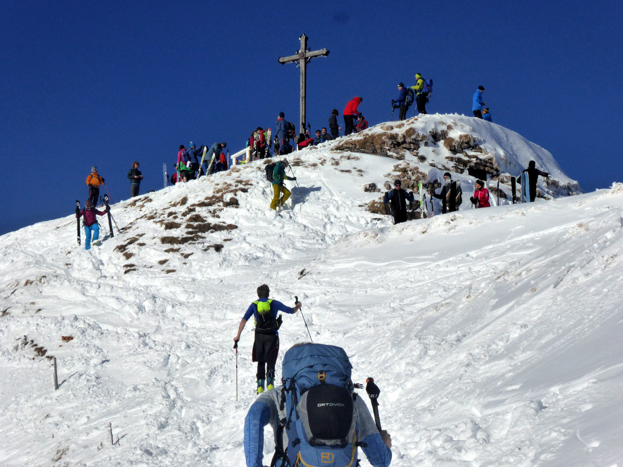 Gefahreneinschätzung: Lawinenrisiko heute bei LWS 1-2 überschaubar, Nordostrinne war absolut vertretbar. Steine konnten meist gut umfahren werden. An der Rotwand (Normalroute) bestand eher die Gefahr, sich in einem der tiefen Löcher, die von unzähligen Bergschuh-Fußgängern auch in die Skitouren-Aufstiegsspuren getrampelt wurden, mit den Skispitzen zu verfangen (wir haben ein paar entsprechende Stürze beobachtet)