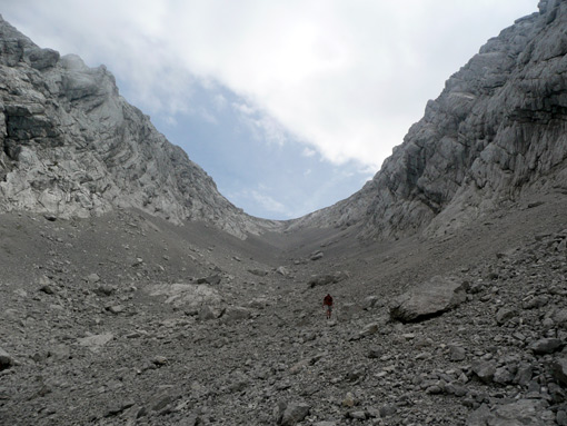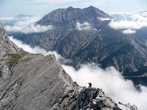 Einsamer kann eine Bergtour kaum sein: Laut Gipfelbuch erhält das Steintalhörndl (2468 m) bei Hintersee in den Berchtesgadener Alpen eher selten Besuch. Kein Wunder: Sowohl der Aufstieg durchs Sittersbachtal als auch der Abstieg durchs Steintal (gegenüber vom Hochkalter) sind nur spörlich mit Steinmandln bzw. oft gar nicht markiert. Mühsames Schotter- und Schrofengelände, ein luftiger Abstiegs-Grat mit Kletterei im Bereich II+ (kurz vielleicht sogar schwieriger) runden diese total einsame, aber landschaftlich wunderschöne Tour ab. Gesamtgehzeit: 8 Stunden / ca. 1700 Hm). Etwas Orientierungssinn erforderlich.