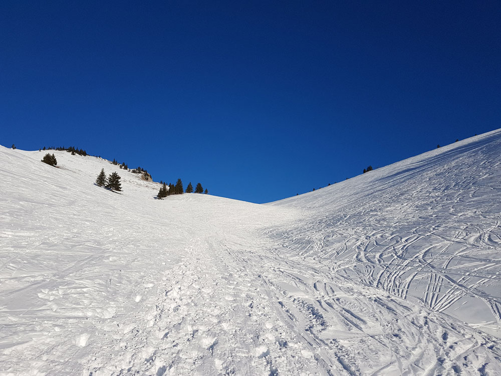 - Richtung Rauhkopf findet man im stark verspurten Hang schon noch einige wenige Pulverfleckerl, aber hier ist Grundberührung nicht auszuschließen, sogar wahrscheinlich.