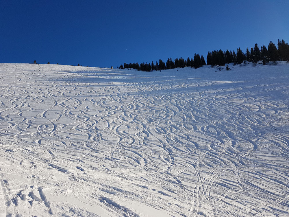 Sonstiges: Große Abschnitte waren von Fußgängern zerpflügt. Teilweise auf einer breiter von 50 m. Mag sein, dass das den Fußgängern gar nicht bewusst ist, aber das ist schon sehr störend und vor allem auch unverständlich, dass man den Hang zu Fuß auf so einer Breite komplett zerpflügen muss. Eine Fußgänger-Spur wäre mein Vorschlag.....vielleicht liest es ja einer.....