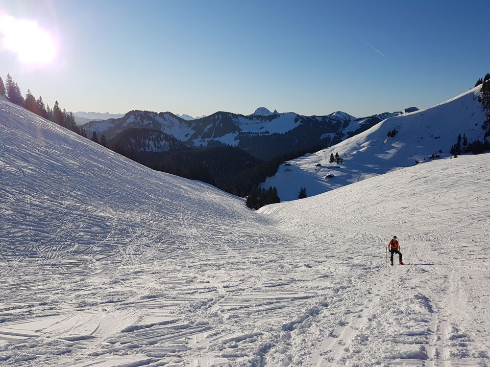 Tourenverhältnisse: Gleich vorweg, die Schneeverhältnisse sind nicht (mehr) besonders, doch das herrliche Wetter macht eine Tour dennoch lohnend.
