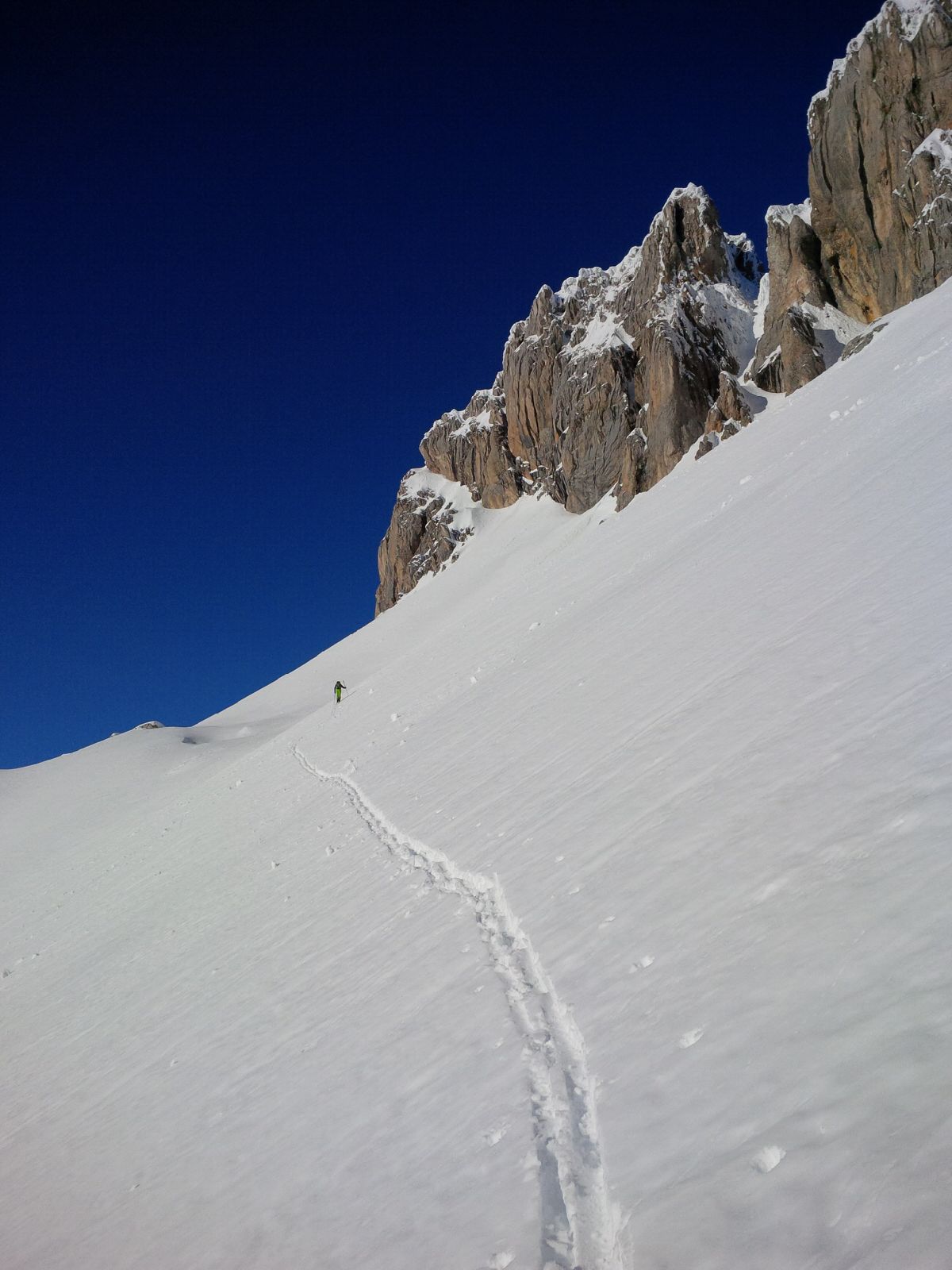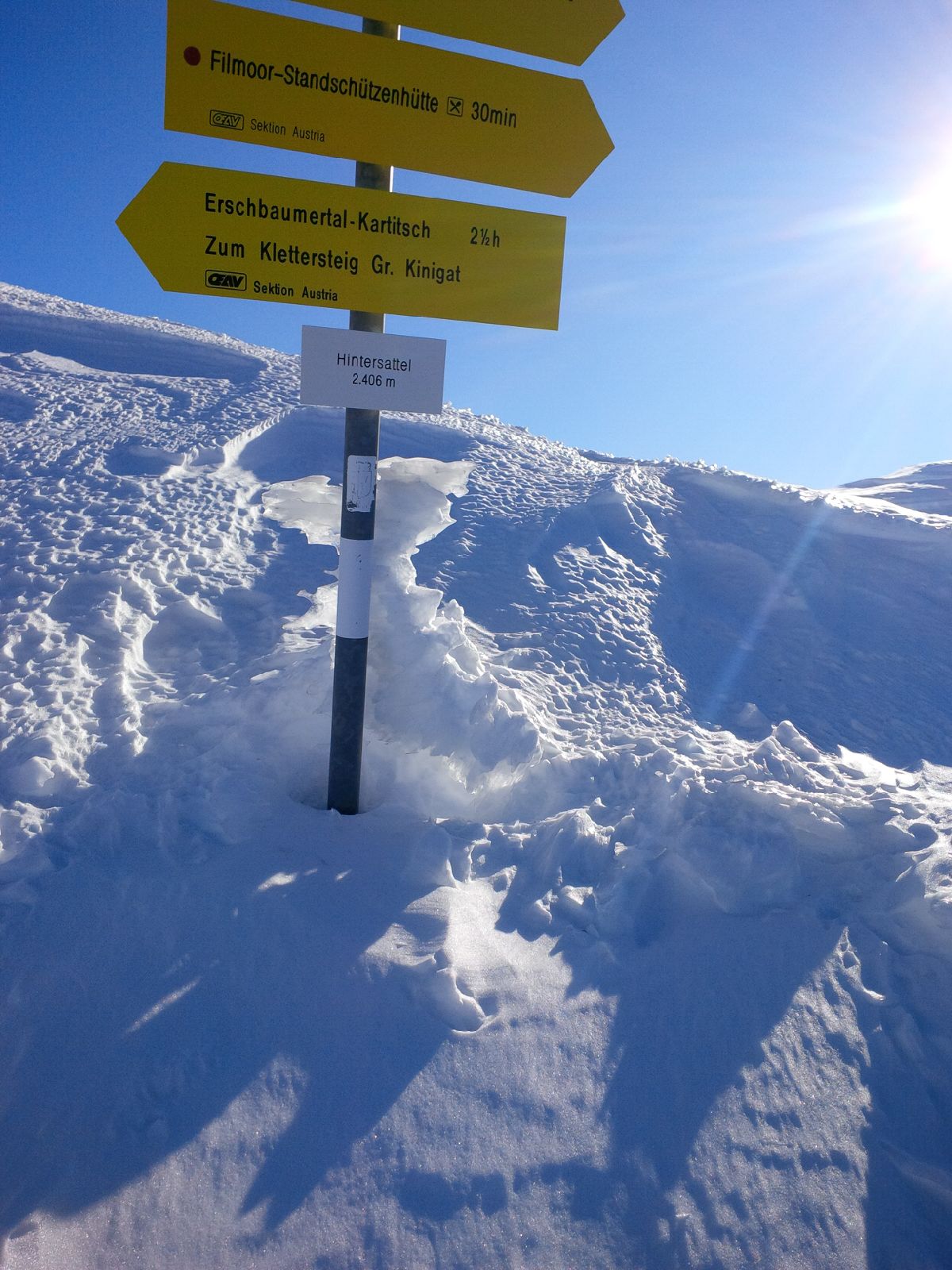 Abfahrt über Filmoorsattel ins Schöntal. Teils windverblasen, teils Pulver, teils Bruch. Im engeren mittleren Teil schöner Pulver, aber stark verfahren durch die Tourengeher der umliegenden Gipfel. Ab Talausgang Schieber über die Loipe zurück hoch zum Kartitscher Sattel.