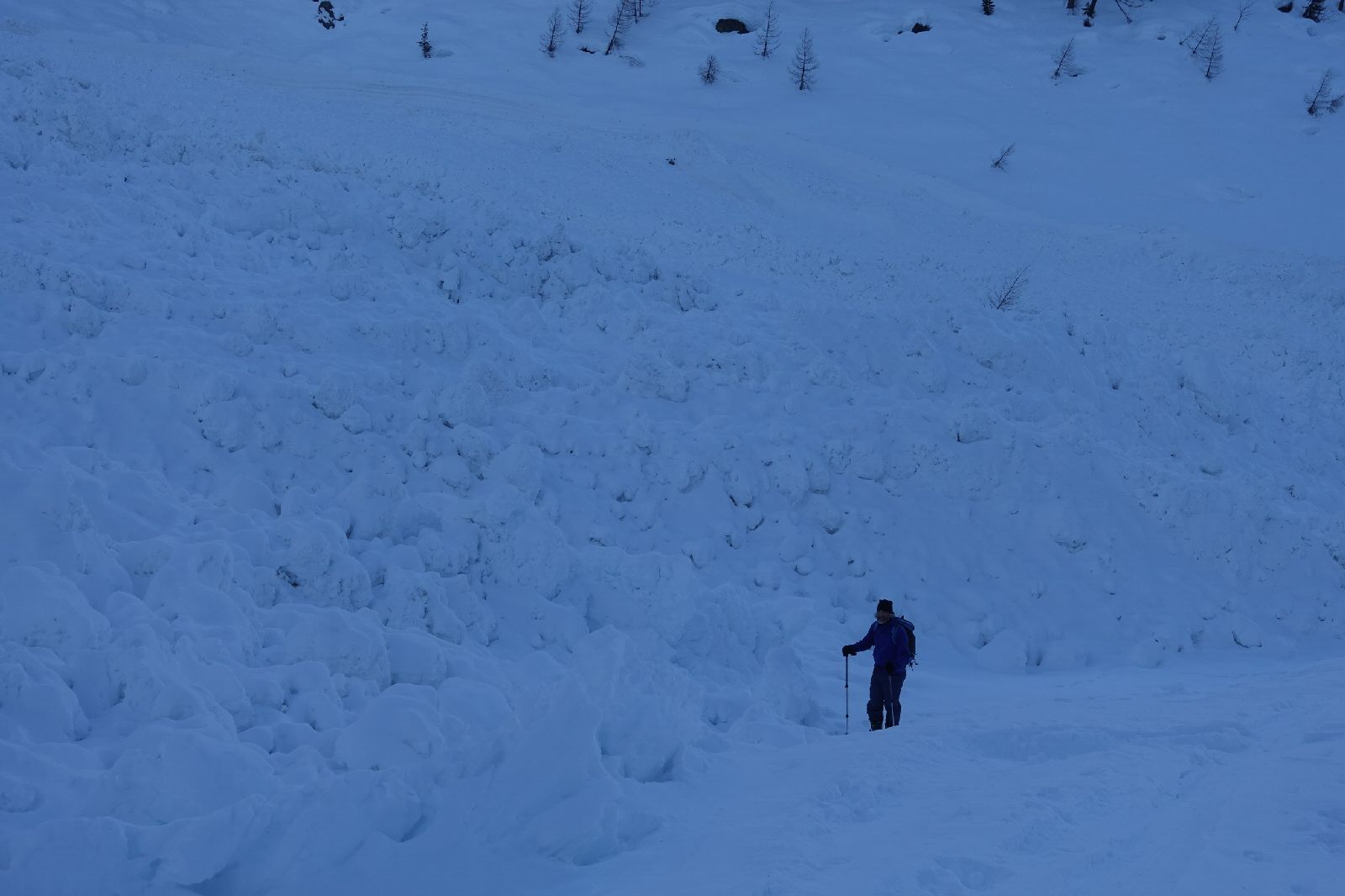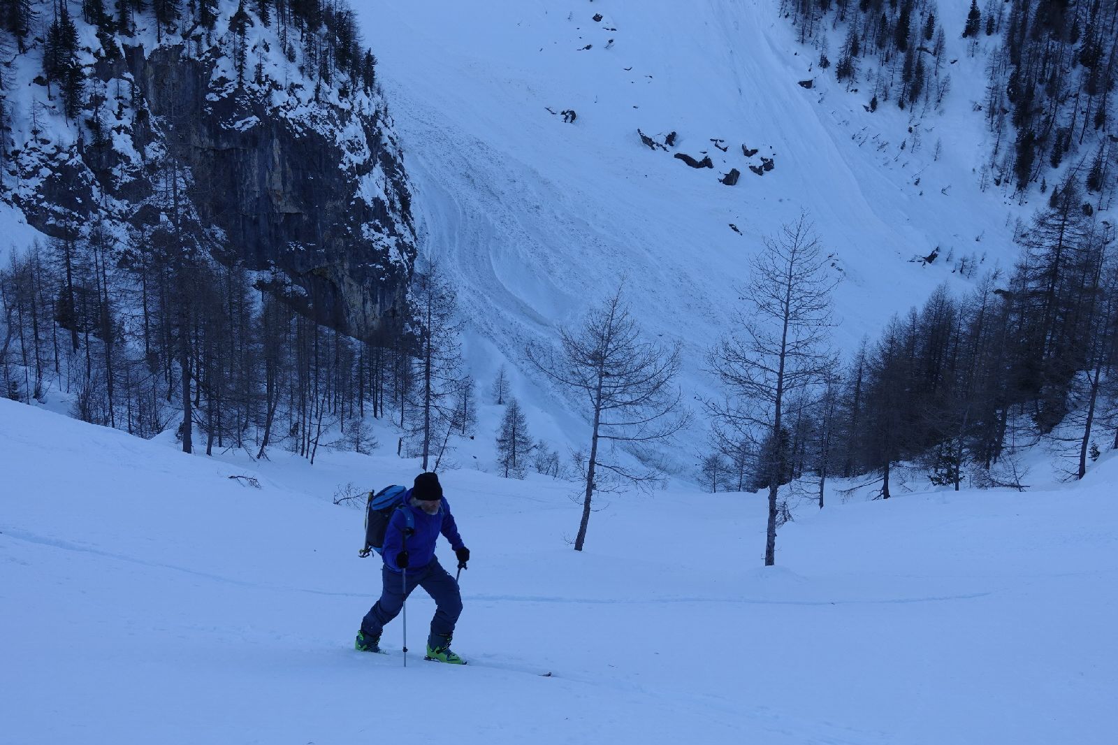 Vom Kartitscher Sattl dem Sommerweg folgend durch den Wald, über viele umgestürzte Baumstämme, teils mühsam. Ab Talmitte viele Grundlawinen, am Talende riesiger Lawinenkegel. Vor uns waren 4 Tourengänger unterwegs gewesen. Ab der Tscharre mussten wir spuren.