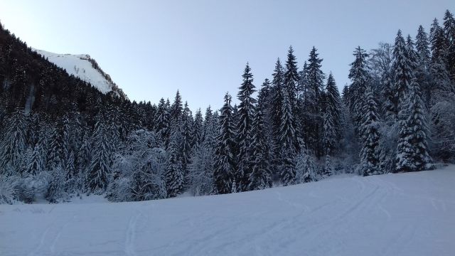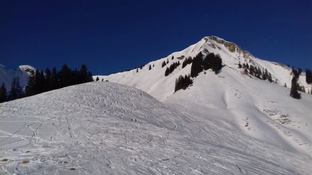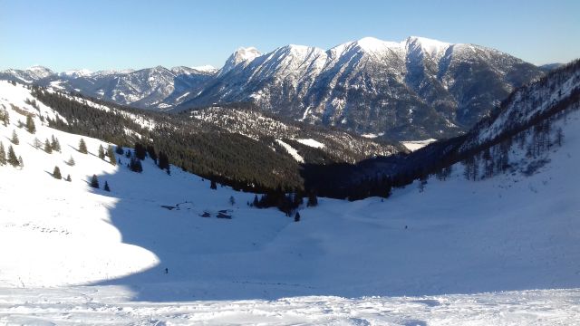Tourenverhältnisse: teilweise pistenmäßig eingefahren, im oberen Bereich findet man aber noch unverspurte Pulverschneebereiche. Abfahrt bis zum Parkplatz ohne Steinkontakt problemlos machbar. Sehr schattige Angelegenheit, Sonne gab's nur ganz oben im Gipfelbereich.