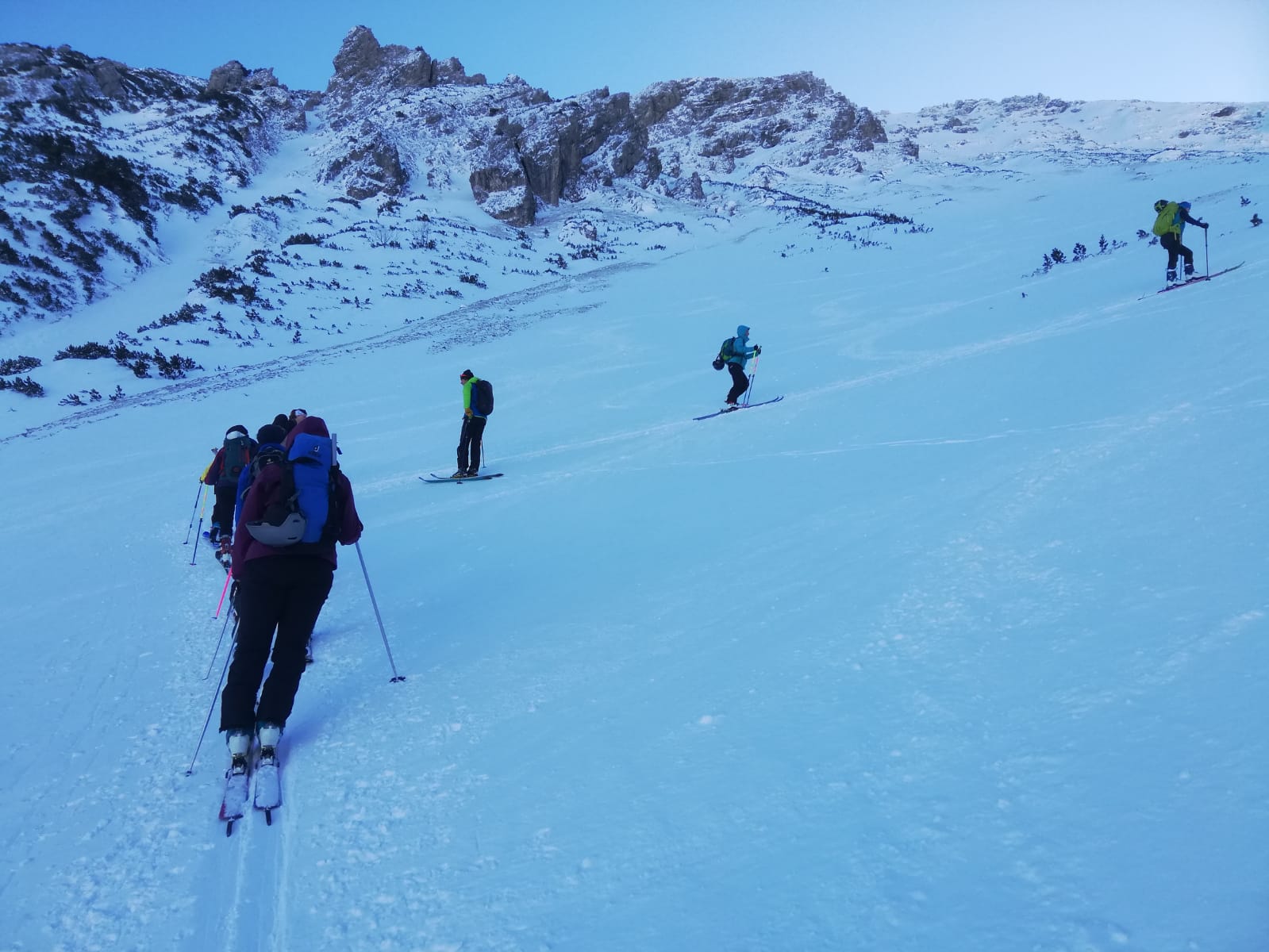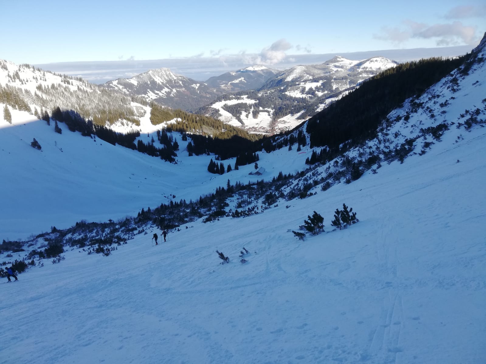 Tourenverhältnisse:Schnee ab Straße. Links oberhalb des Stuibentals mit Ski auf dem Sommerweg hoch, im Wald ein paar Meter kaum Schnee. Später über eine Piste weiter, einen Schlepplift querend, zur Stuibensennalp und durch das folgende Kar zum Sattel (ca. 1900m). Von hier zu Fuß zum Gipfel, alles eingetreten, dadurch aber teilweise glatt, manchmal eisig. Die Abfahrt war besser als erwartet. Unterhalb der Scharte hart und ein paar Steine zum Umfahren,dann etwas gepresster Pulver auf guter Unterlage, gut zu fahren. Durch die Latschenzone pistenartig eingefahren, dann ohnehin Piste.Diese war hart, weiter unten auch immer wieder Steine und eisige Stellen.