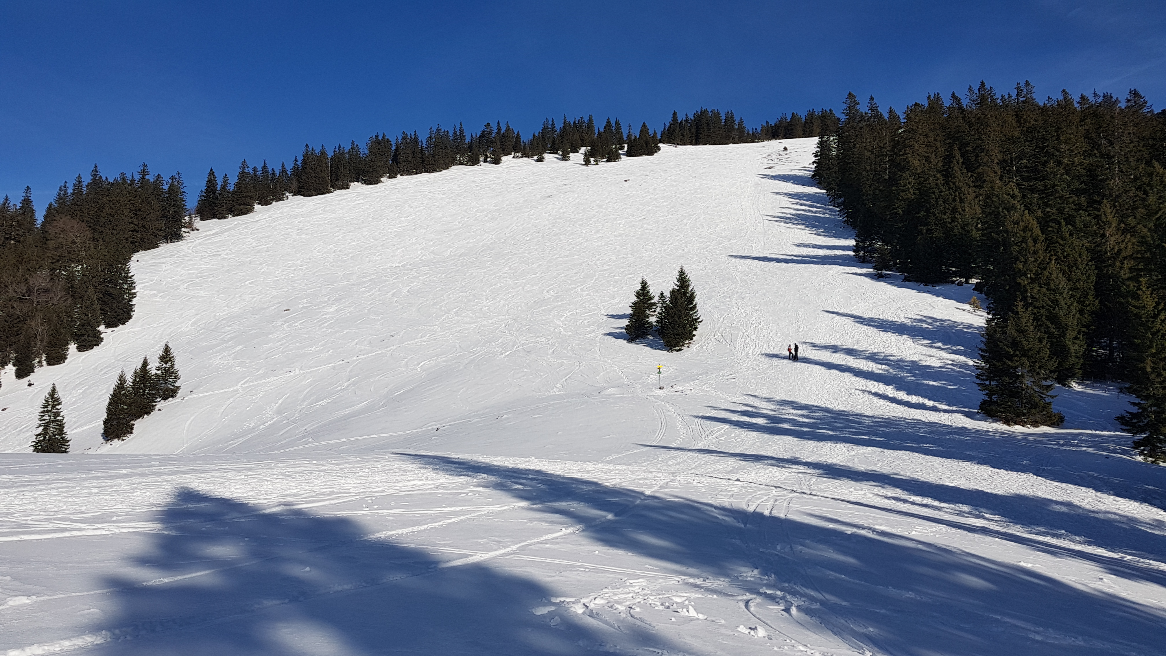Tourenverhältnisse: Erstaunlich gut. Der wunderschöne Gipfelhang hat wenig, aber ausreichend Schnee. Es ist alles so gut gesetzt und zudem pistenmäßig eingefahren, dass auch die geringe Schneeauflage genügt. Einige Steine kann man gut erkennen und umfahren. Durch die sonnseitige Lage ist der gut eingefahren Schnee auch schön weich, fast schon firnig, und so war es gegen Mittag perfekt zum Skifahren.
