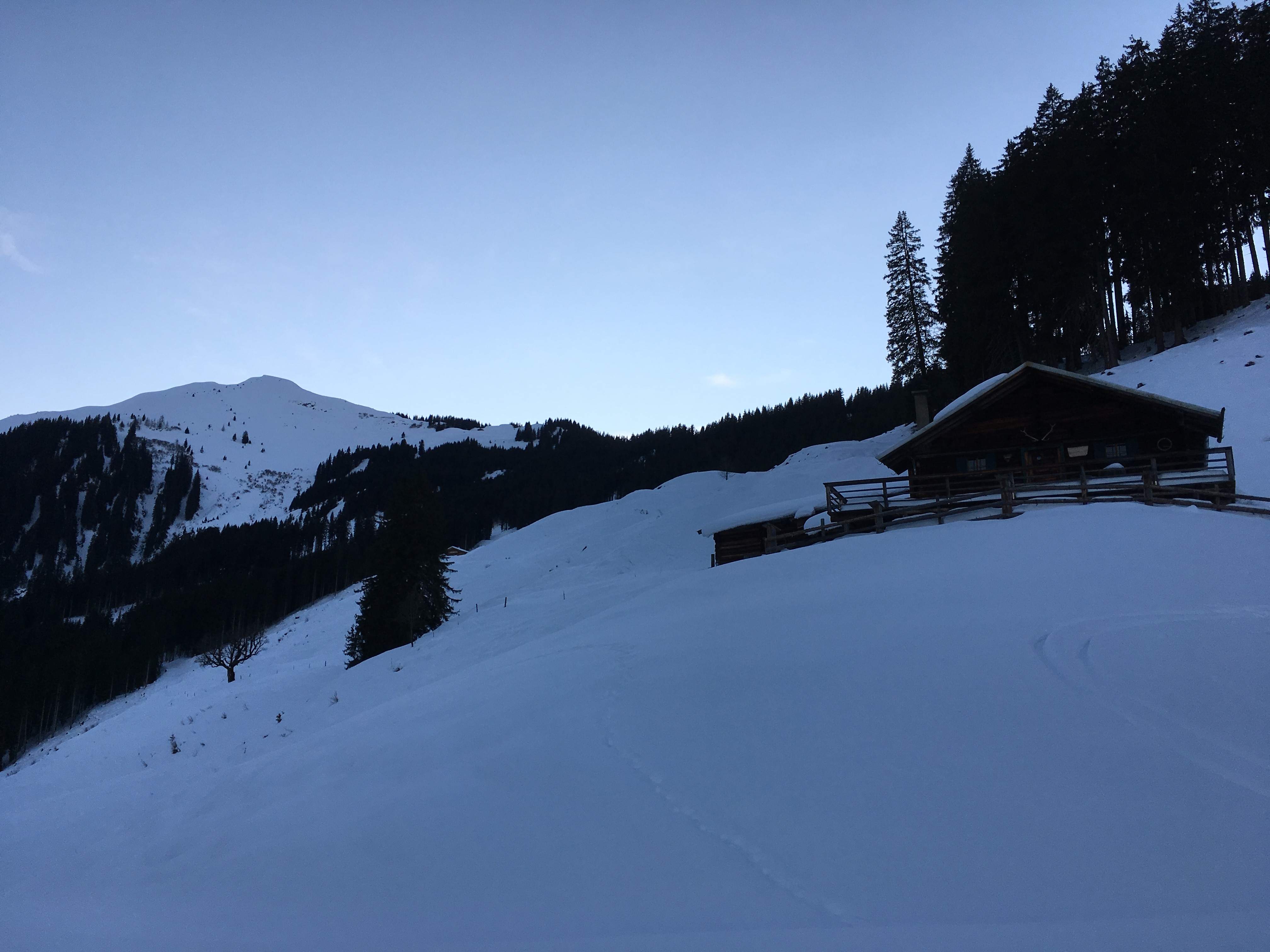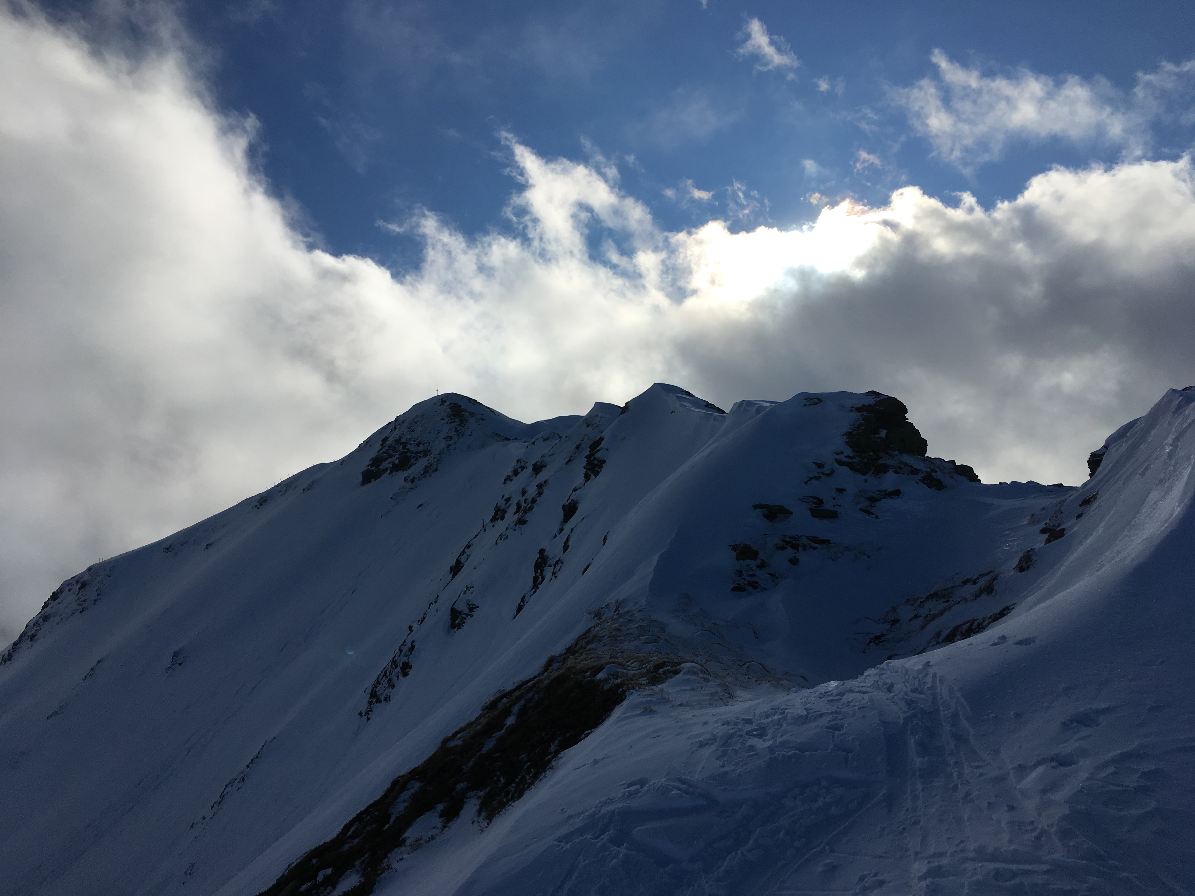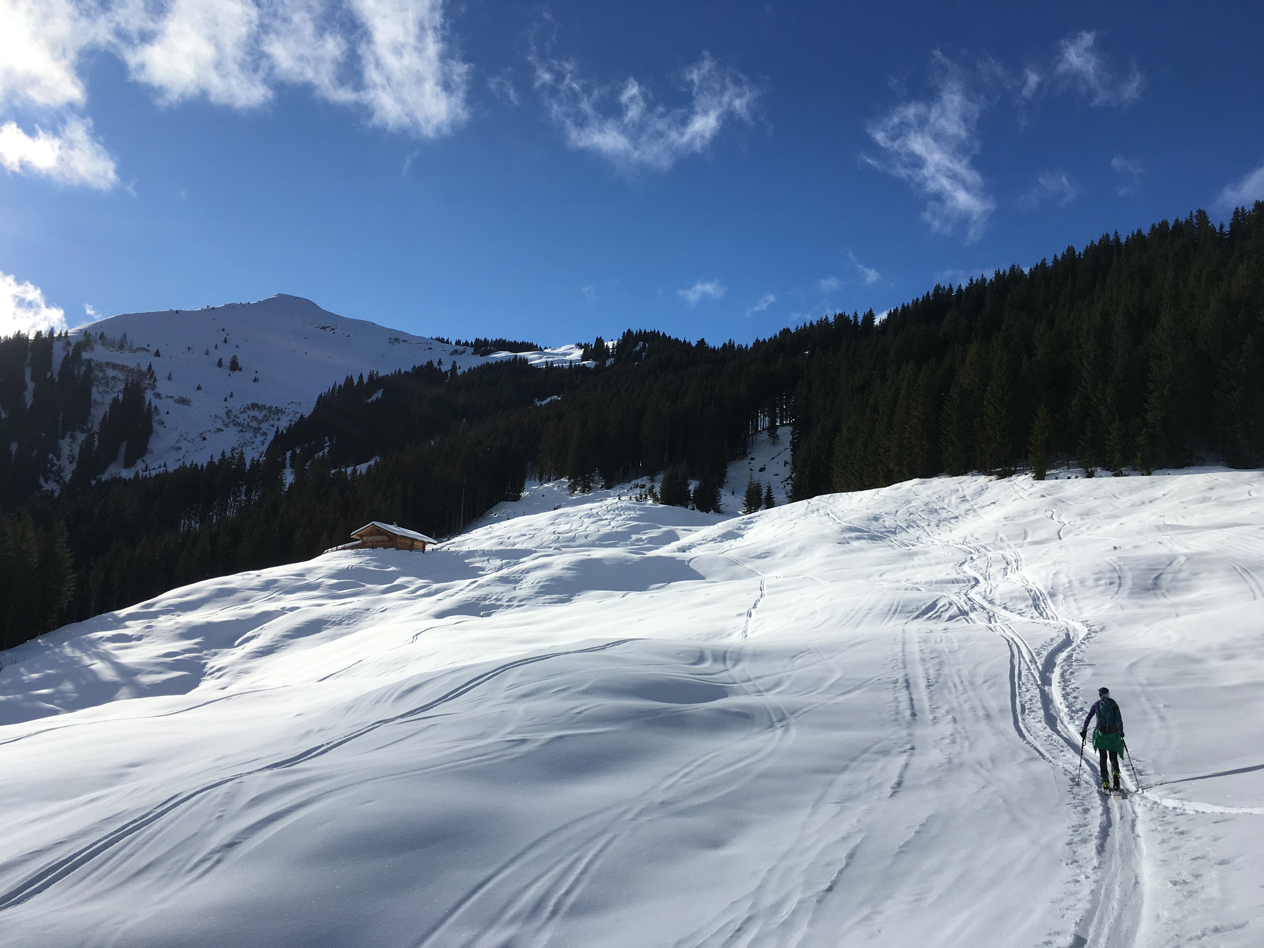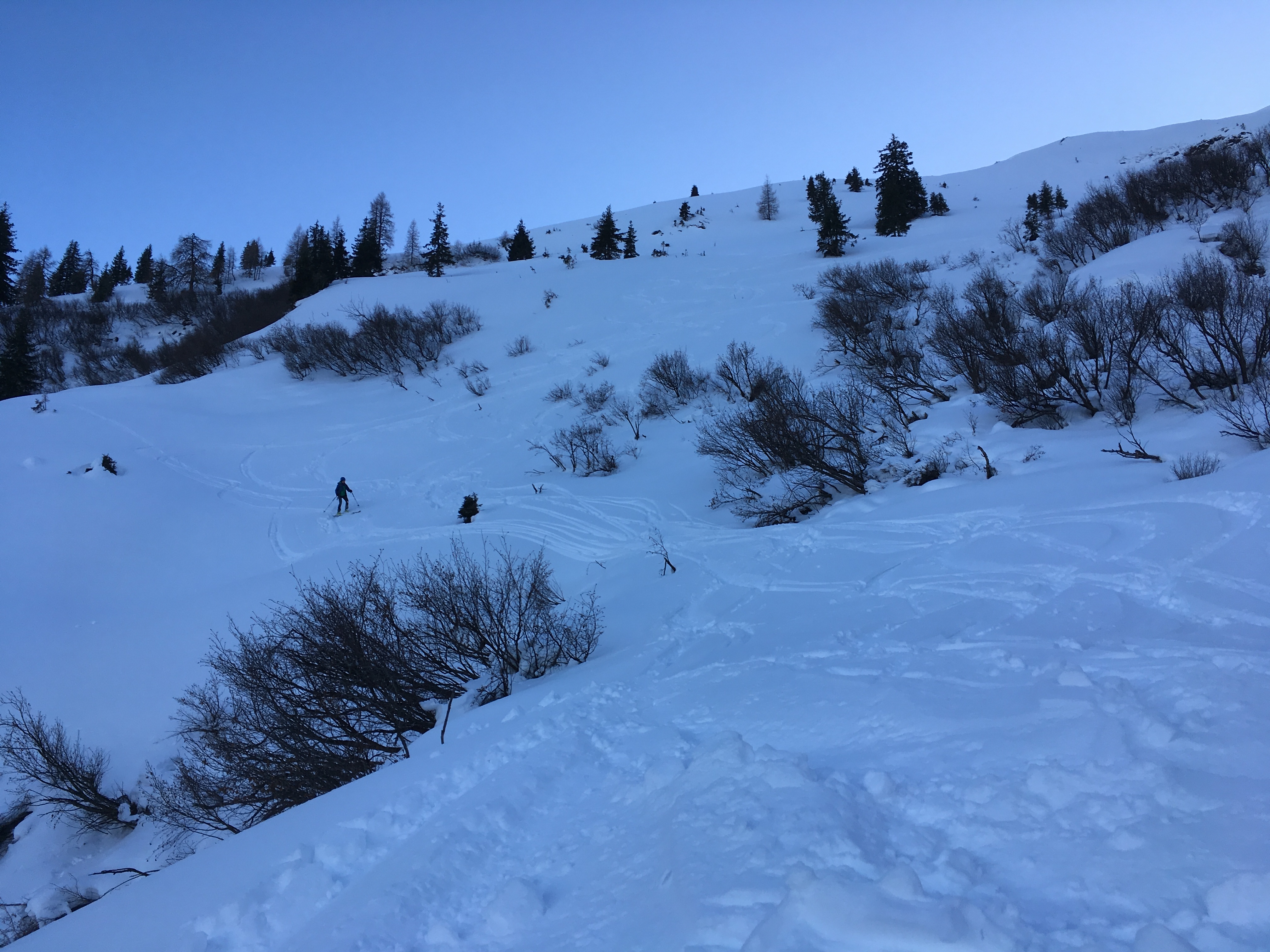 Tourenverhältnisse: Schnee von unten weg, Forststraße hat schon einige kleinere Steine, auf die Acht zu geben ist; bis ca. 1.500 m hinauf bruchharschig, oben auch gute Pulverhänge wechselnd mit windgepressten, abgewehten und eisgigen Stellen