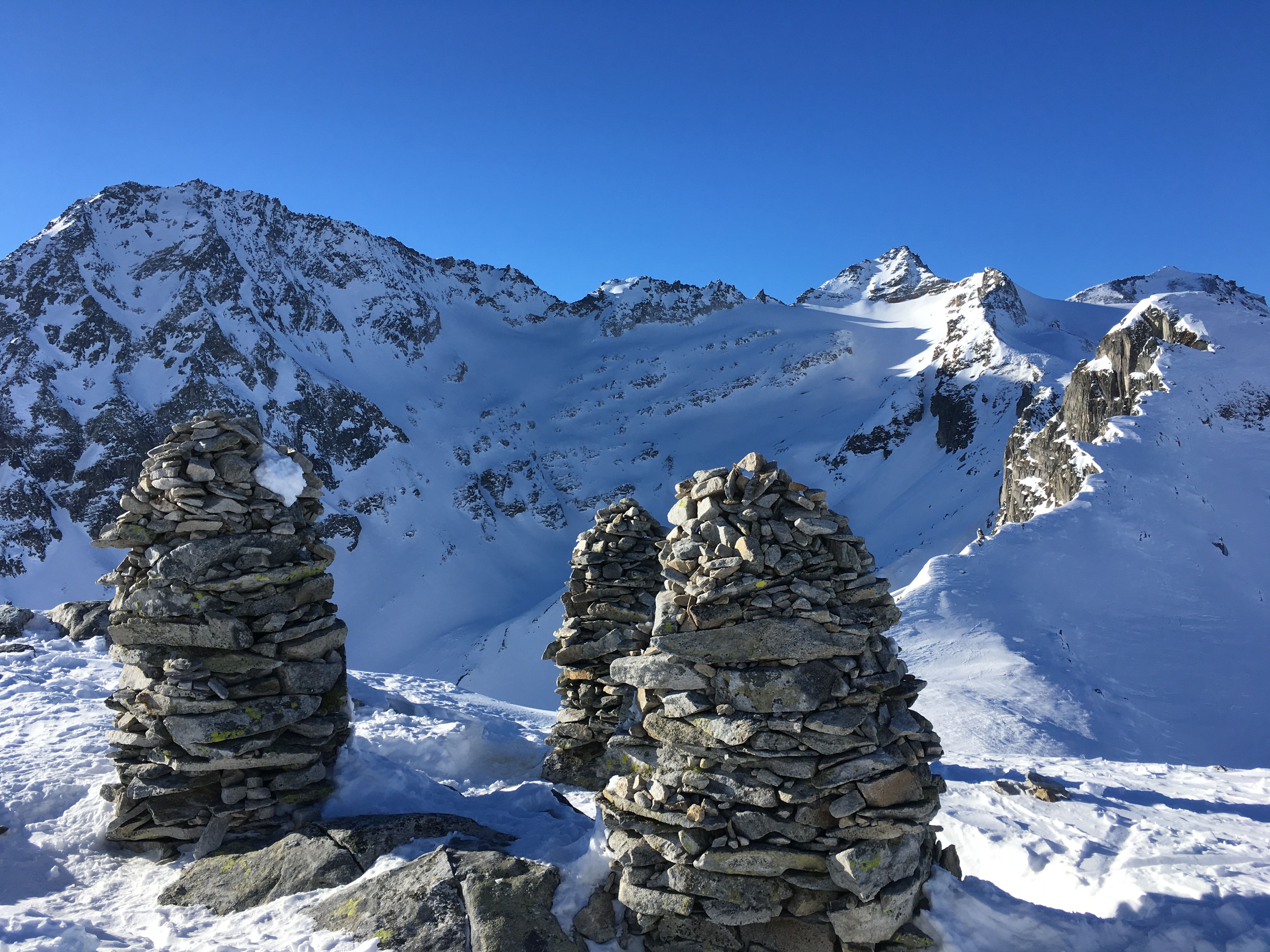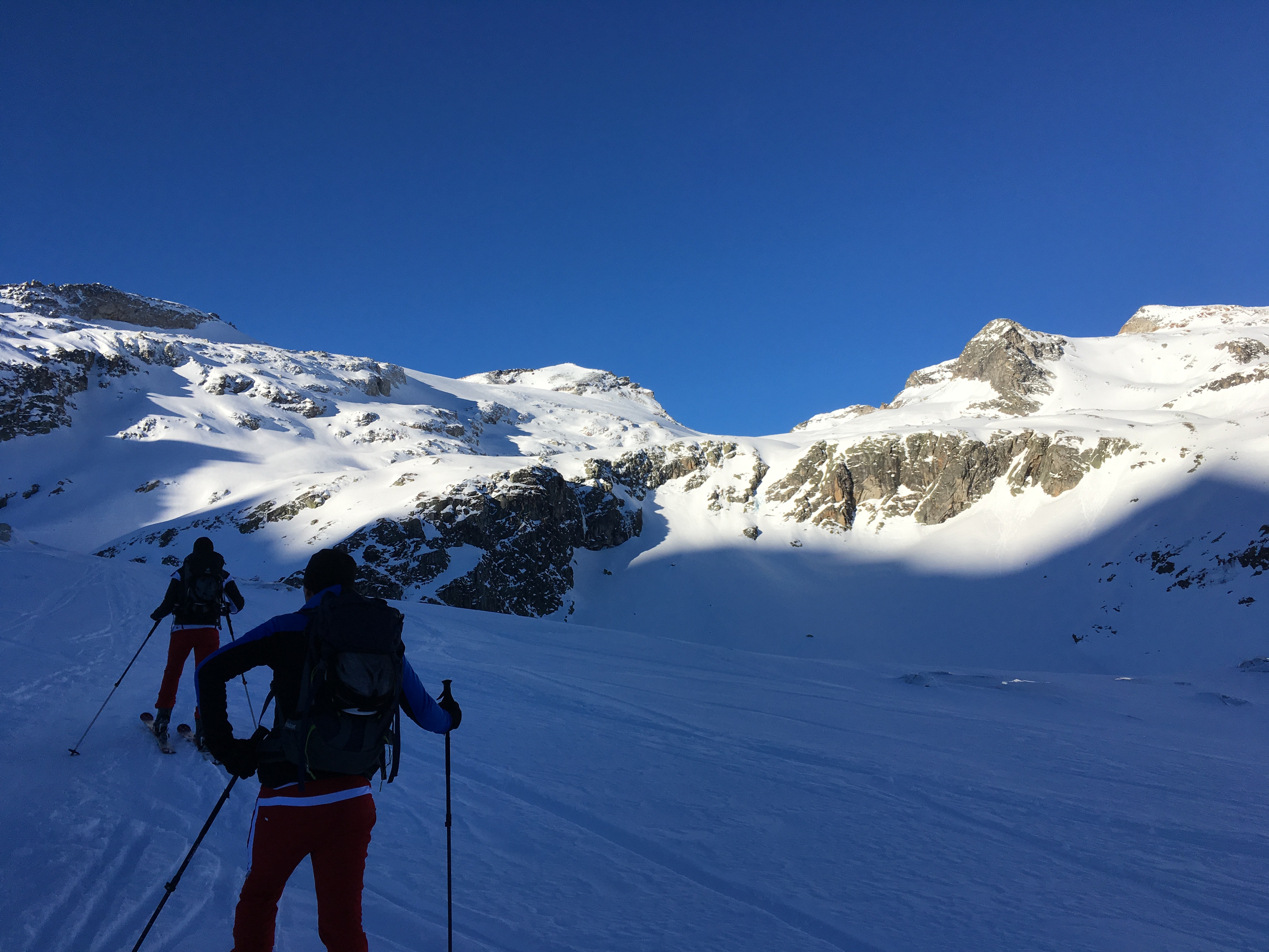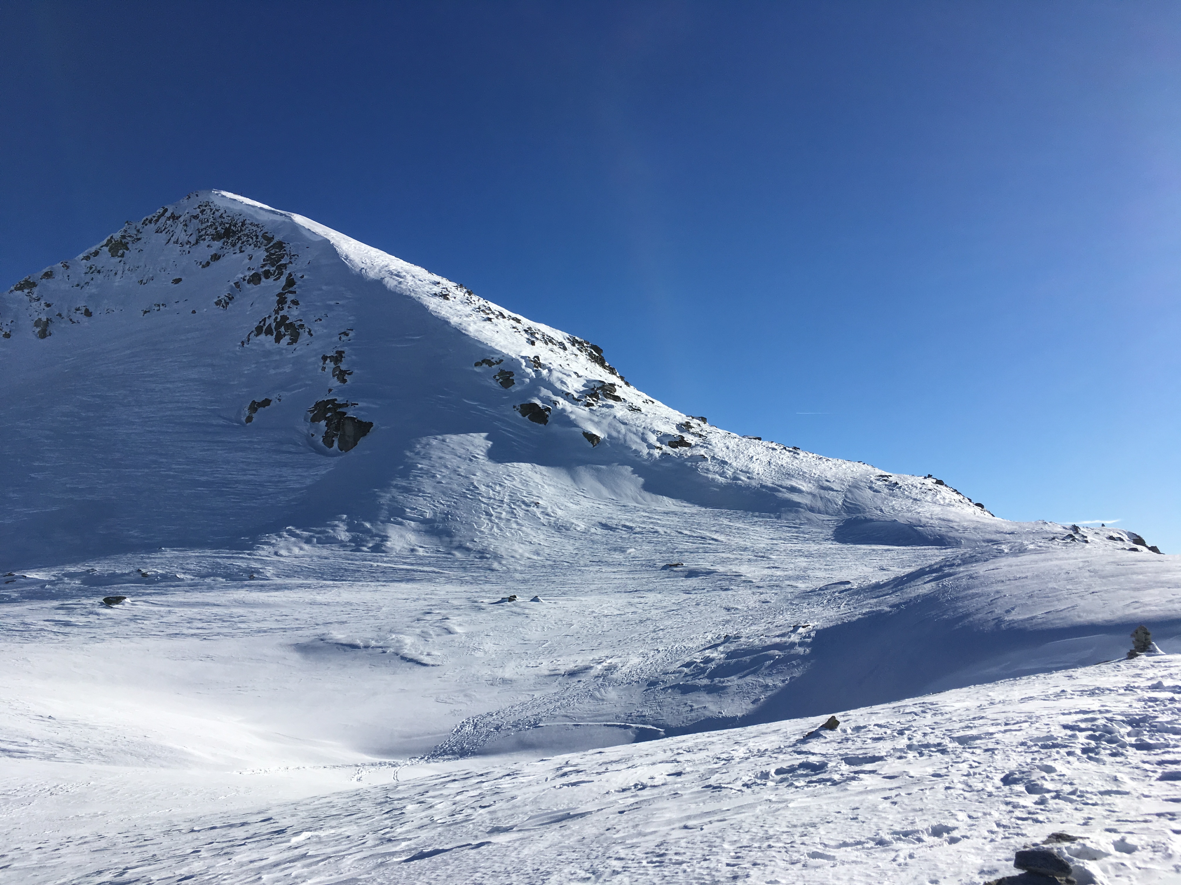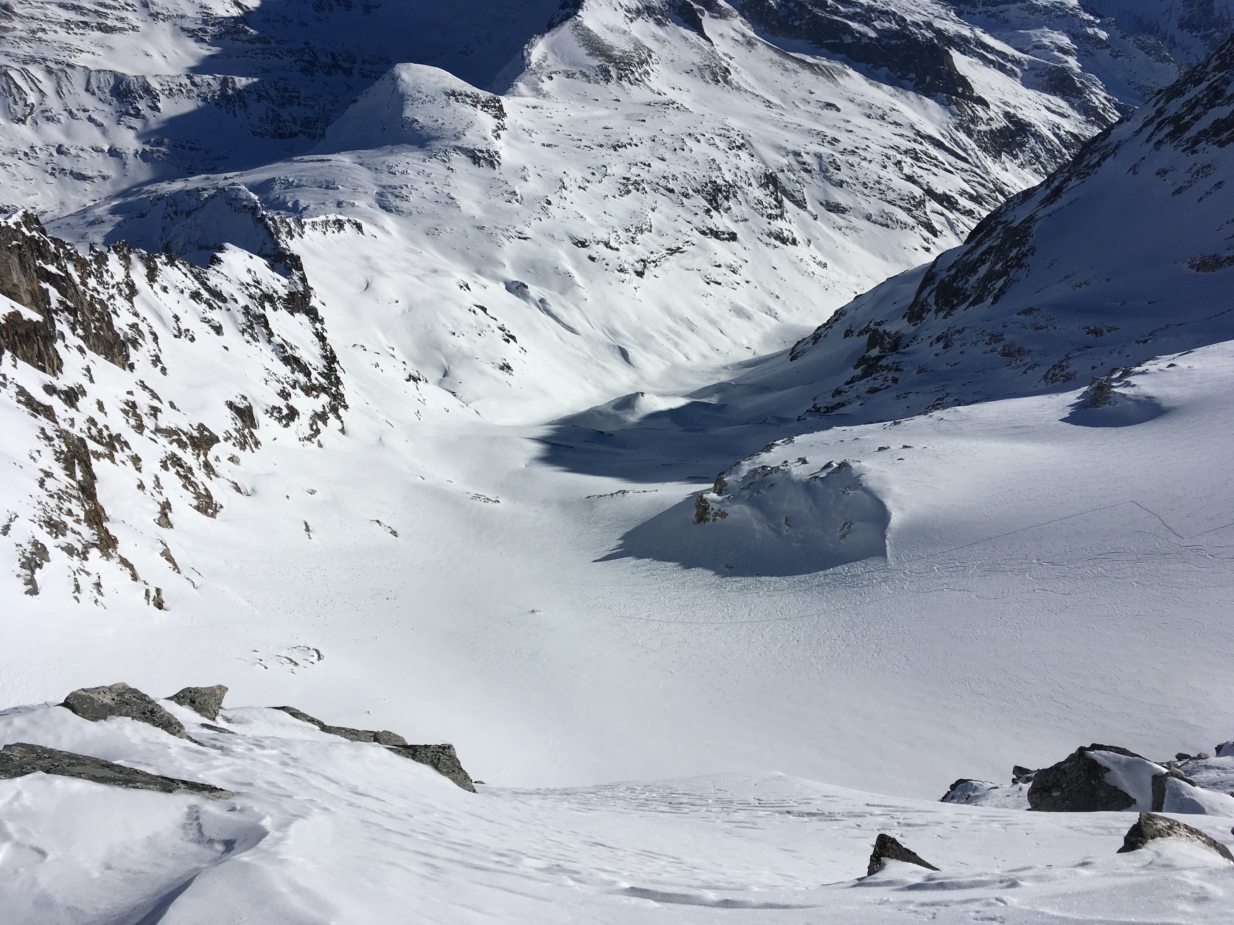 Tourenverhältnisse: Schnee von unten weg, Talabfahrt ist teilweise etwas eisig; im freien Gelände sehr unterschiedliche Schneebeschaffenheit von schön pulvrig über harschig bis windgepresst (insgesamt aber für die derzeitige Situation nicht schlecht)