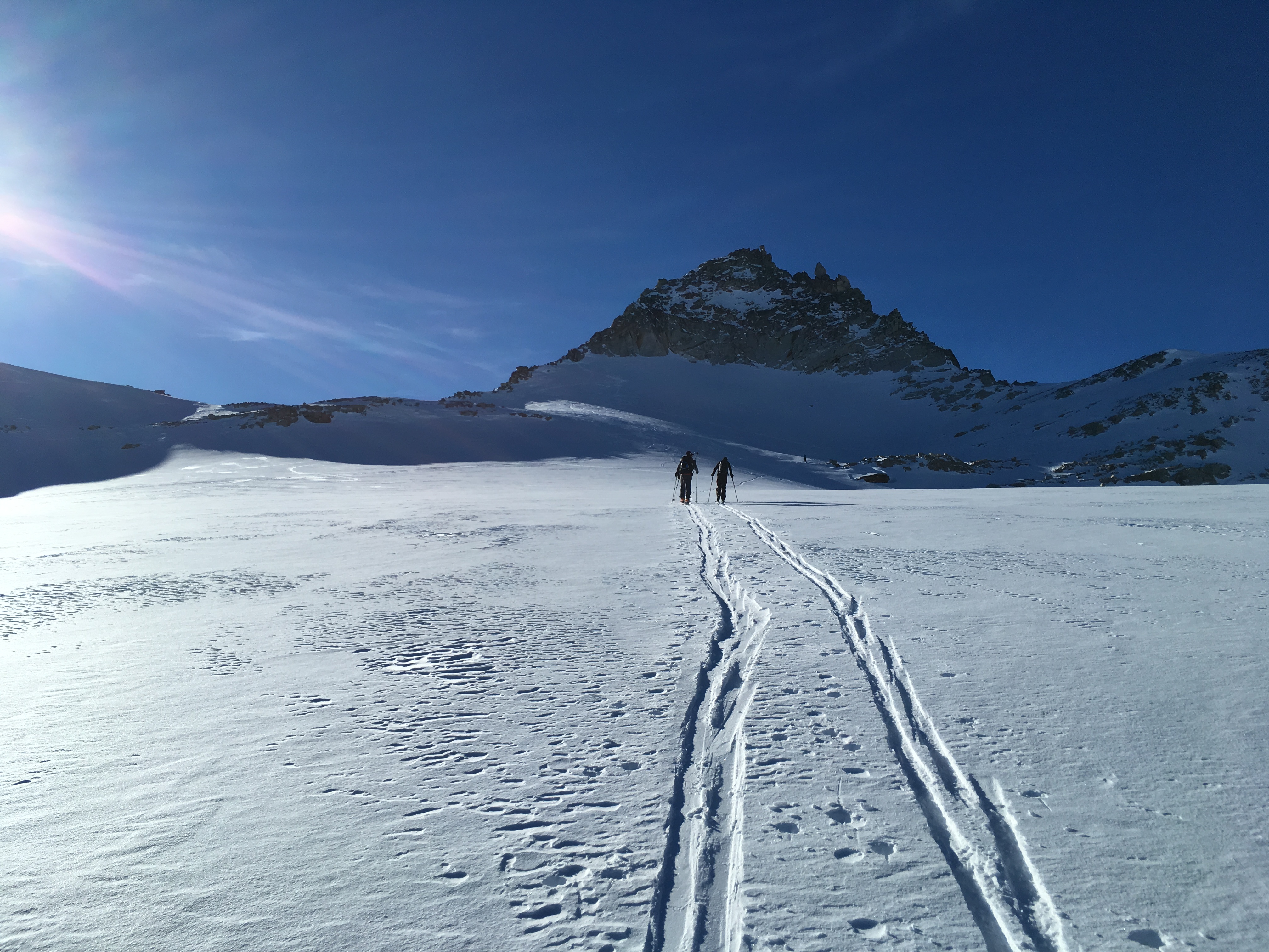 Tourenverhältnisse: Schnee von unten weg, Talabfahrt ist teilweise etwas eisig; im freien Gelände sehr unterschiedliche Schneebeschaffenheit von schön pulvrig über harschig bis windgepresst (insgesamt aber für die derzeitige Situation nicht schlecht)