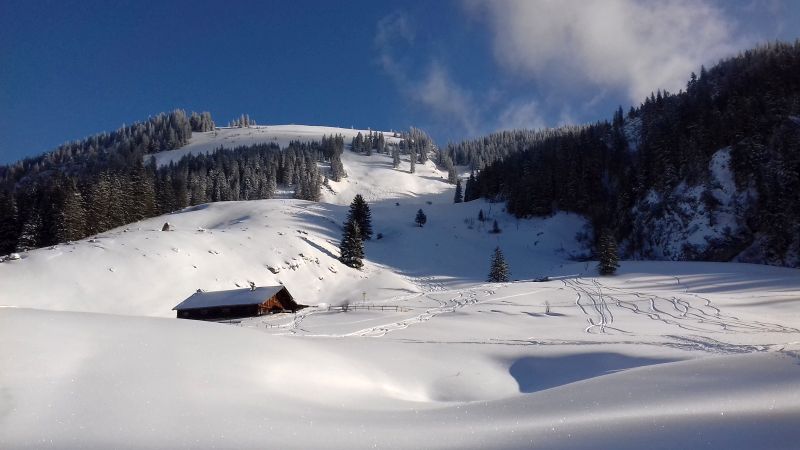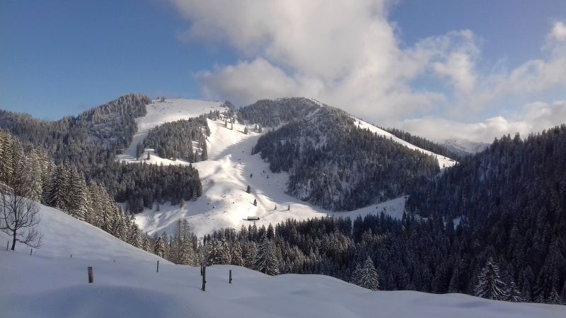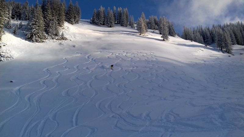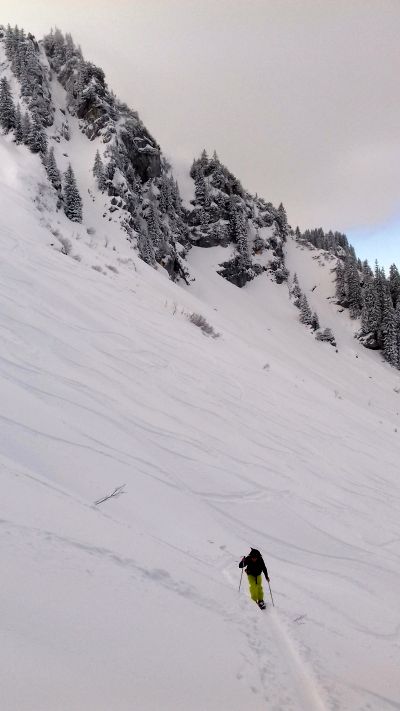 Tourenverhältnisse: Am Vormittag wolkenloser Himmel, im Tagesverlauf zogen dann immer wieder einige Wolkenfelder durch. Sehr angenehme Temperaturen mit kaum Wind. Brecherspitz inkl. Freudenreichabfahrt ist gut eingefahren, nur passagenweise findet man noch unverspurte Bereiche. Bei der Abfahrt zur Freudenreichalm hinunter lauern einige üble Steine unter der Neuschneeauflage. Danach Aufstieg über das Bodenschneidhaus auf die Bodenschneid mit anschließender Direktabfahrt zur Firstalm. Die sehr steile Einfahrt ist etwas unangenehm (abgefahren, Gras, Steine) danach aber Pulver satt.