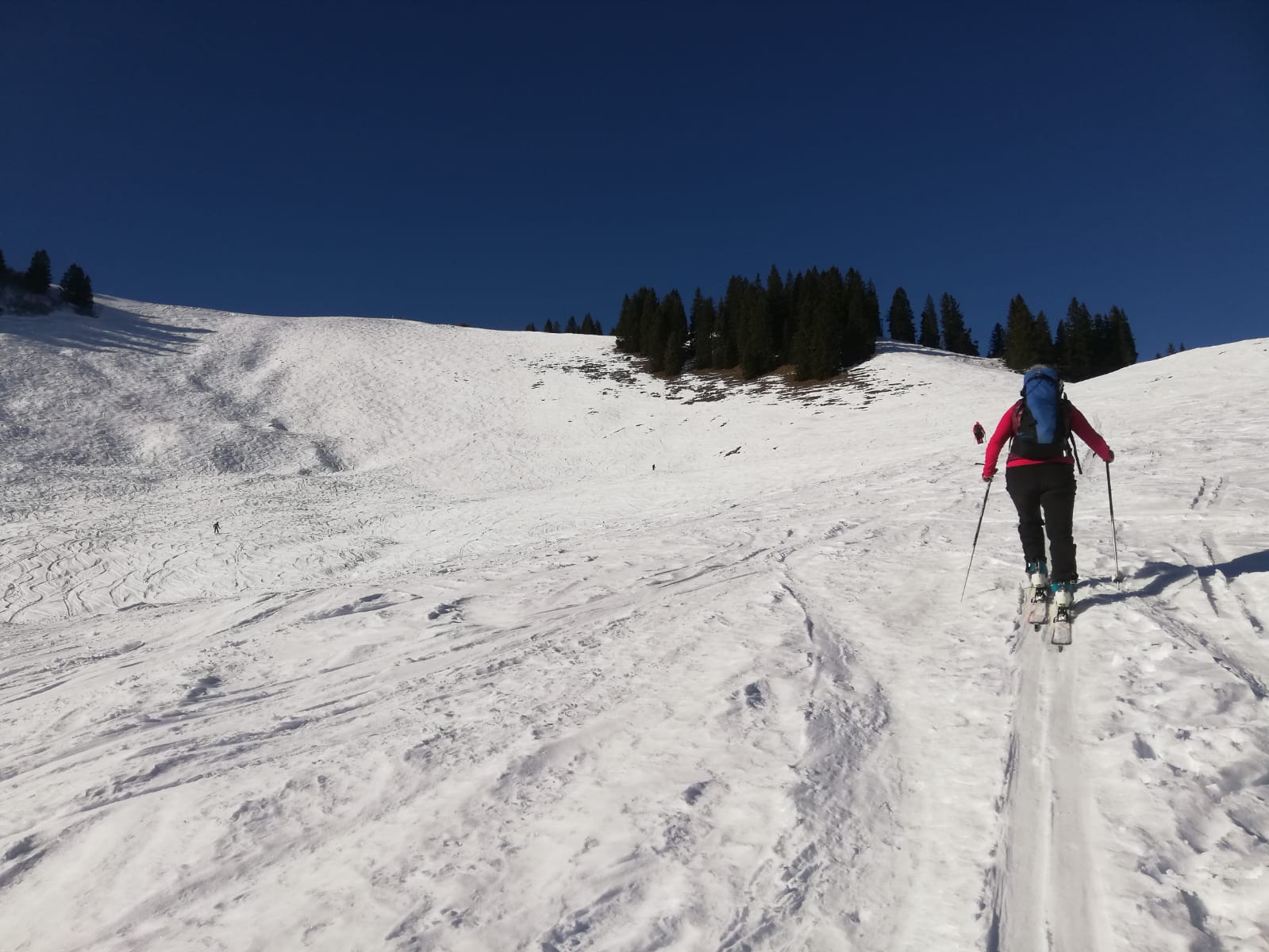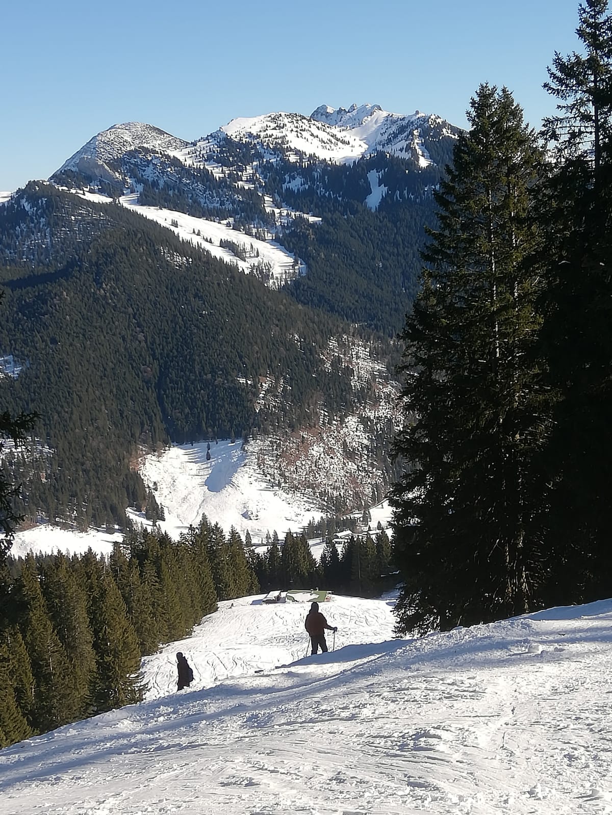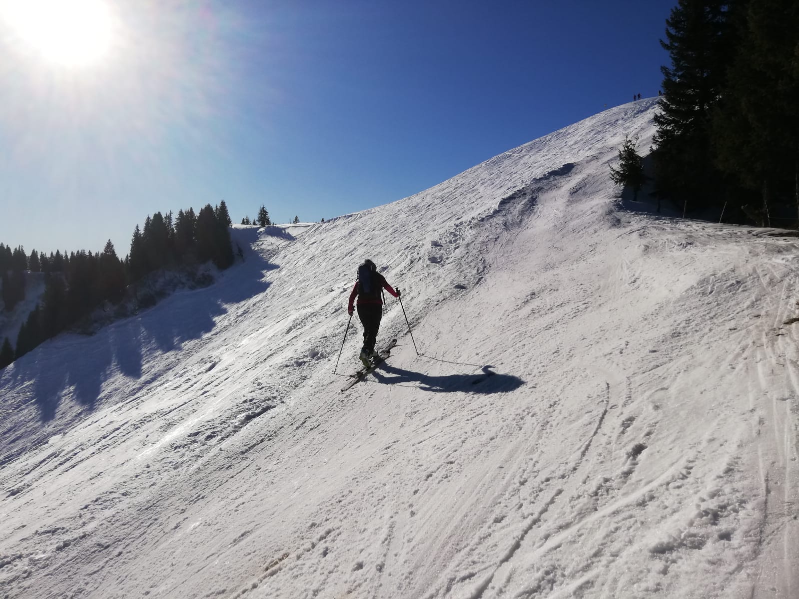 Tourenverhältnisse: Ordentlich. Aufgrund des abschreckende Berichts zum Hirschberg wählten wir wieder Mal das schneesichere Spitzinggebiet. An ein paar Stellen schauen Dreck oder Steine raus, diese sind aber gut zu erkennen. Fast Pisten mäßig eingefahren. Schnee am frühen Nachmittag sonnseitig weich, gut zu fahren. Im untersten Teil der Abfahrt einige eisige Stellen.