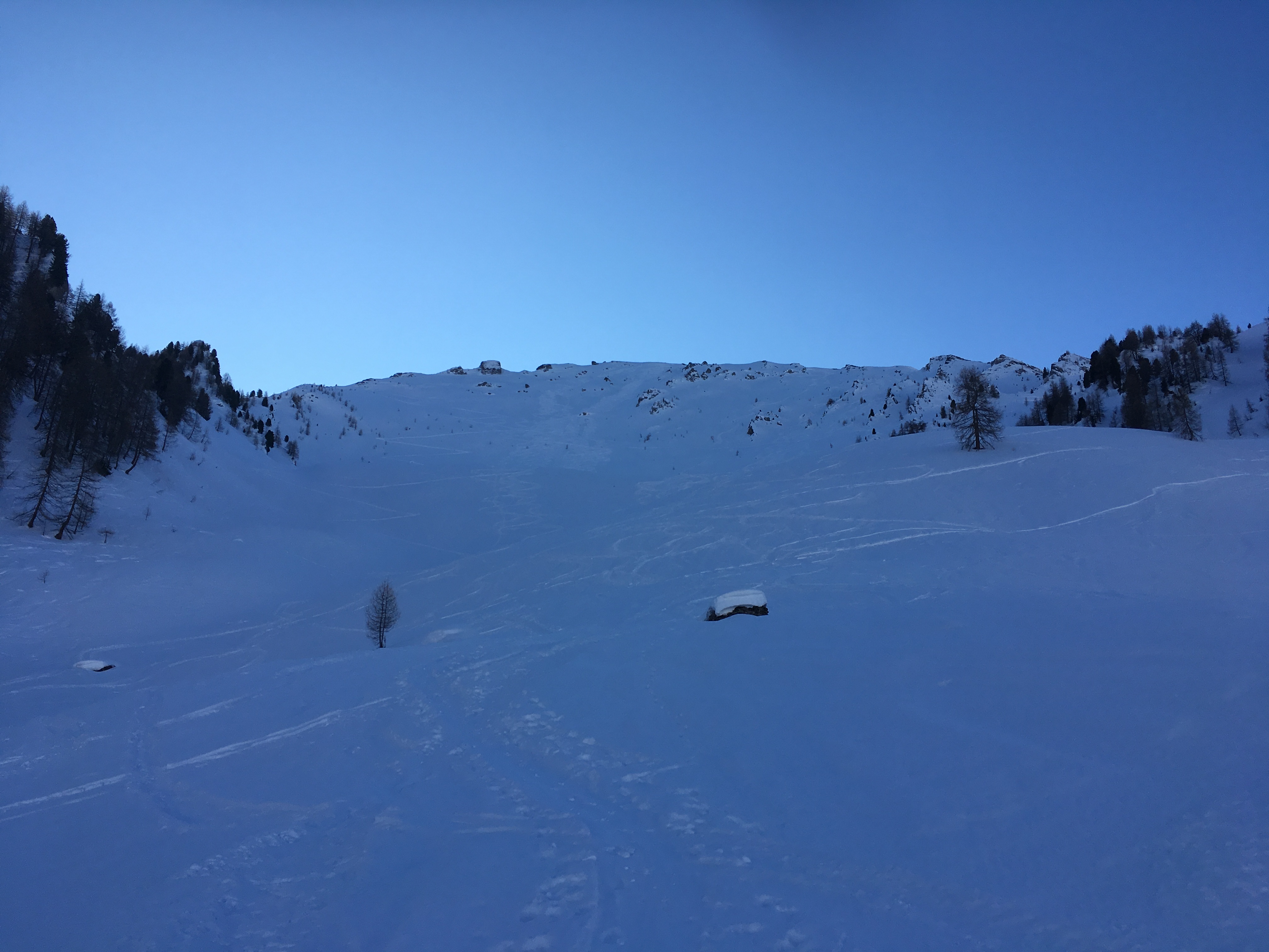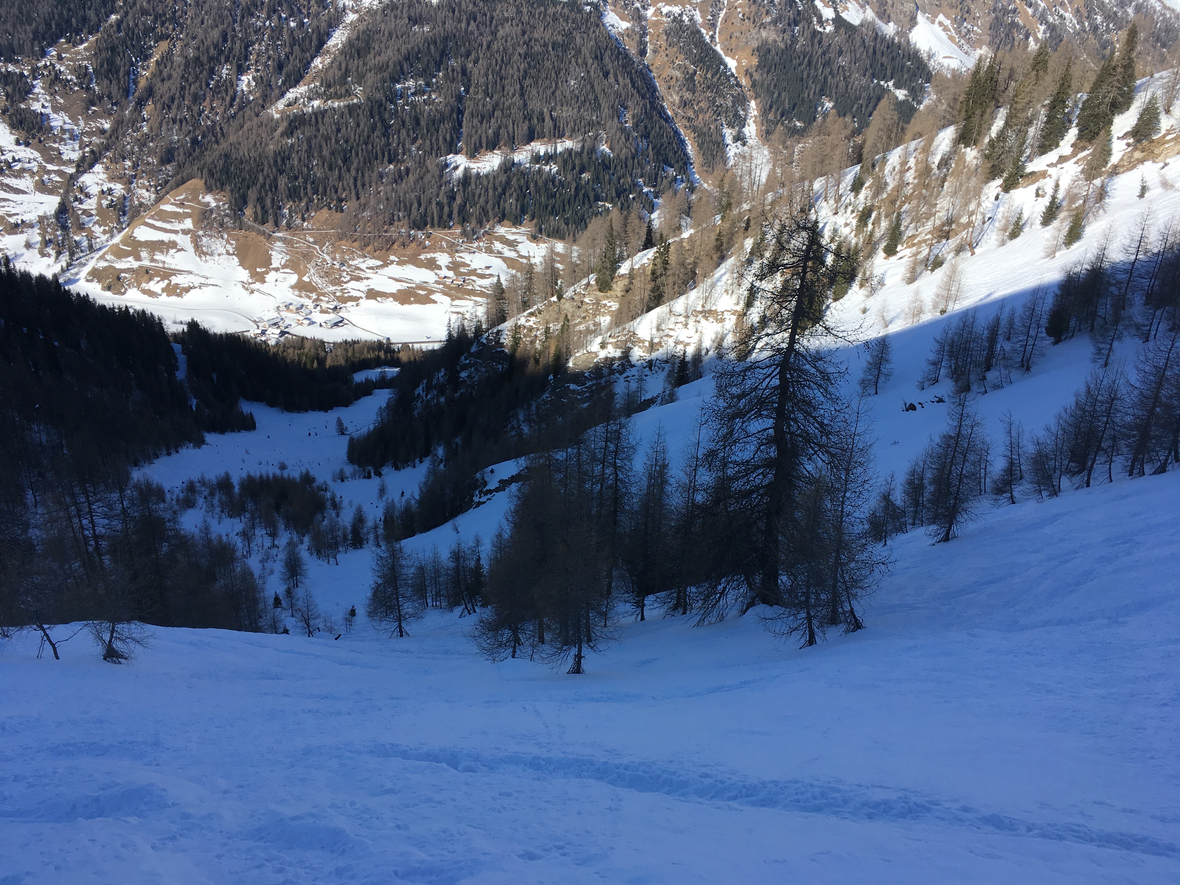 Die Abfahrtsschneise vom Jochgrubenkopf nach Kasern - unten wie eine Halfpipe (zerfahren):