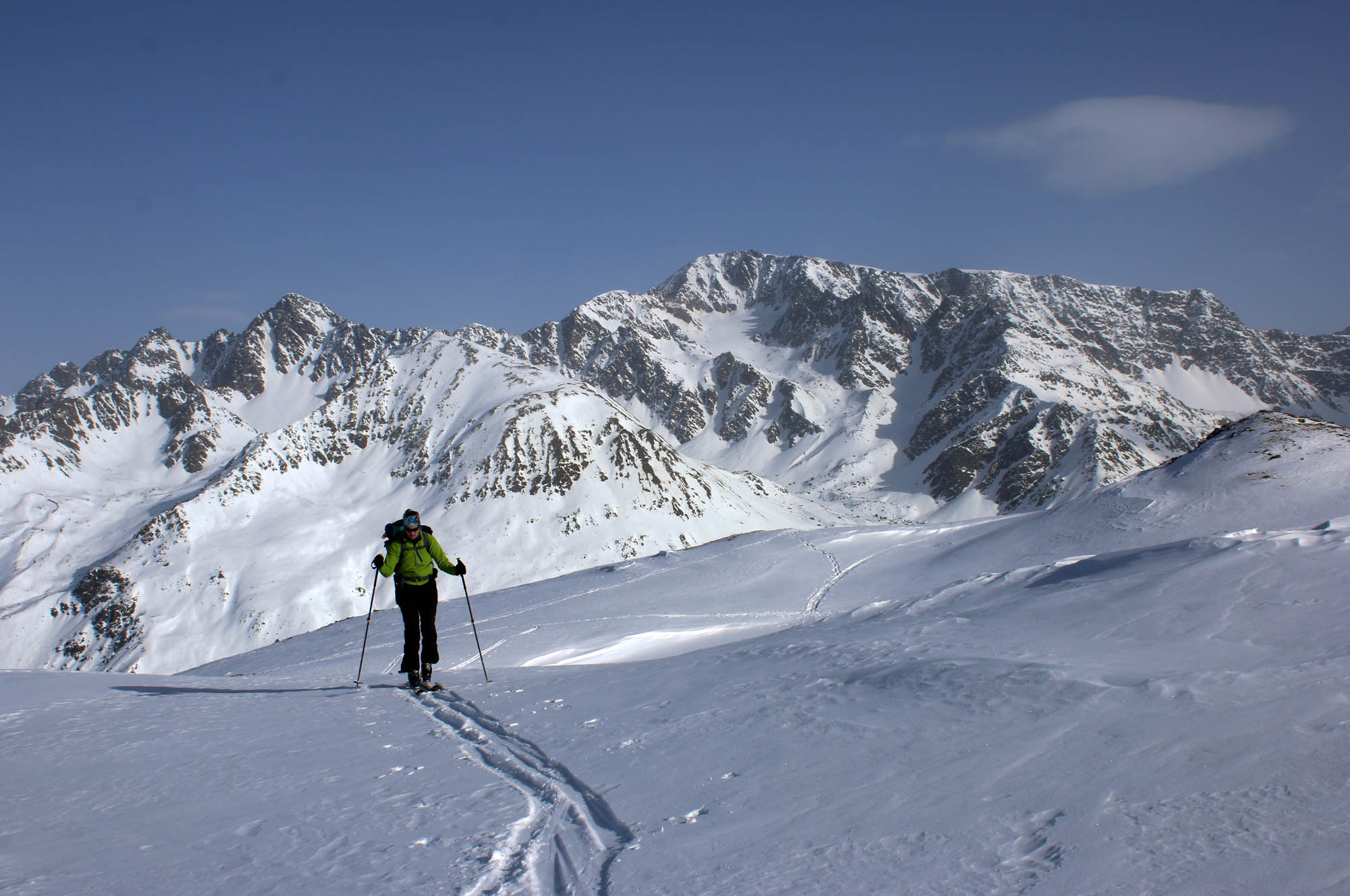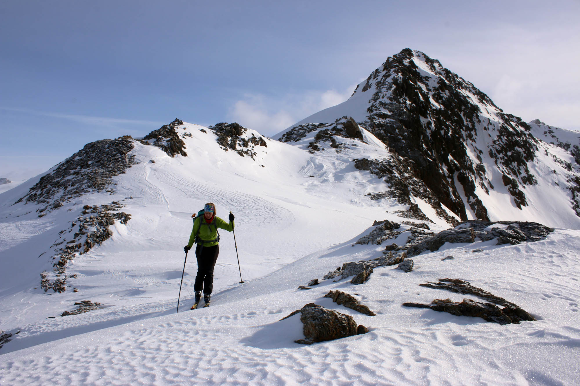 Tourenverhältnisse: Im Langtauferer Tal hat es genug Schnee. Ab 2500 m muss man aber gut auf (teils verdeckte) Felsen achten. Schneequalitätt insgesamt eher mäßig: Tragender und nicht tragender Windharsch, sowie teils noch gut zu fahrender alter Pulverschnee.