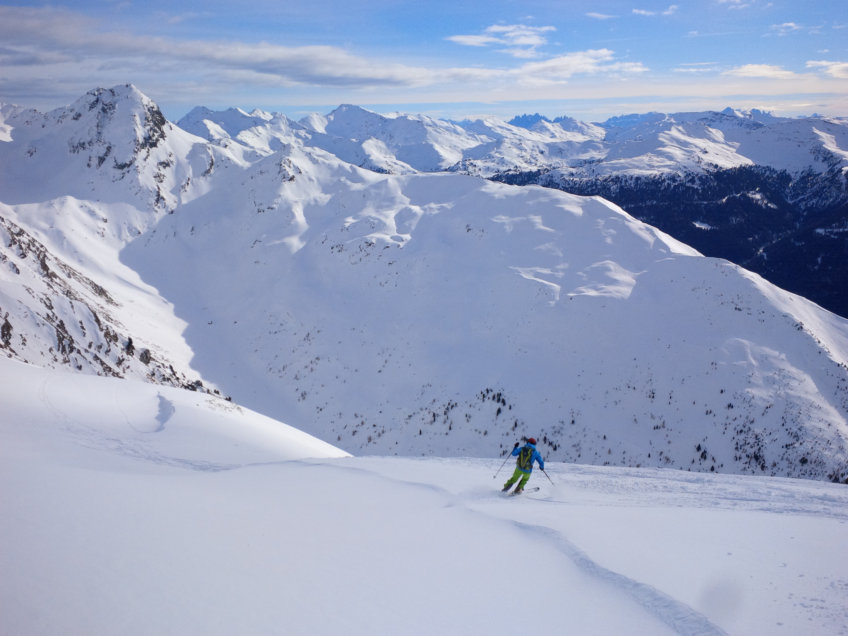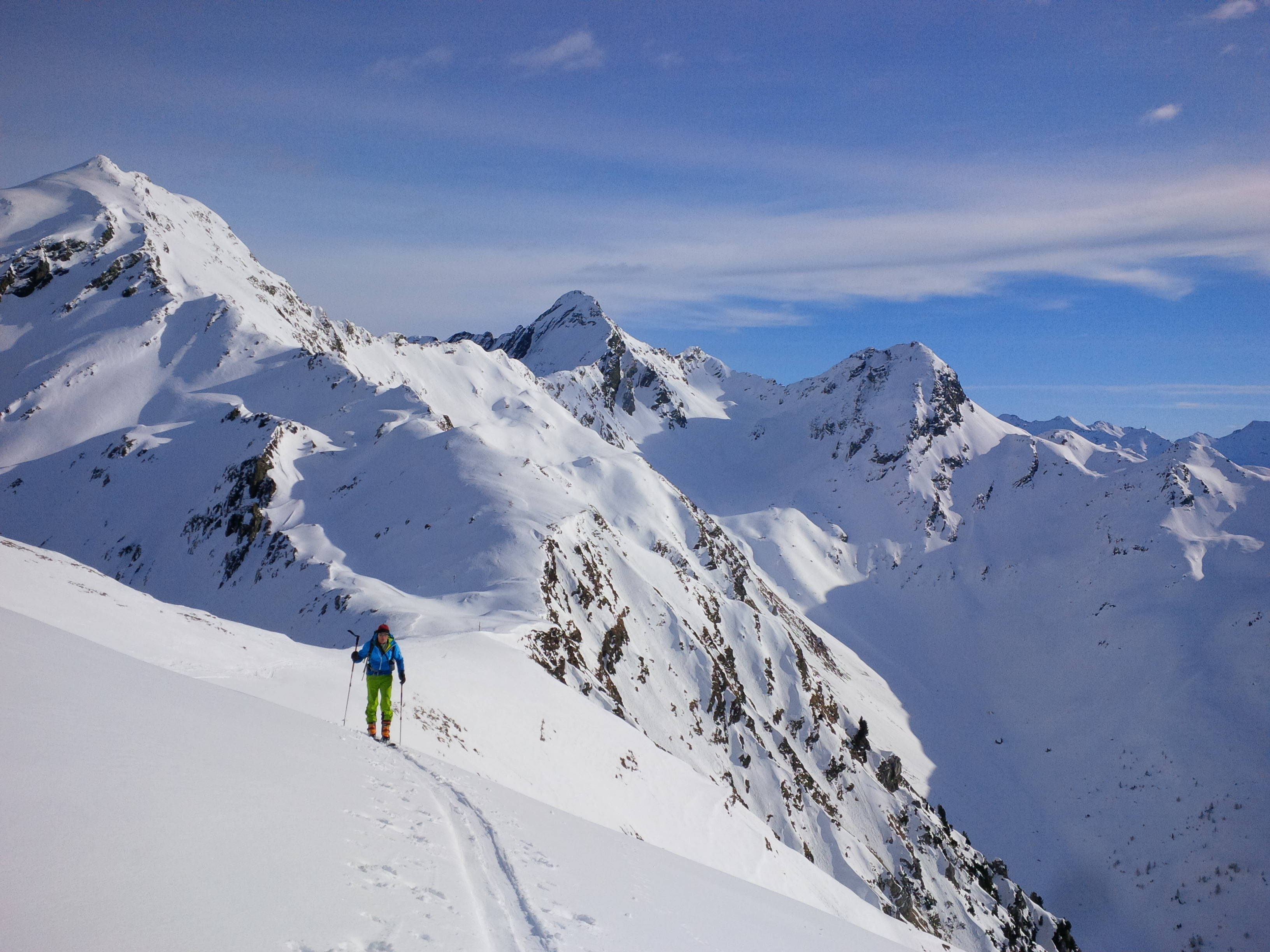 Sehr gute Verhältnisse. Im Aufstieg harter Bruch, der Schlimmstes für die Abfahrt befürchten ließ. Die Abfahrt war aber bis zum Parkplatz hervorragend - firnig im Südhang, pulvriger Triebschnee vom Joch bis zum Talboden, hier zunehmend Deckel, aber sehr gut befahrbar. Unten weich/sulzig - alles in allem eine hervorragende Abfahrt für die warmen Temperaturen!