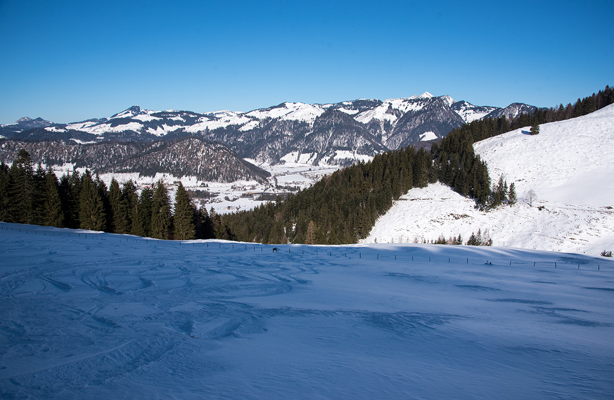 Abfahrt ansonsten oft noch mit schönem Pulverschnee, aber auch schon reichlich Spuren. Fast immer muss man aber auf der Hut sein und mit Feindkontakt, Felsen, Löchern und anderen Hindernissen rechnen. Sehr gut gingen die Hänge oberhalb und unterhalb der Hageralm (mit Zusatzanstieg) und die flachen Abschnitte im unteren Teil und sogar Richtung See. Das letzte Stück zum Forstweg hinunter nur zu Fuss und auch davor arg wenig Schnee und viel Vegetation. In der Sonne oben Sumpf bzw. am Nachmittag angefrorener Acker...