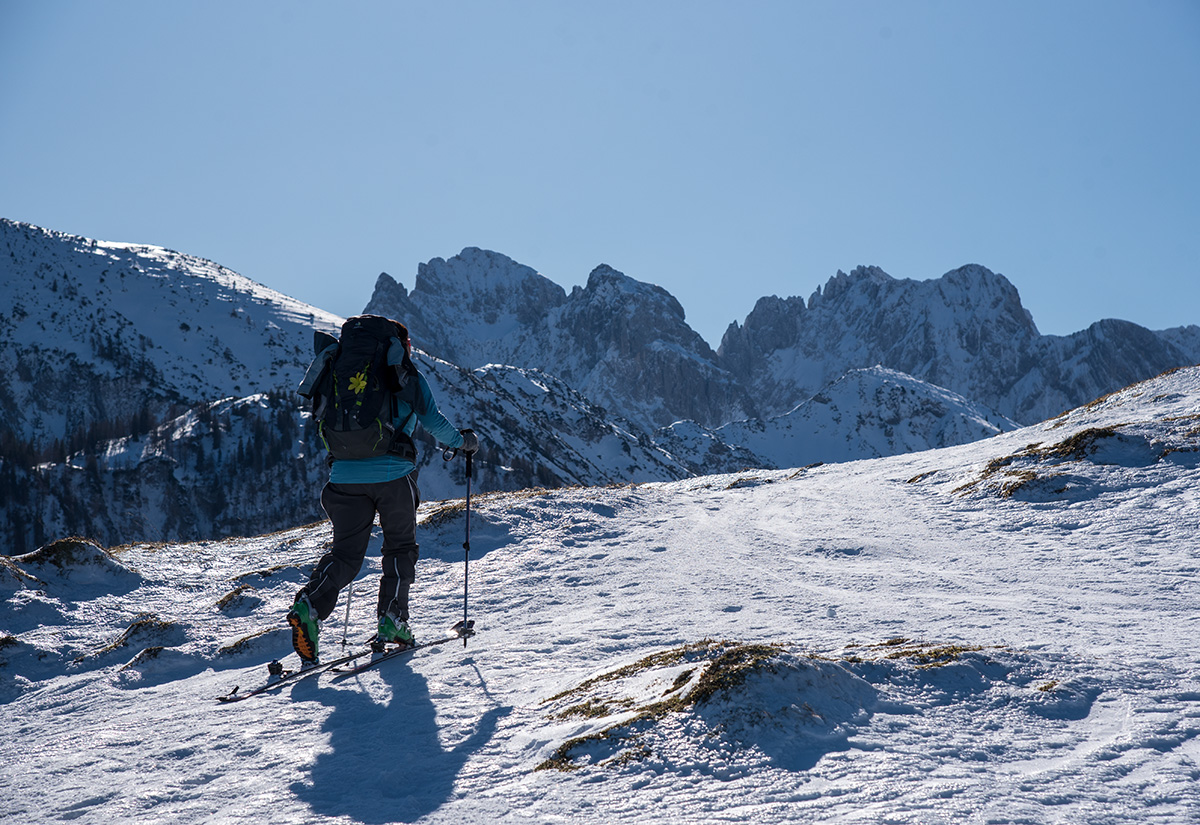 Tourenverhältnisse: Auf der Standardroute zum Gipfel mit kleinen Zugaben in der Abfahrt unterhalb der Hageralm sowie am Ende Richtung See. Insgesamt sehr bescheidene Schneelage, Forstwege aber sowohl im Aufstieg und bis auf offene Gatter und ganz wenige Steinchen auch in der Abfahrt noch sehr gut befahrbar. Im Gelände haben Wind und im Gipfelhang auch die Sonne ihre Spuren hinterlassen.