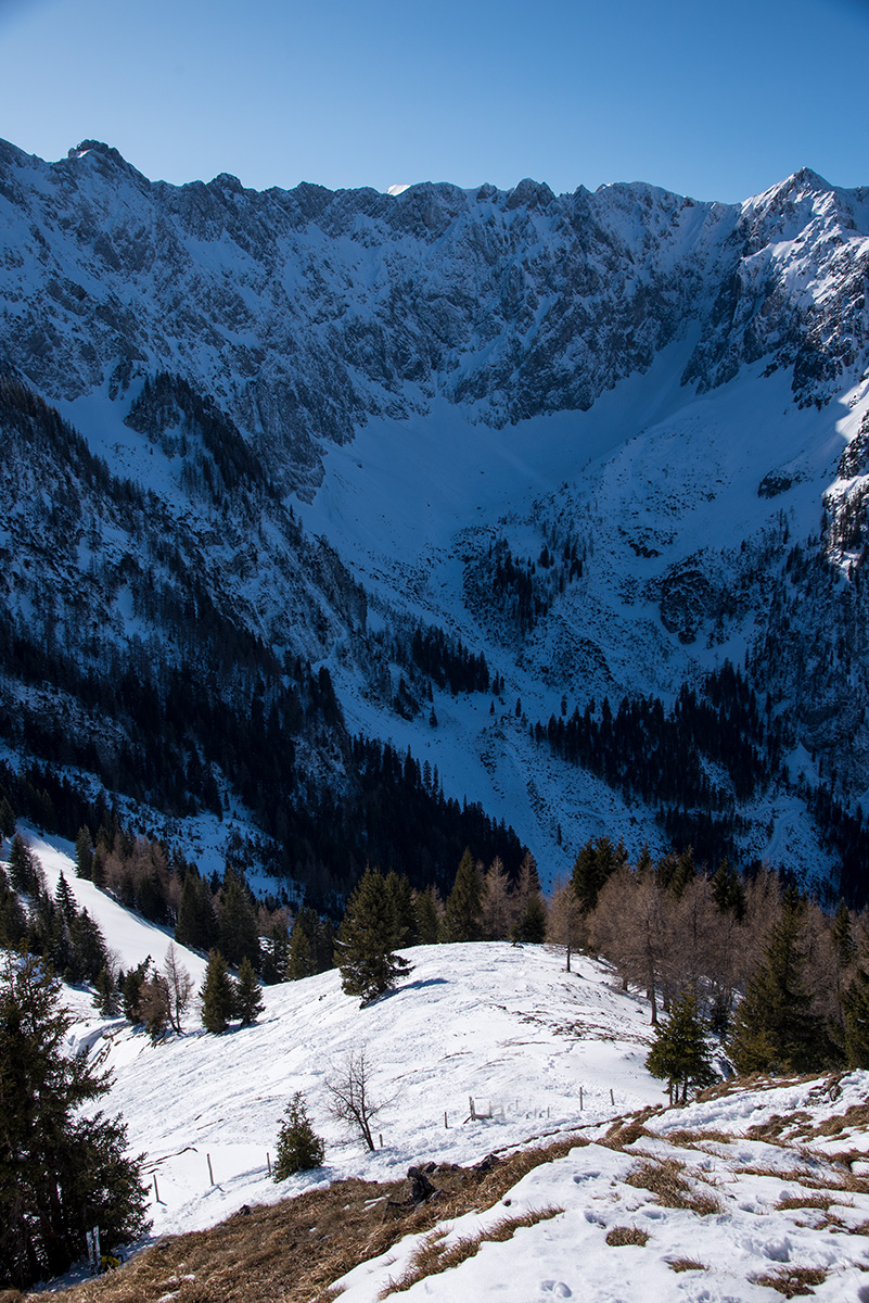 Gefahreneinschätzung: Sehr wenig Schnee. Sonnseitig schon viel ausgeapert bzw. abgerutscht. Statt Lawinen drohen eher kaputte Ski oder bei schlechter Routenwahl und mit etwas Pech harte Einschläge...
