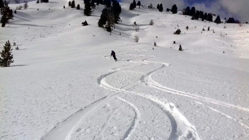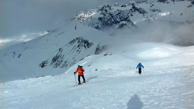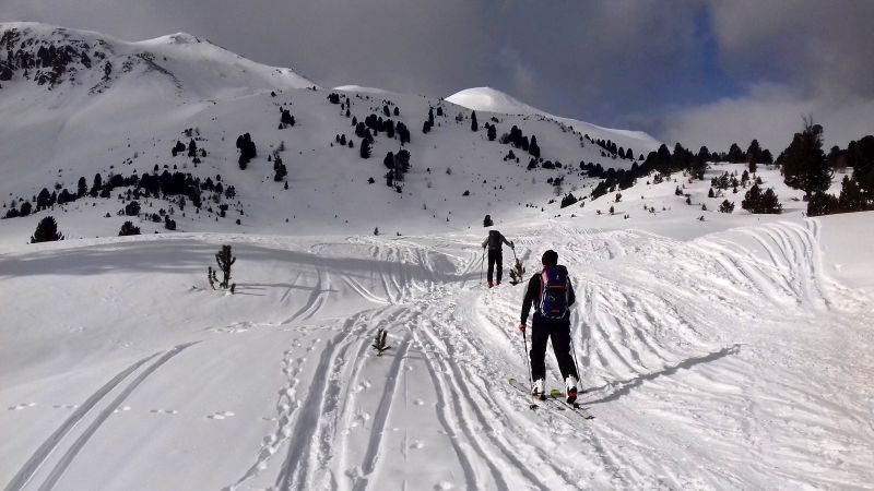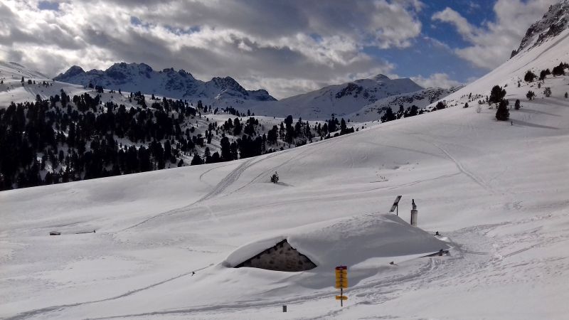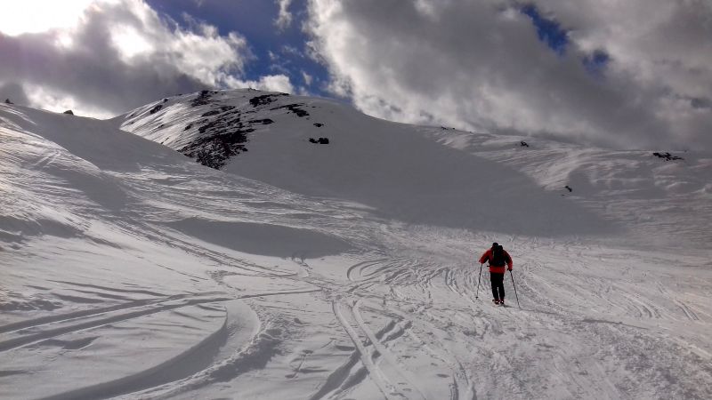 Tourenverhältnisse: Start um 9:30 Uhr bei 0°C, windstill mit einem Mix aus Sonne und Wolken. Stärker Wind nur im Gipfelbereich, ansonsten war der Aufstieg und die Abfahrt sehr angenehm. Als wir um 12 Uhr wieder am Ausgangspunkt waren hat sich das Wetter deutlich verschlechtert mit einsetzendem Graupel und heftigen Windböen. Die Tour ist pistenmäßig eingefahren. Für Montag waren relativ viele Tourengeher (geführte Gruppen) unterwegs.