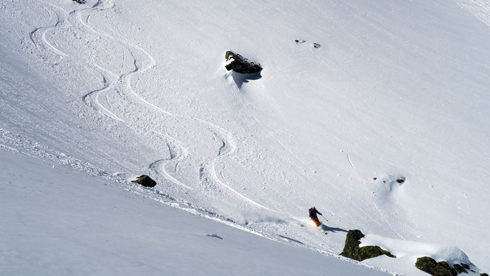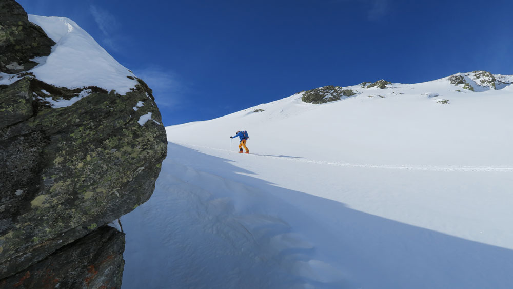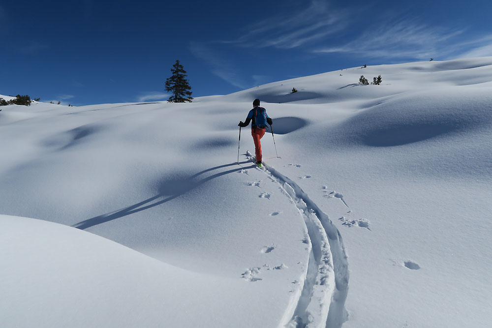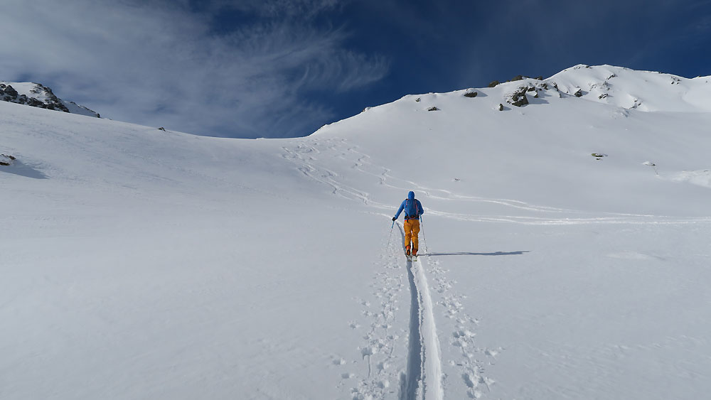 In dieser Gegend hat es 15 bis 20 cm Neuschnee auf einer gut gesetzten Unterlage. Der Wind kann hier nicht ganz so stark gewesen sein als in den Bayerischen Alpen. Es gab in exponierten Lagen durchaus Windzeichen, aber überwiegend haben wir auf unserer Route besten Pulverschnee vorgefunden, der im laufe des Tages in der Sonne schon ein bisschen feucht wurde, aber noch bestens zu fahren war. In den schattseitigen Lagen bleib es bis in den Nachmittag pulvrig.
