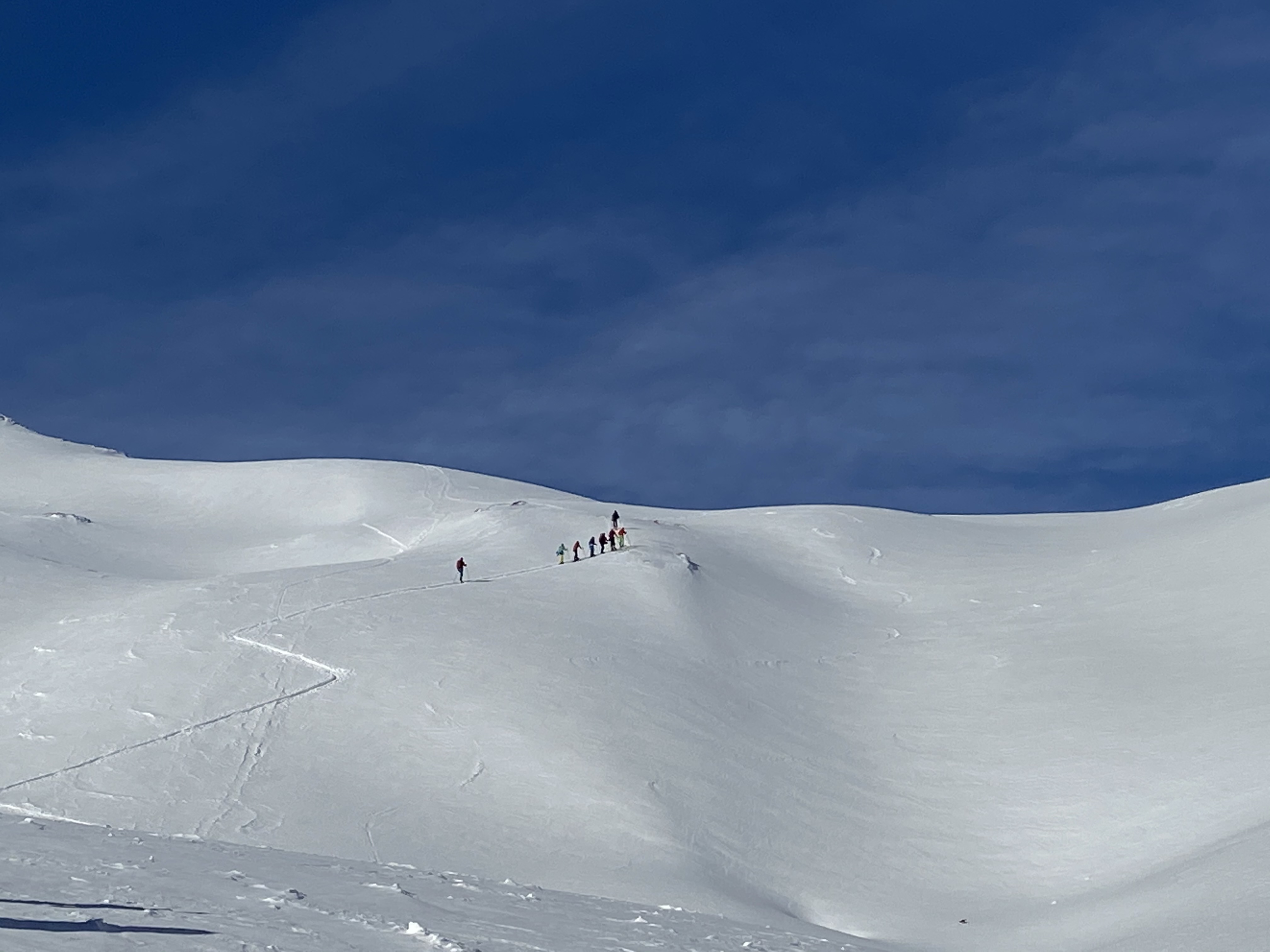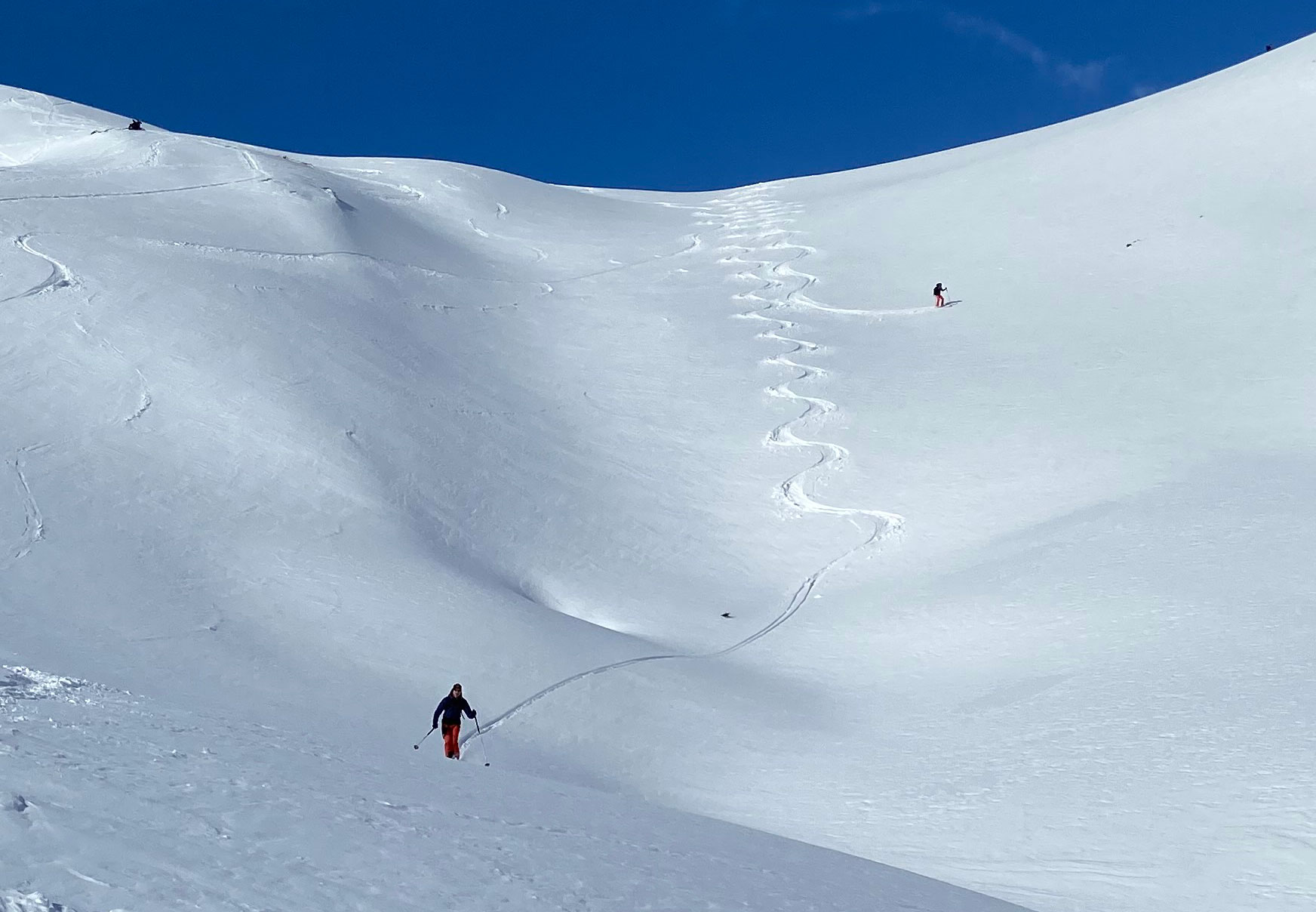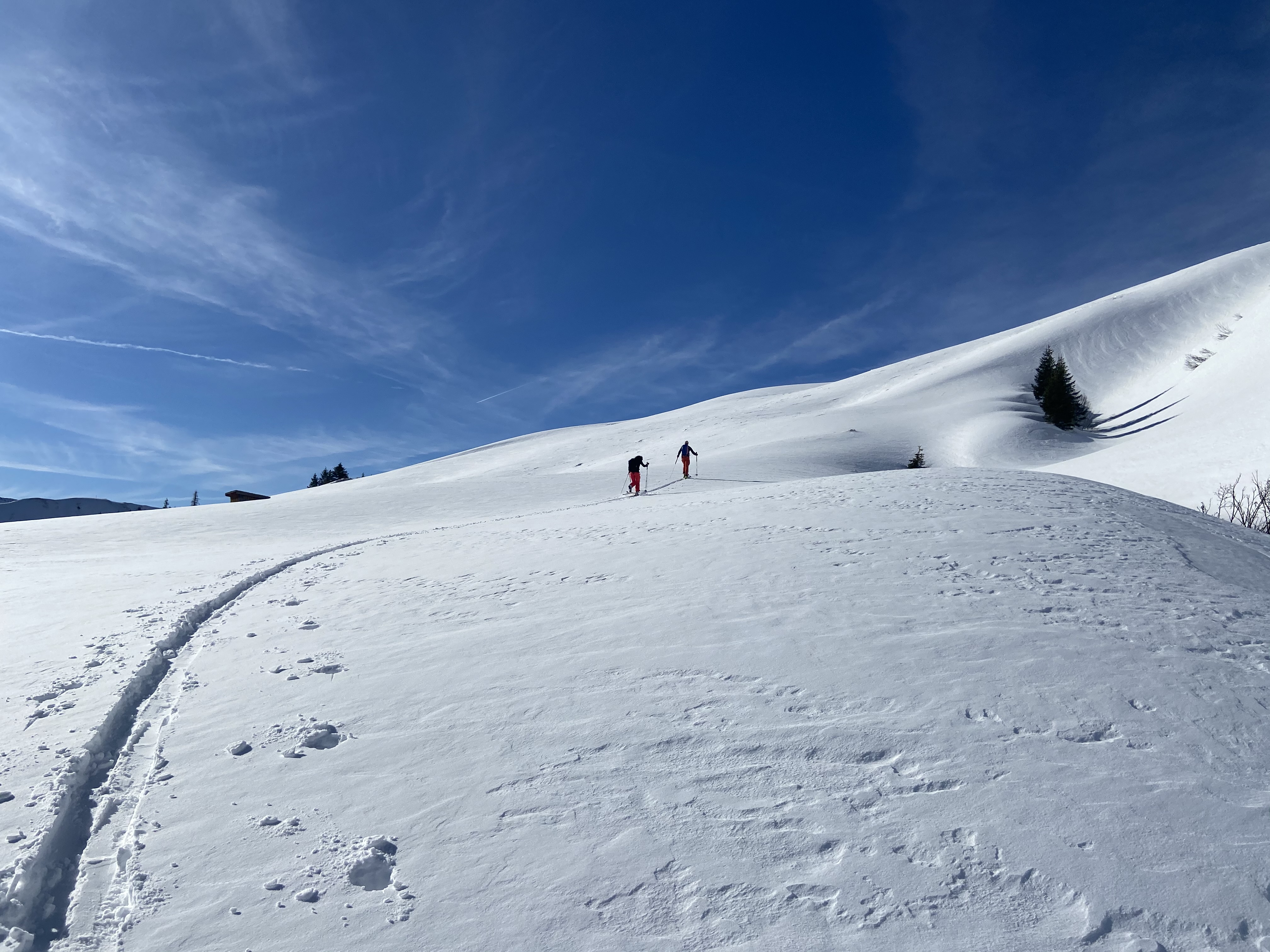Tourenverhältnisse: Perfekt! Auf dieser Route auch im Waldbereich ausreichend Schnee. Oben waren alle alten Spuren wieder zugeweht, so dass man fast jungfräuliche Hänge vor sich hatte. Oben schöner, ganz leicht windgeprägter Pulverschnee, unten im Waldbereich leicht sulzige Piste - auch sehr nett zu fahren. Wind heute nur am Gipfel, ansonsten mild und windstill.