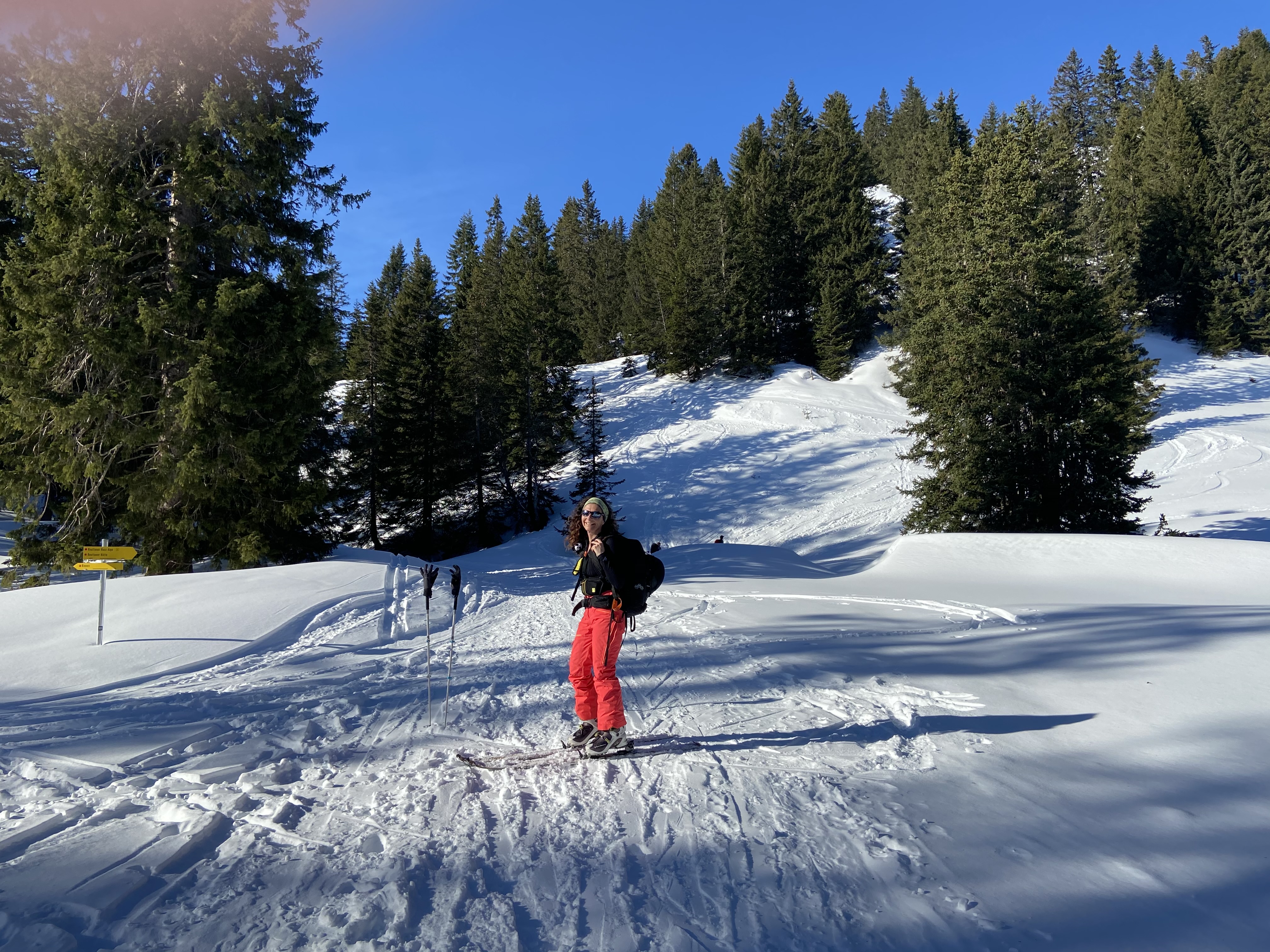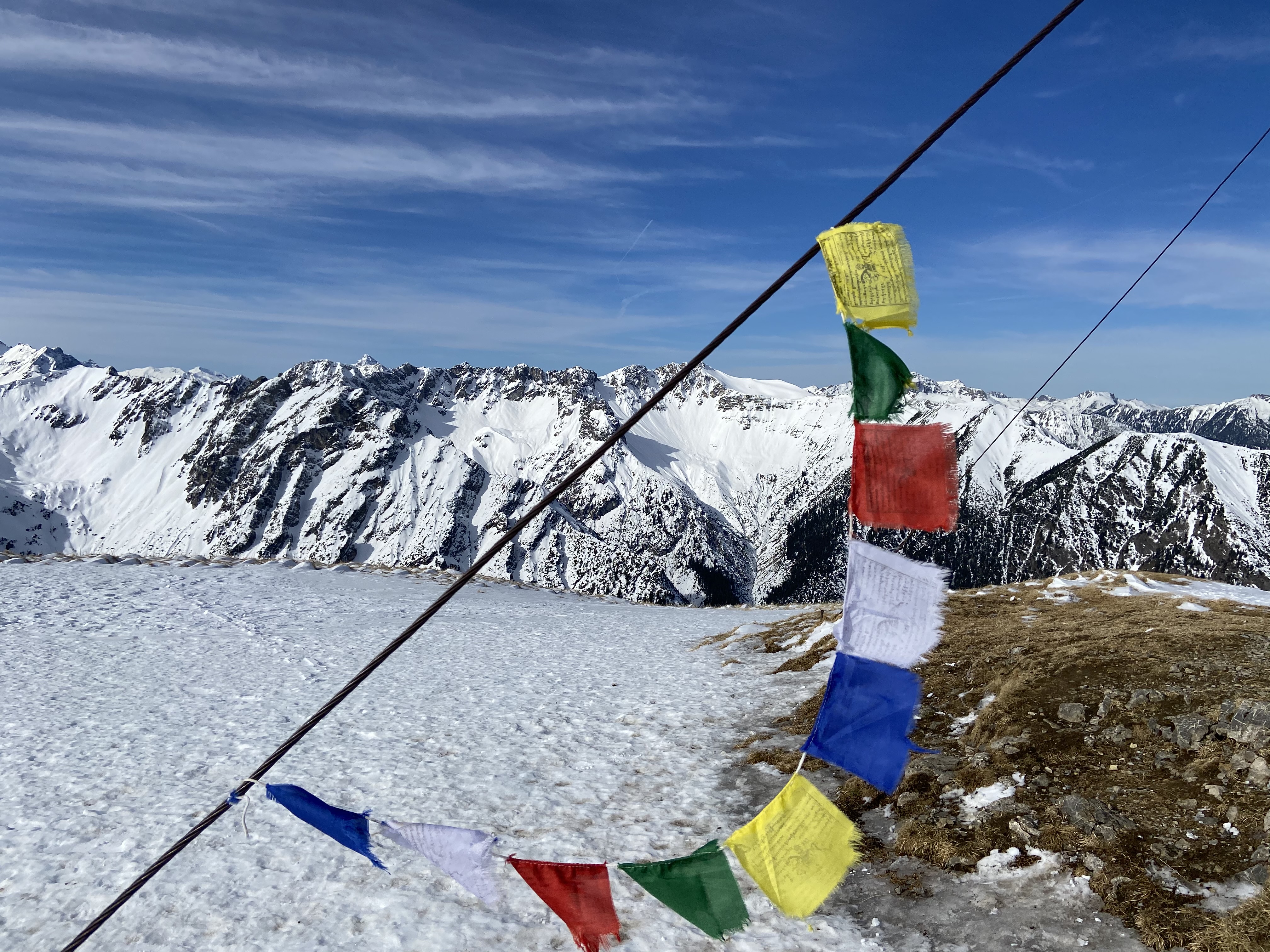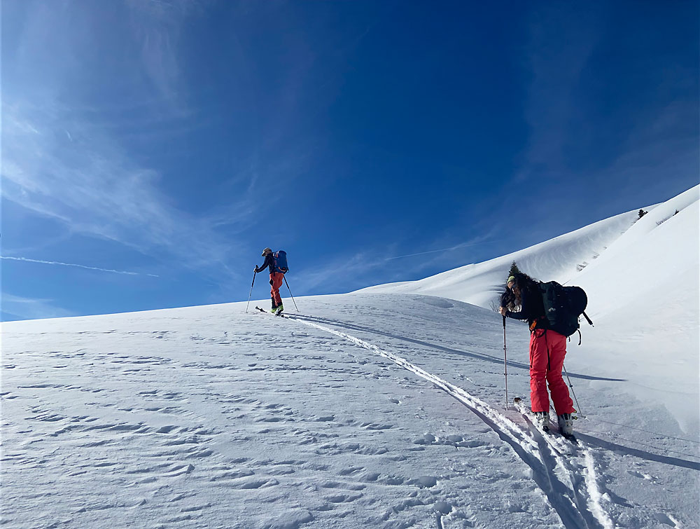Tourenverhältnisse: Perfekt! Auf dieser Route auch im Waldbereich ausreichend Schnee. Oben waren alle alten Spuren wieder zugeweht, so dass man fast jungfräuliche Hänge vor sich hatte. Oben schöner, ganz leicht windgeprägter Pulverschnee, unten im Waldbereich leicht sulzige Piste - auch sehr nett zu fahren. Wind heute nur am Gipfel, ansonsten mild und windstill.