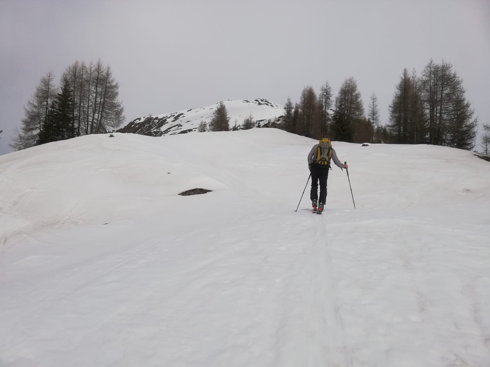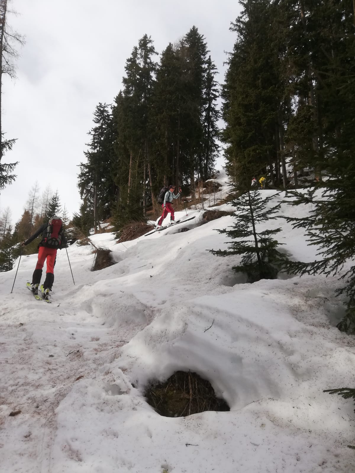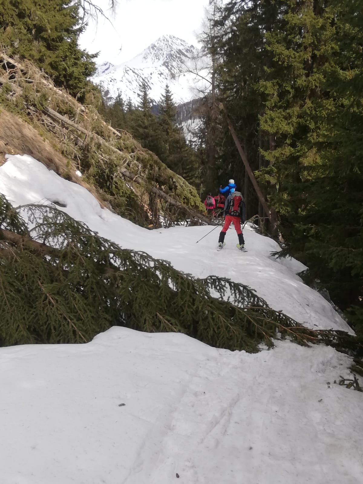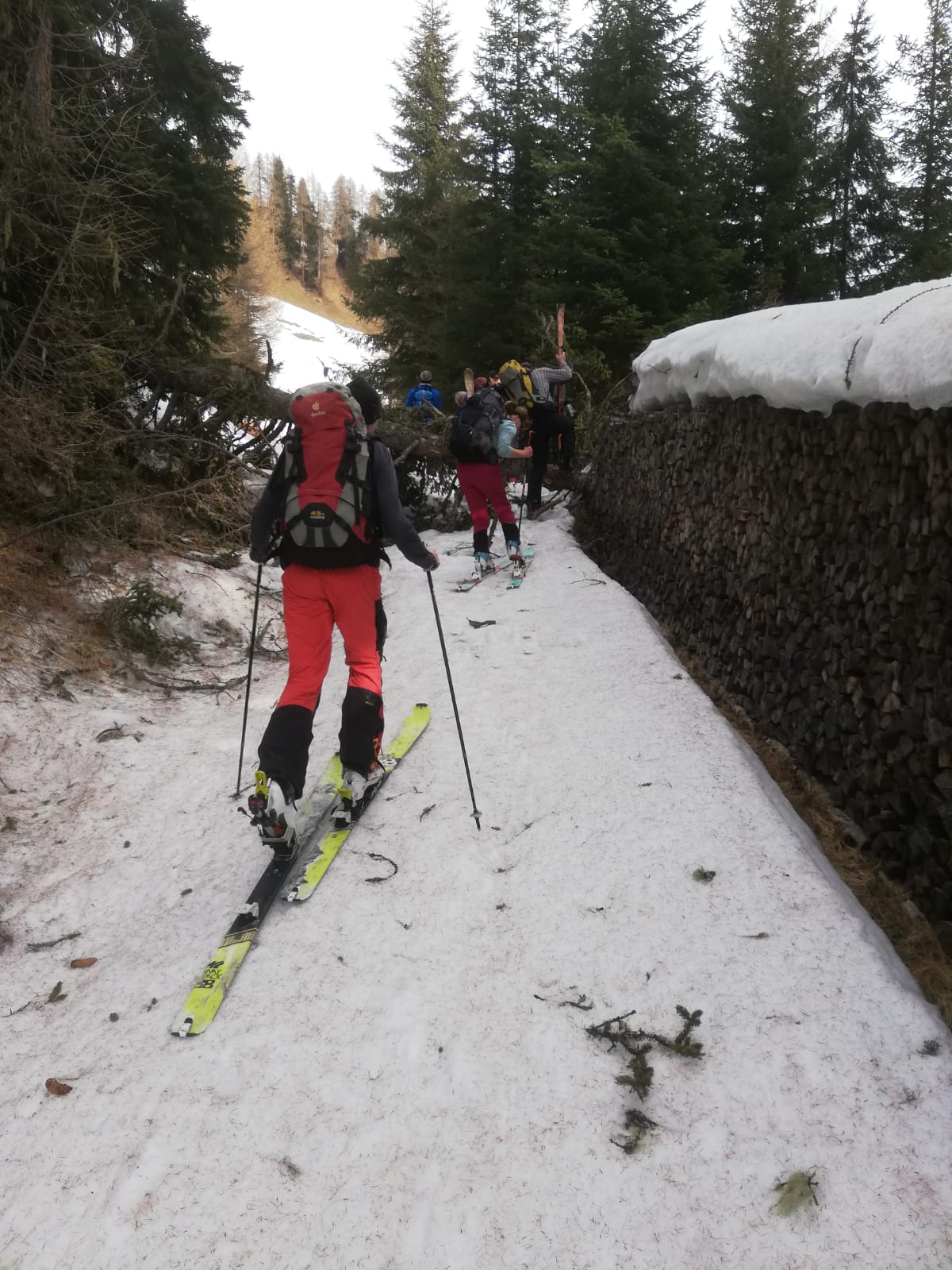 Tourenverhältnisse: Frühjahrsverhältnisse, Firn bis Sumpf. Schnee von Beginn an, also immerhin ohne Ski tragen. Im Wald und vorallem auf den Forststraßen viele umgestürzte Bäume. Wir mussten in der Abfahrt rund ein Dutzend über- oder unterqueren. Ab etwa 2050m freie Hänge. Schneemäßig oben firnähnlich, dann weich, dann schwer.