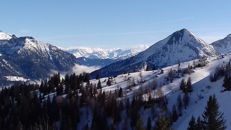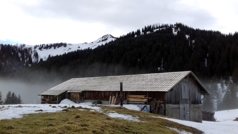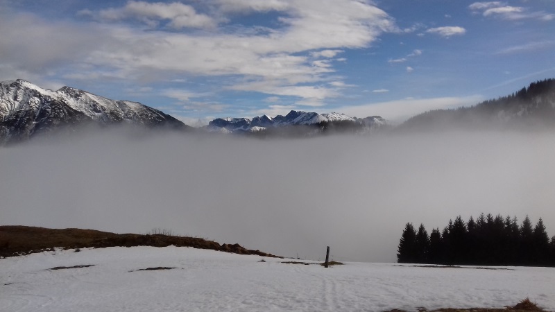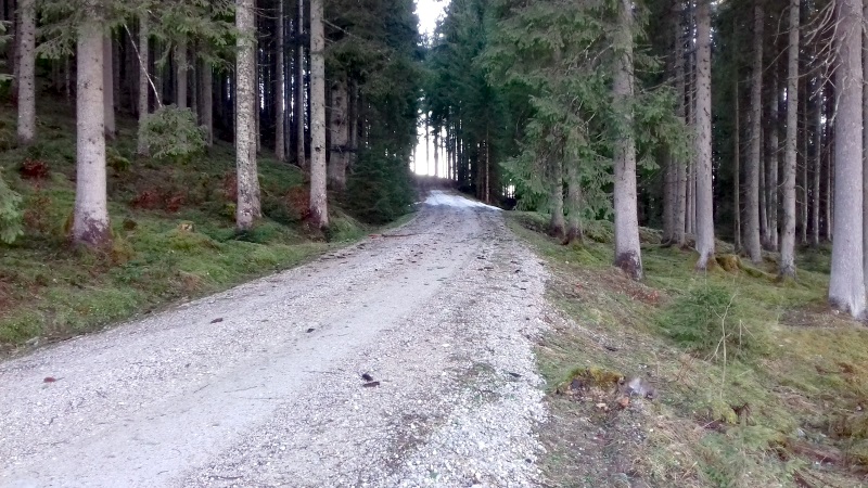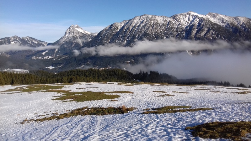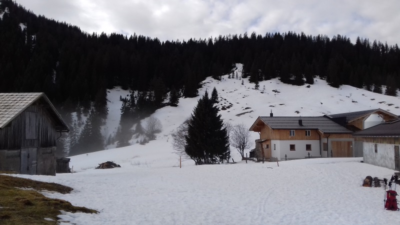 Tourenverhältnisse: Start um 12:15 Uhr bei Nieselregen am menschenleeren Parkplatz. Man kann mit Ski starten, die Forststraße hat aber sehr viele apere Passagen (wir sind gleich der Forststraße weiter gefolgt und nicht den Steig zur Falkenmoosalm hoch). Auch die Wiese zur Falkenmoos hat schon viele braune Flecken, man kommt aber noch ganz gut durch. Die Schneedecke ist nass aber gut verfestigt, man bricht nicht ein. Typische Spätfrühjahrsbedingungen. Ab 14 Uhr top Wetter! Aufgrund der vielen Tragepassagen derzeit nicht lohnend.