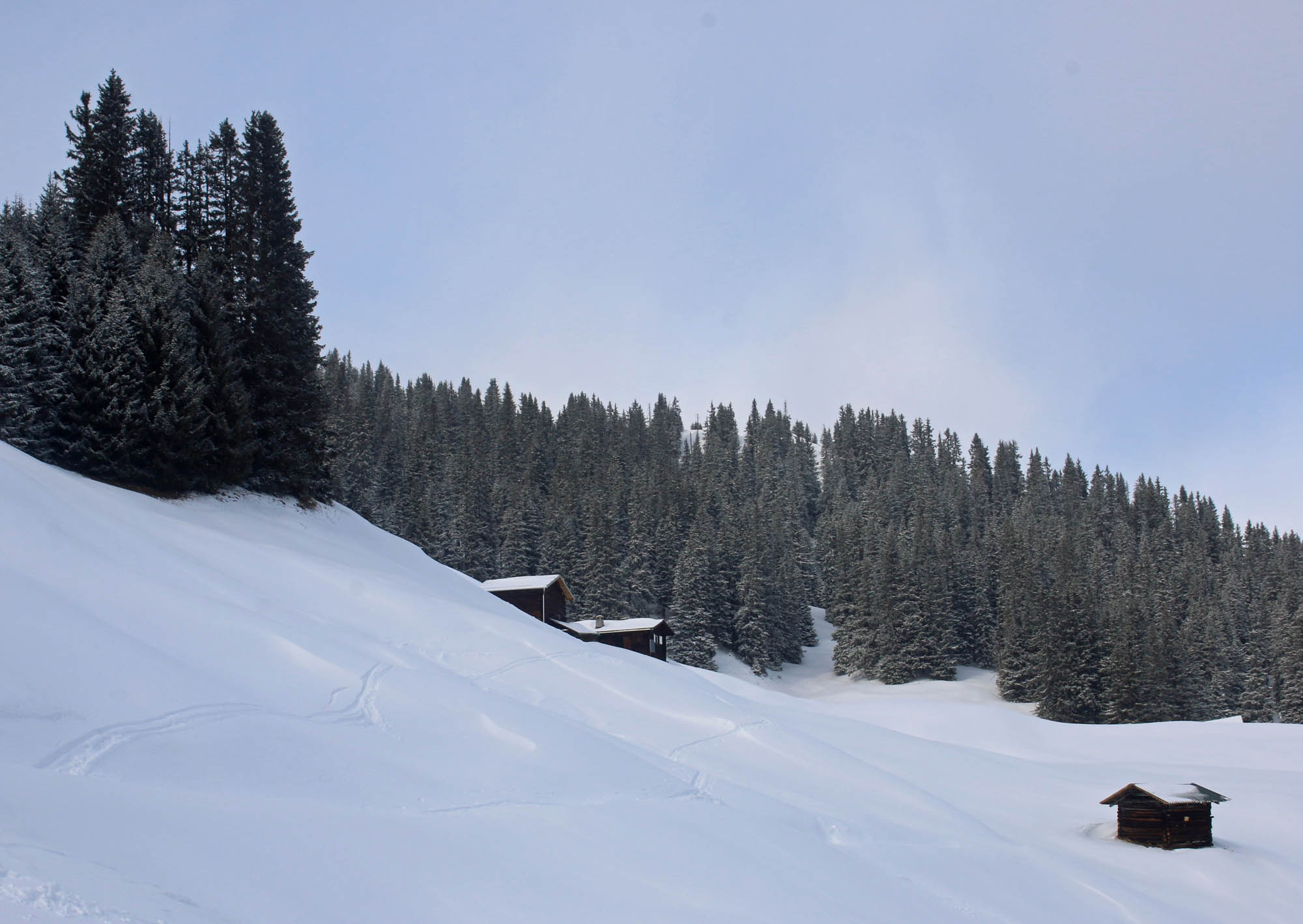 Tourenverhältnisse: Insgesamt auch hier eher wenig, aber ausreichend Schnee im Gebiet. Am Dienstag noch extrem hart gefrorene Unterlage - sogar nordseitig bis ca. 2700 m. Am Dienstag dann schöne Pulverschneeauflage von ca 15 cm.